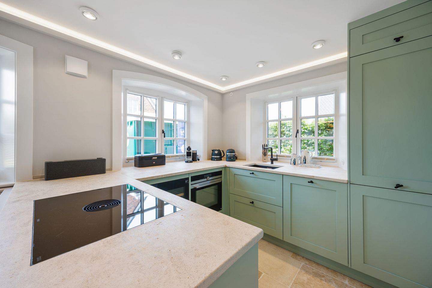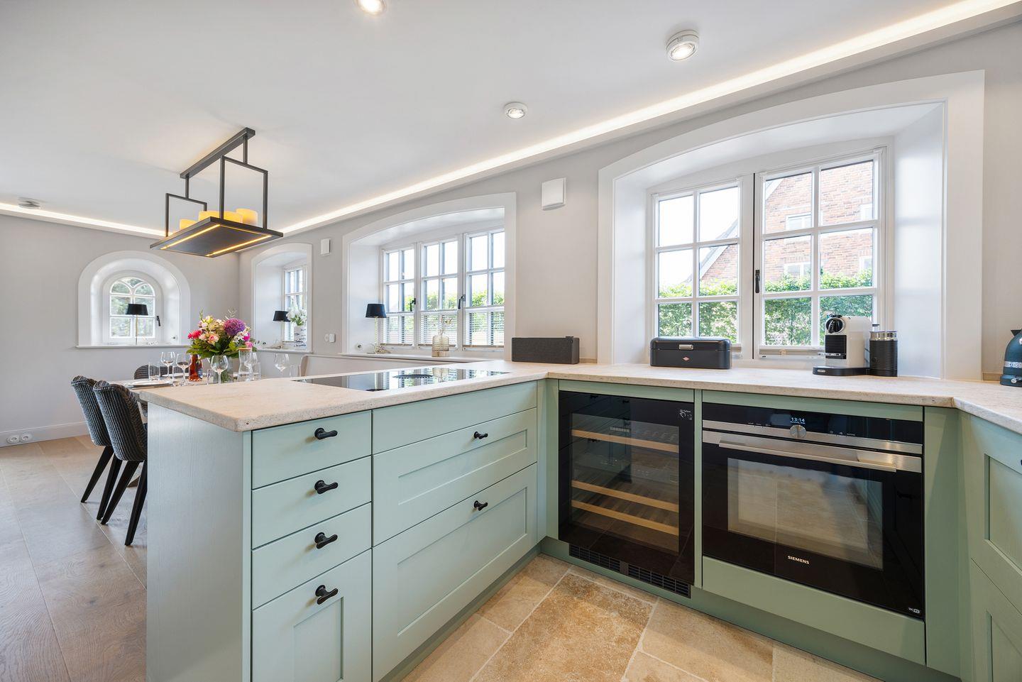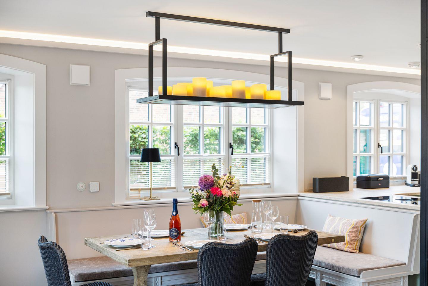 Die offene Küche ist mit hochwertigen Geräten von Miele und einem modernen BORA Kochfeld ausgestattet. Ein Dampfgarer und ein Weinkühlschrank sorgen für zusätzlichen Komfort, während die Moccamaster-Kaffeemaschine Ihnen den perfekten Start in den Tag ermöglicht. Am großzügigen Esstisch finden bis zu 6 Personen Platz – perfekt für gemeinsame Mahlzeiten und gesellige Abende.