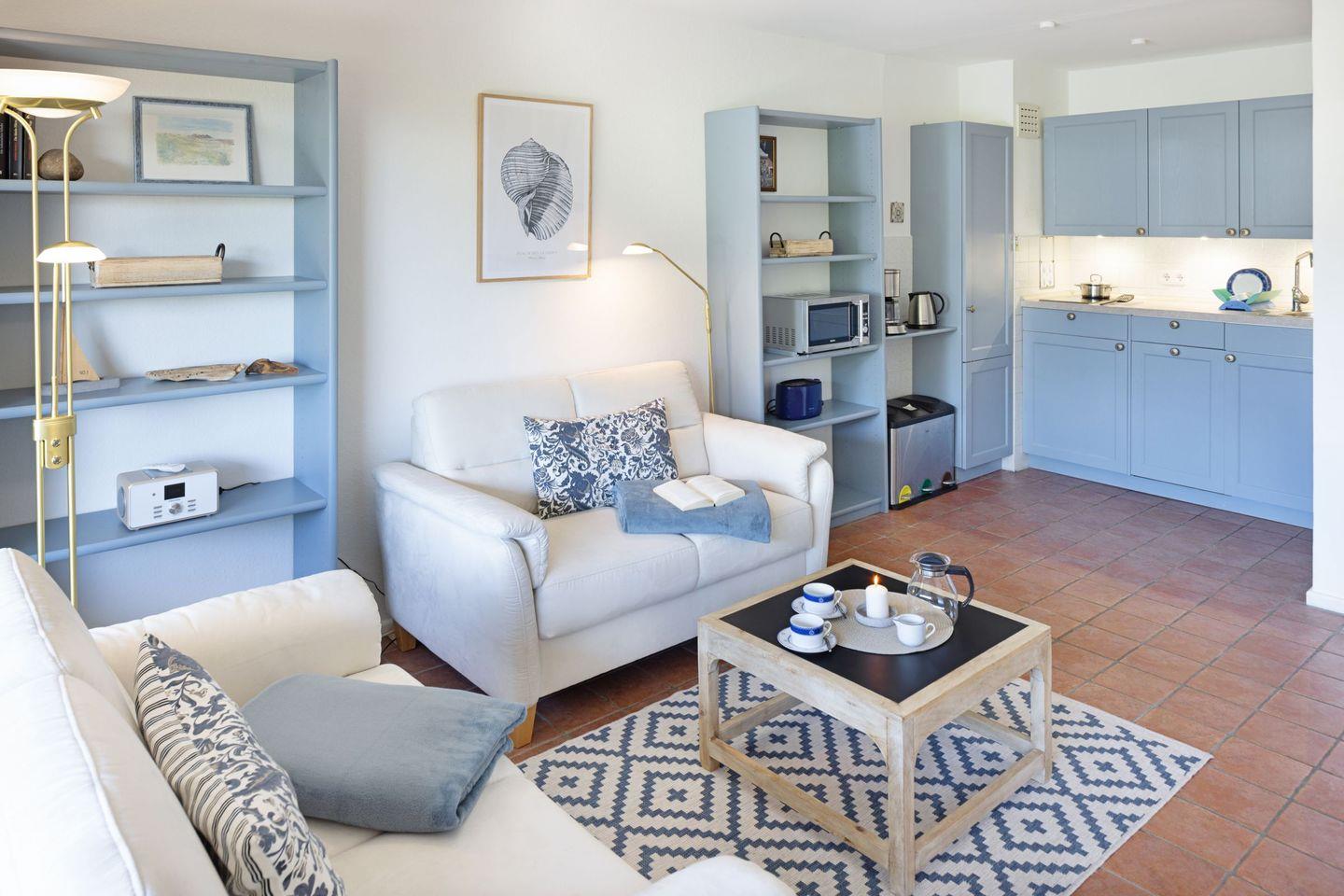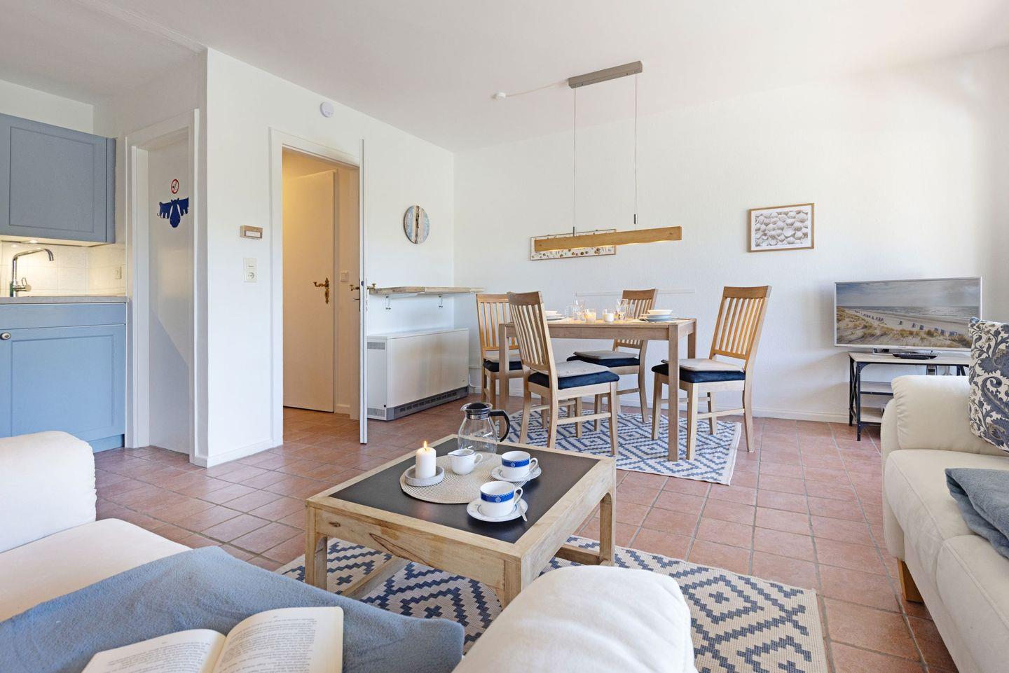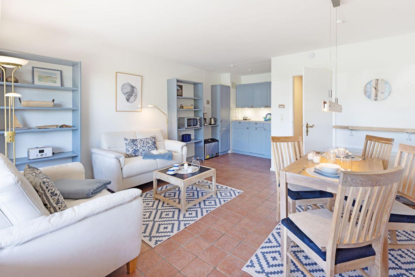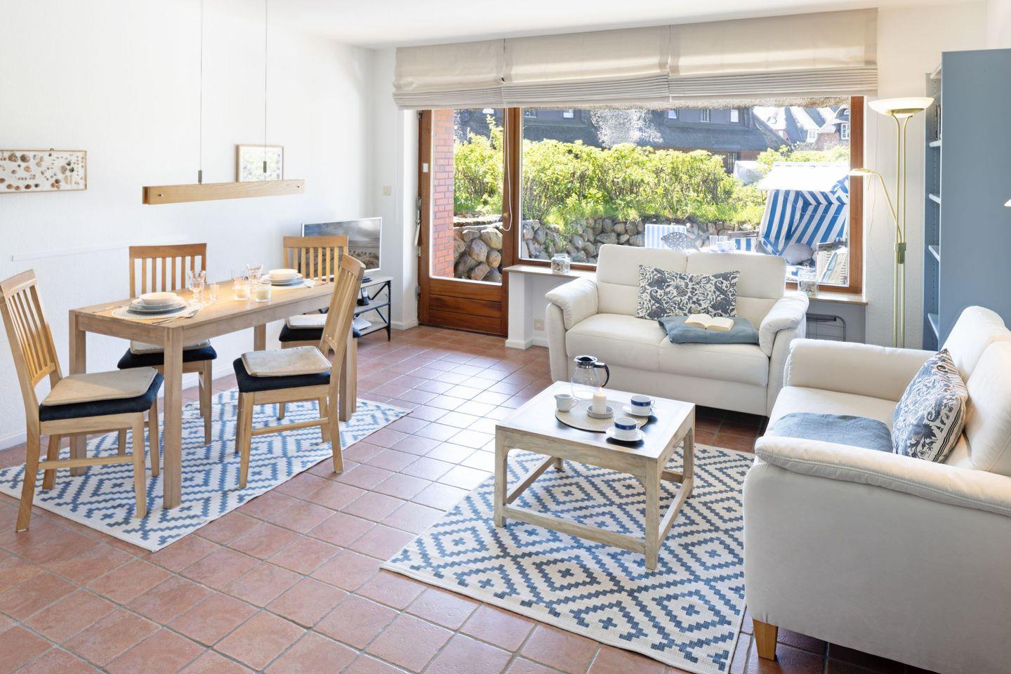 Das 35 m² große Appartement Nepomuk im Erdgeschoss überzeugt durch eine durchdachte Raumaufteilung und gemütliche Ausstattung. Der offene Wohn- und Essbereich ist mit zwei bequemen Sofas und einem großen Esstisch ausgestattet und bietet ausreichend Platz zum Entspannen. Von hier aus haben Sie direkten Zugang zur 20 m² großen Terrasse unter Reet, die mit Gartenmöbeln und einem Strandkorb ausgestattet ist. Grillen ist auf der Terrasse nur mit einem Elektrogrill erlaubt.