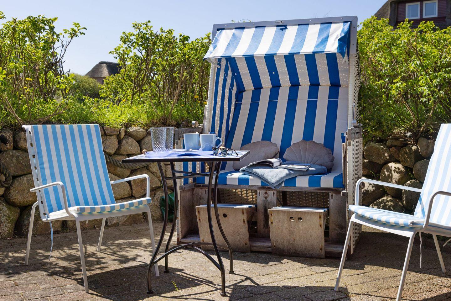 Ein Parkplatz direkt am Haus sorgt für bequeme Anreise. Gartenmöbel und Strandkorb stehen Ihnen saisonal zur Verfügung.