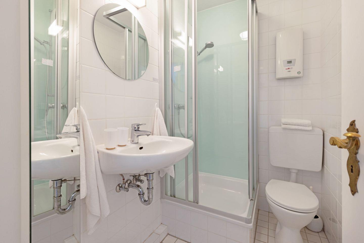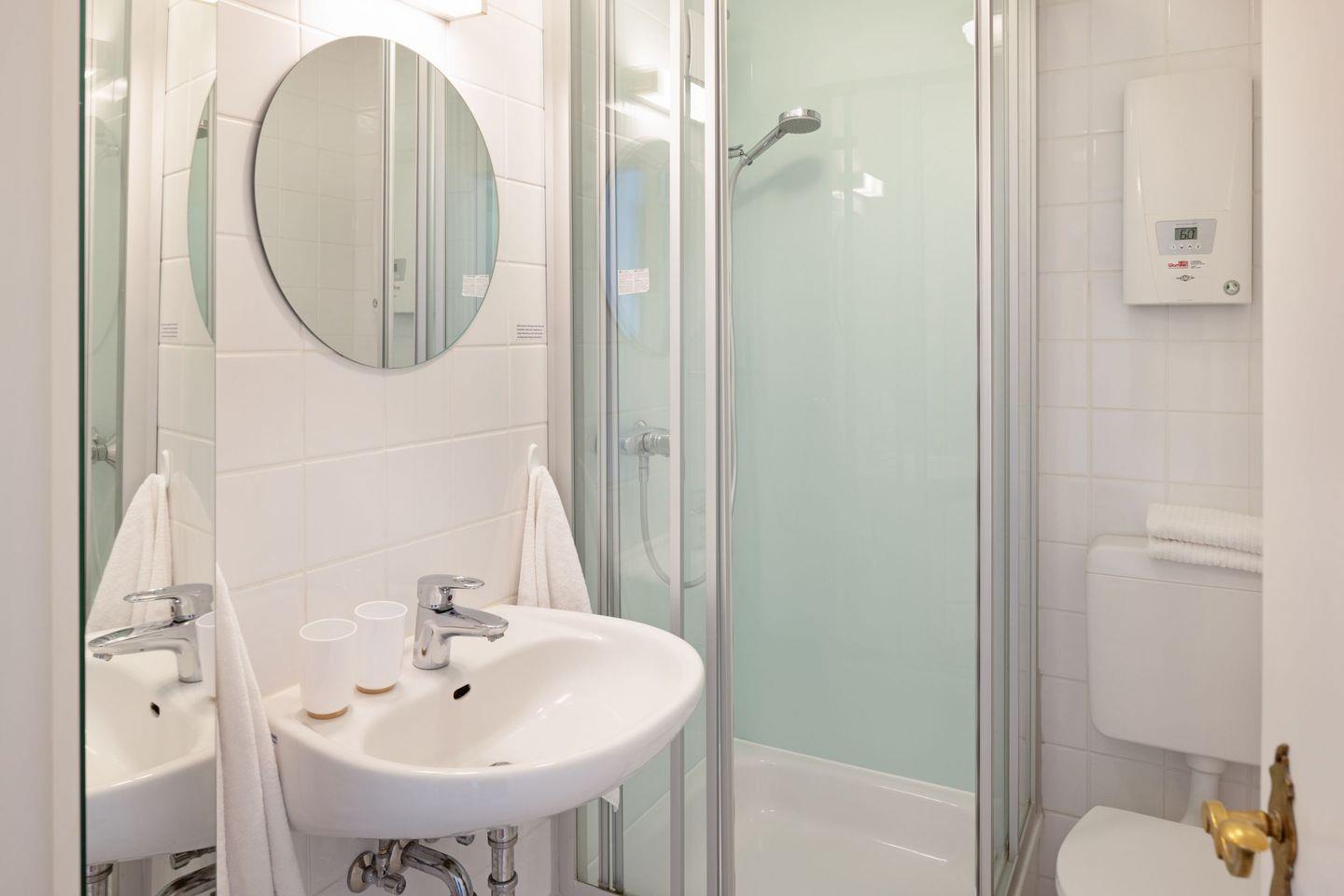 Das Badezimmer ist hell gestaltet und mit einer Dusche ausgestattet. Handtuchhalter und Fön sind vorhanden.