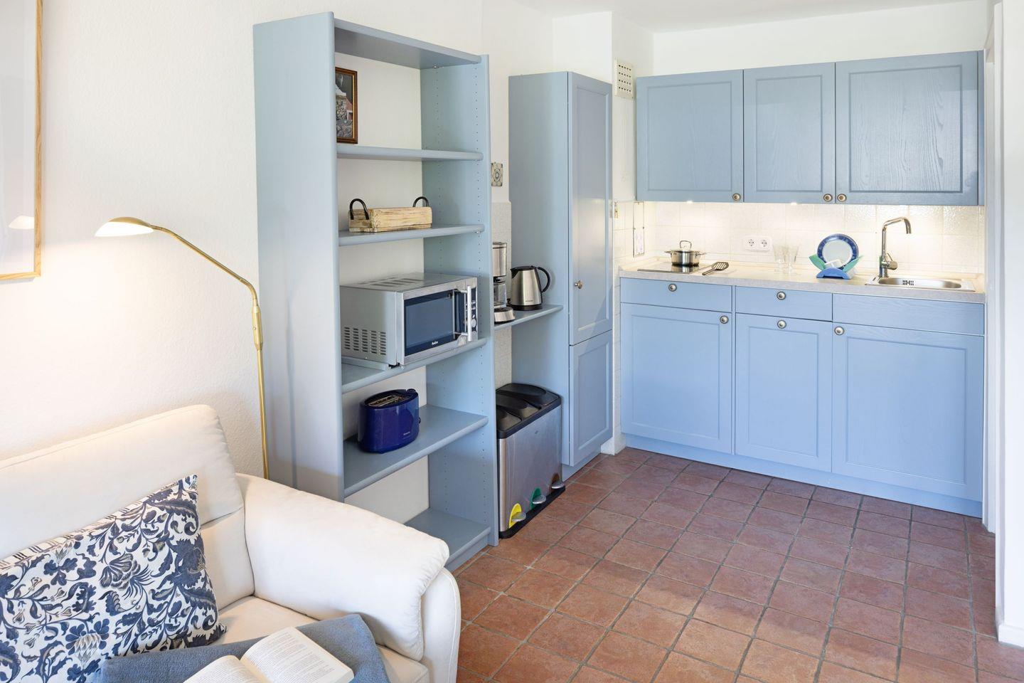 Die Küche ist funktional und kompakt gestaltet, aber voll ausgestattet, sodass alle wesentlichen Geräte zur Verfügung stehen. Sie fügt sich harmonisch in den offenen Wohnbereich ein und ermöglicht unkompliziertes Kochen während Ihres Aufenthalts.