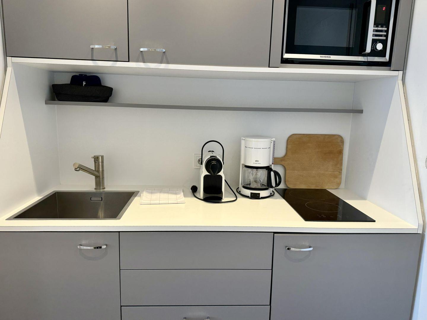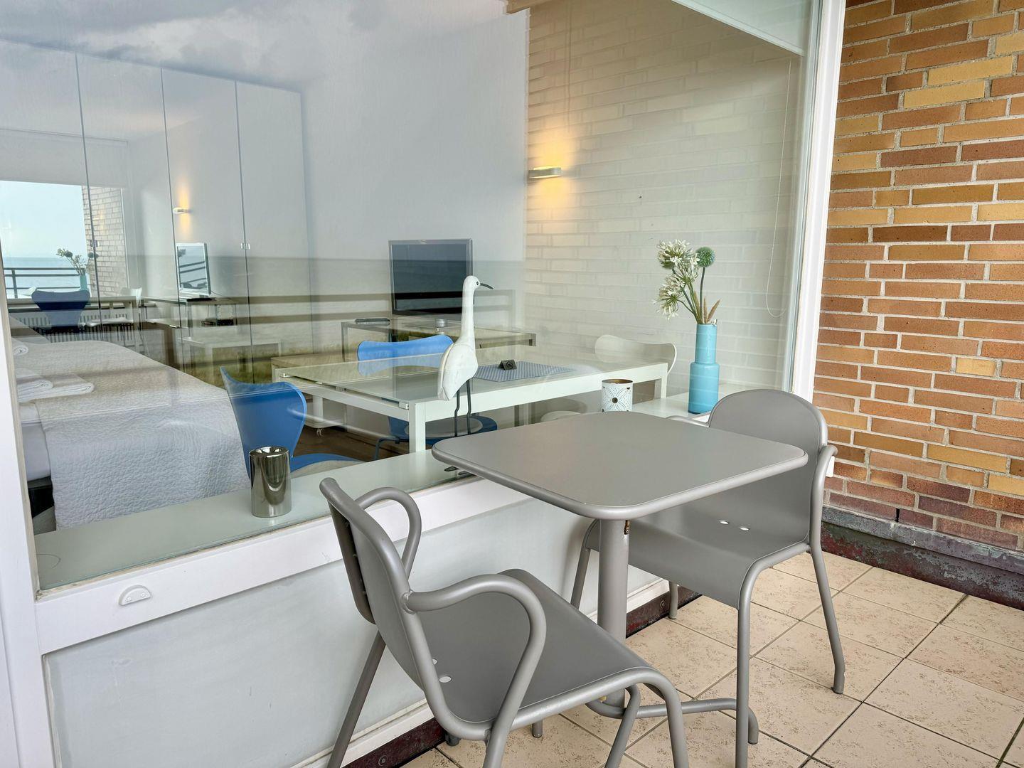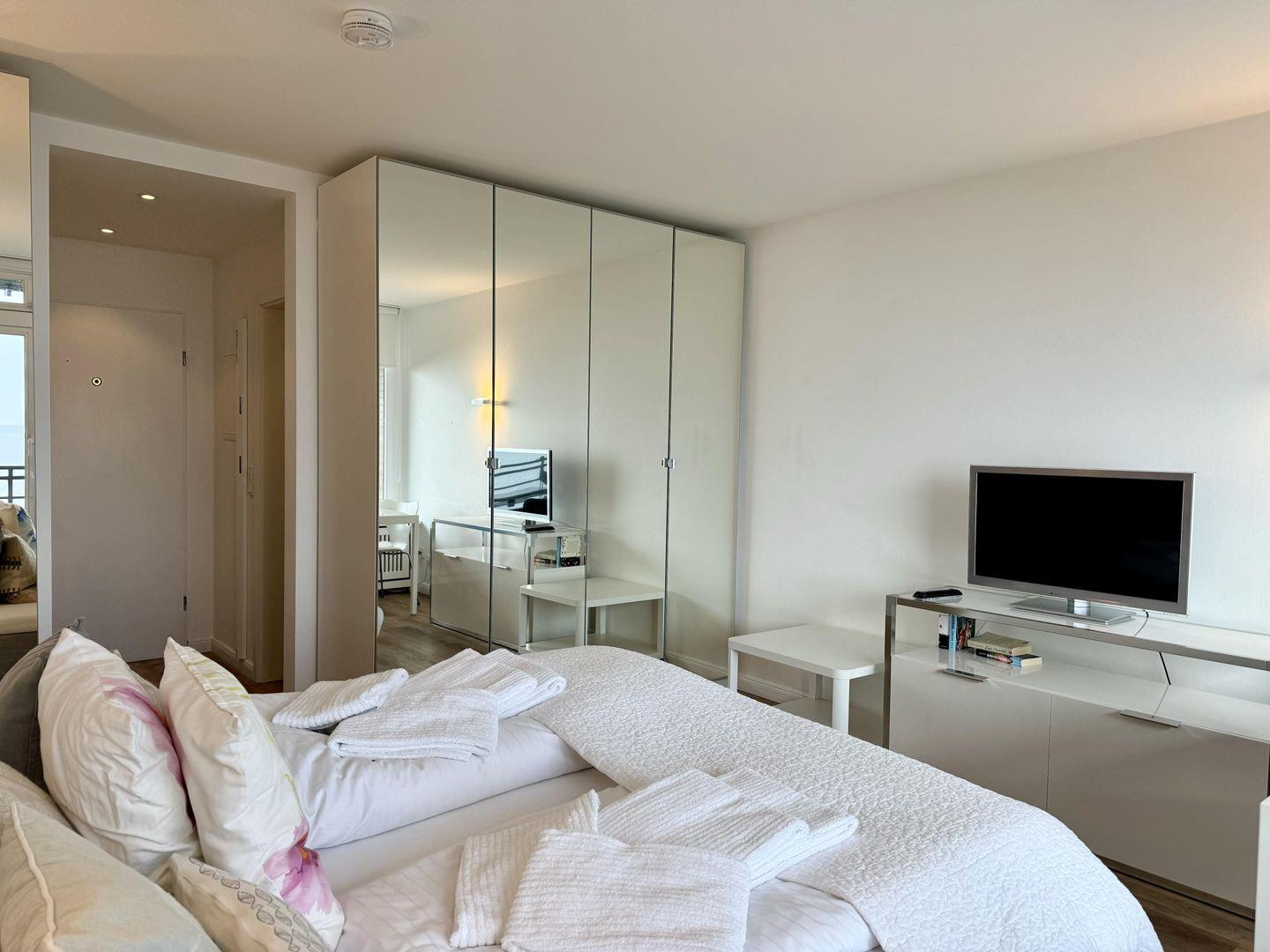 Modernes 1-Zimmer App. für 2 Pers. mit schönem Ostbalkon samt einzigartigem Panorama-Meerblick in unmittelbarer Strandlage. Inklusive WLAN sowie zugehörigem PKW-Stellplatz.