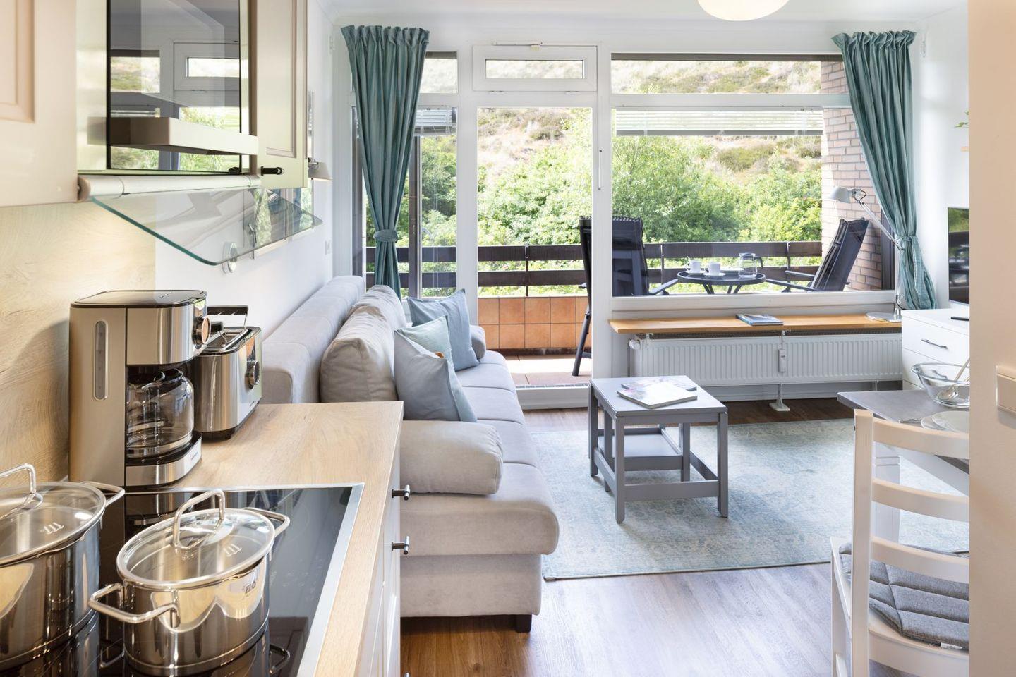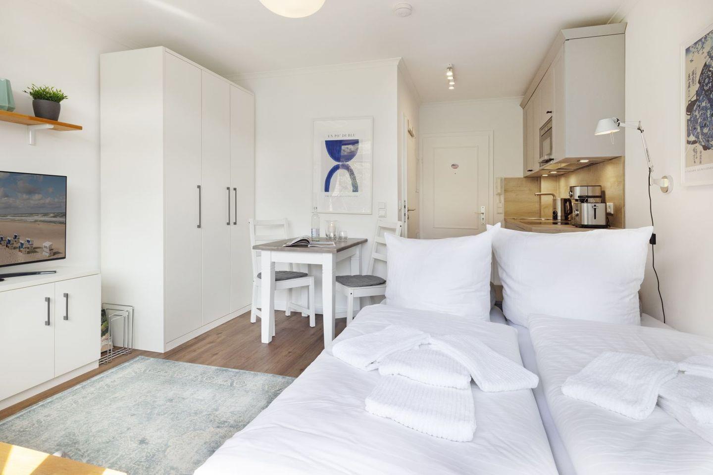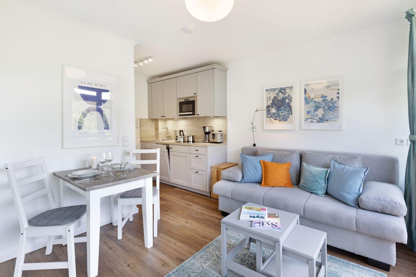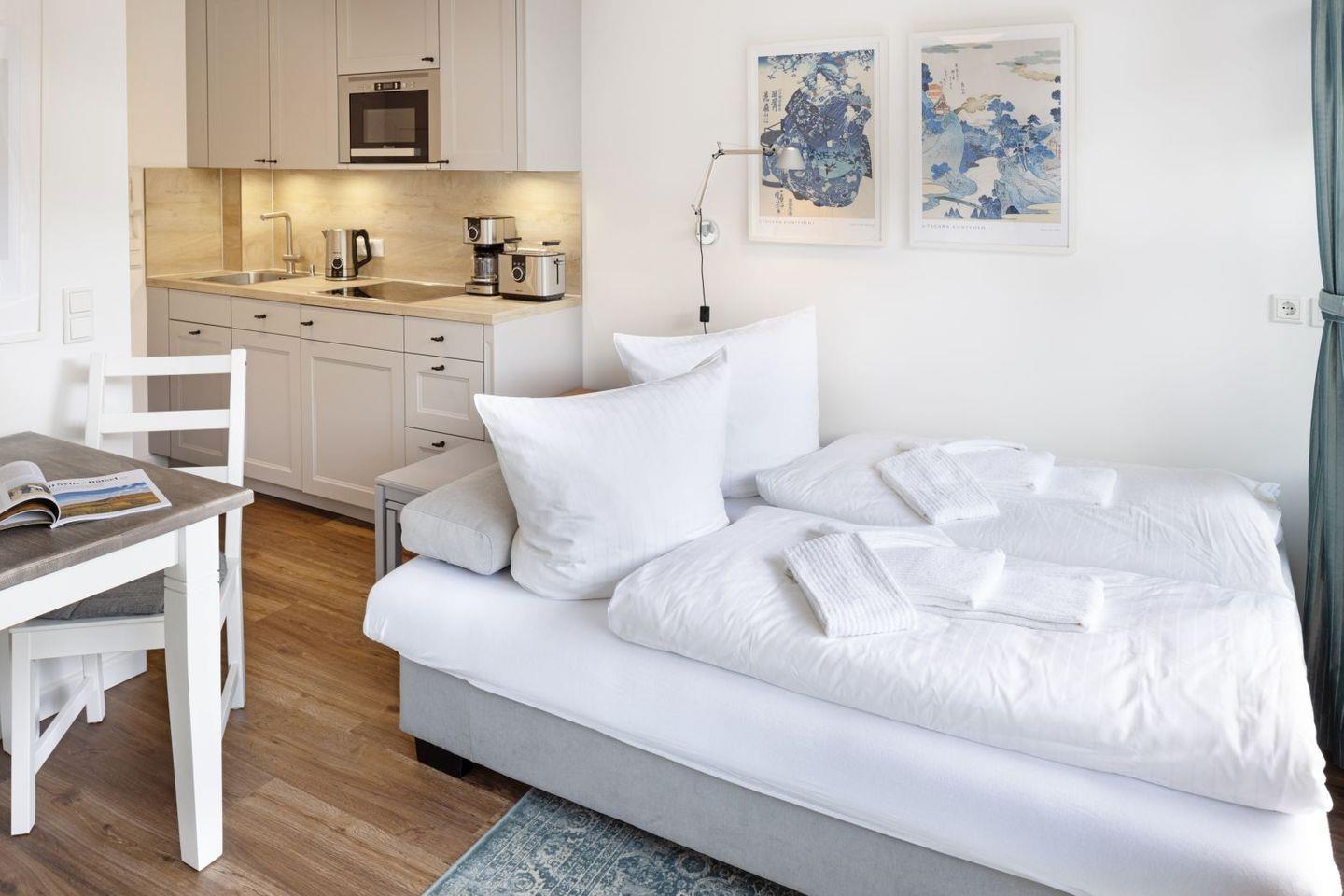 Das ein Zimmer Appartement verfügt über eine hochwertige Schlafcouch sowie eine Sitzgelegenheit für zwei. Eine gut ausgestattete Küchenzeile und ein modernes Duschbad.
