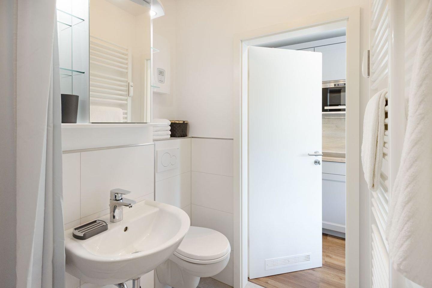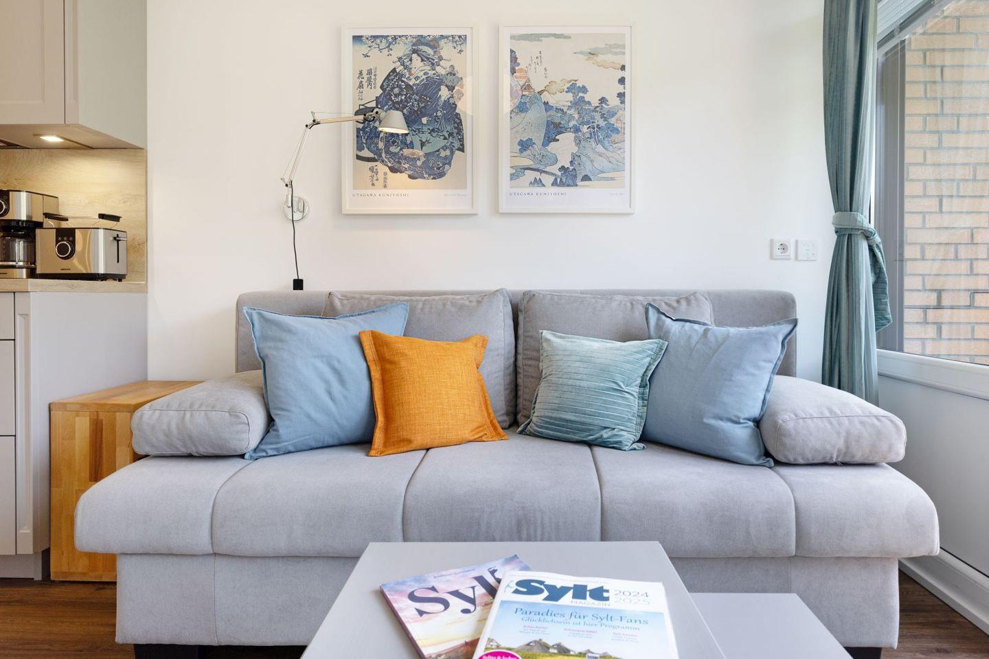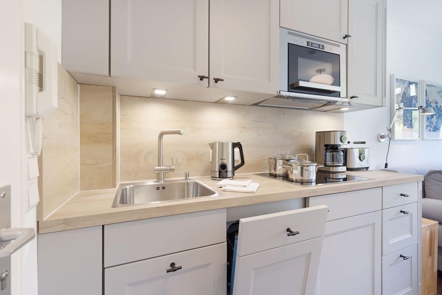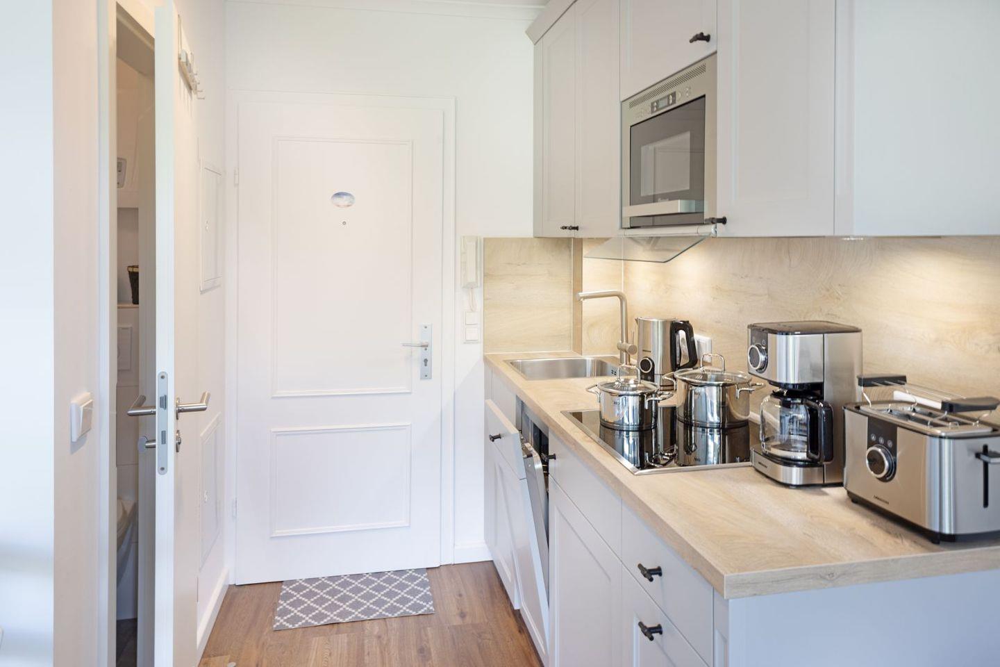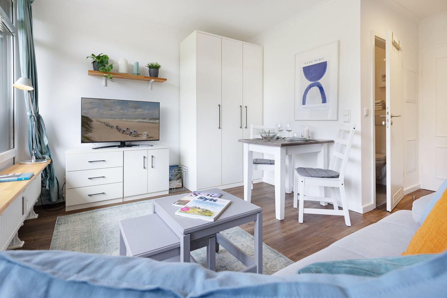 Das ein Zimmer Appartement verfügt über eine hochwertige Schlafcouch sowie eine Sitzgelegenheit für zwei. Eine gut ausgestattete Küchenzeile und ein modernes Duschbad.