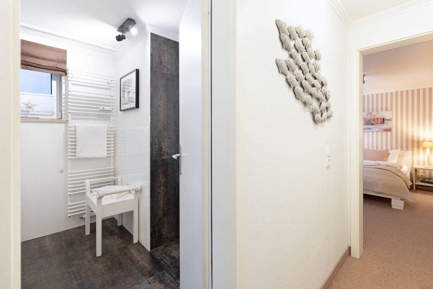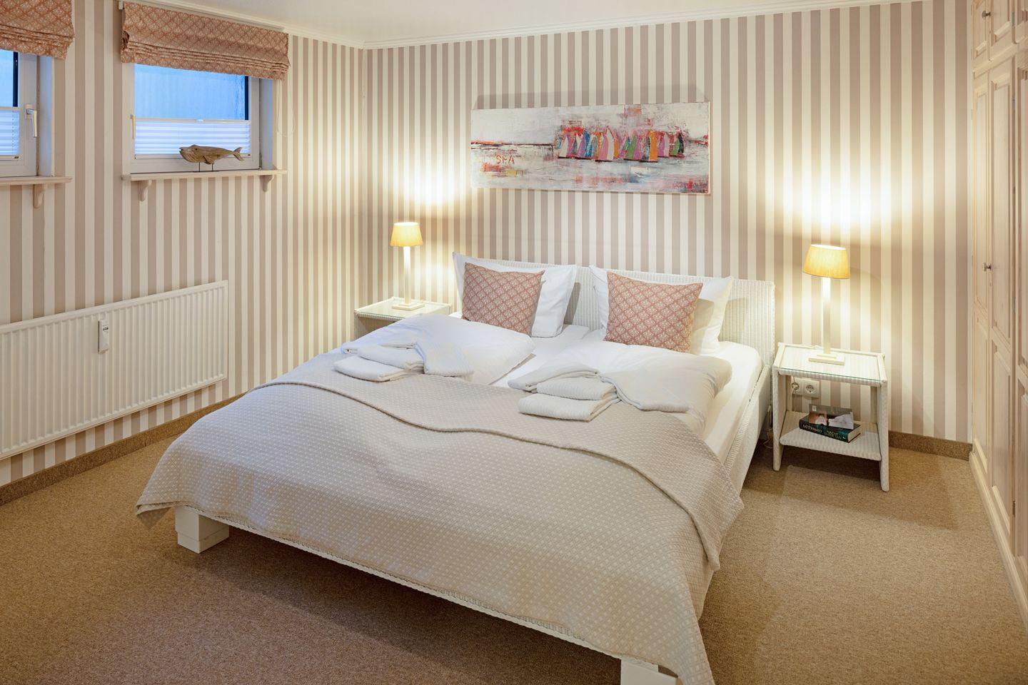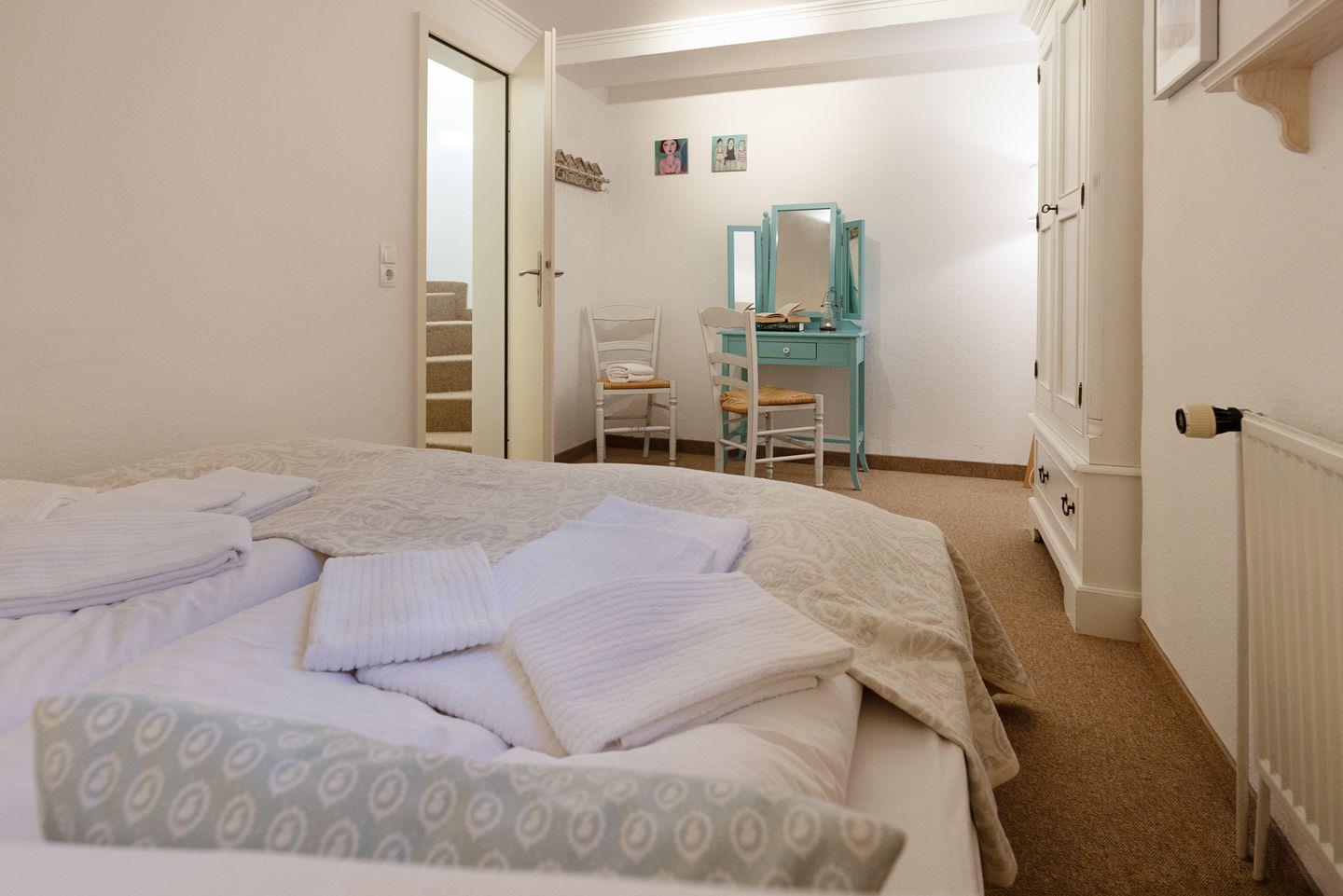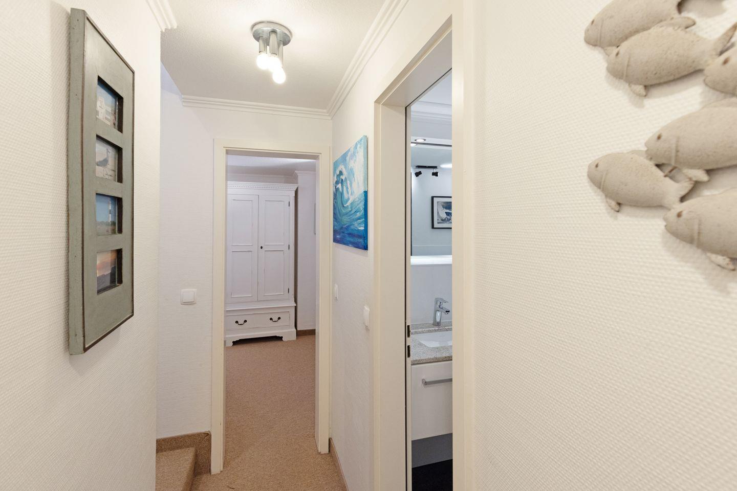 Über den charmant gestalteten Flur gelangen Sie in die untere Ebene des Appartements. Hier befinden sich zwei weitere komfortable Schlafzimmer, jeweils mit Doppelbetten ausgestattet, die für erholsame Nächte sorgen. Ergänzt wird diese Etage durch ein Badezimmer sowie ein zusätzliches Gäste-WC.