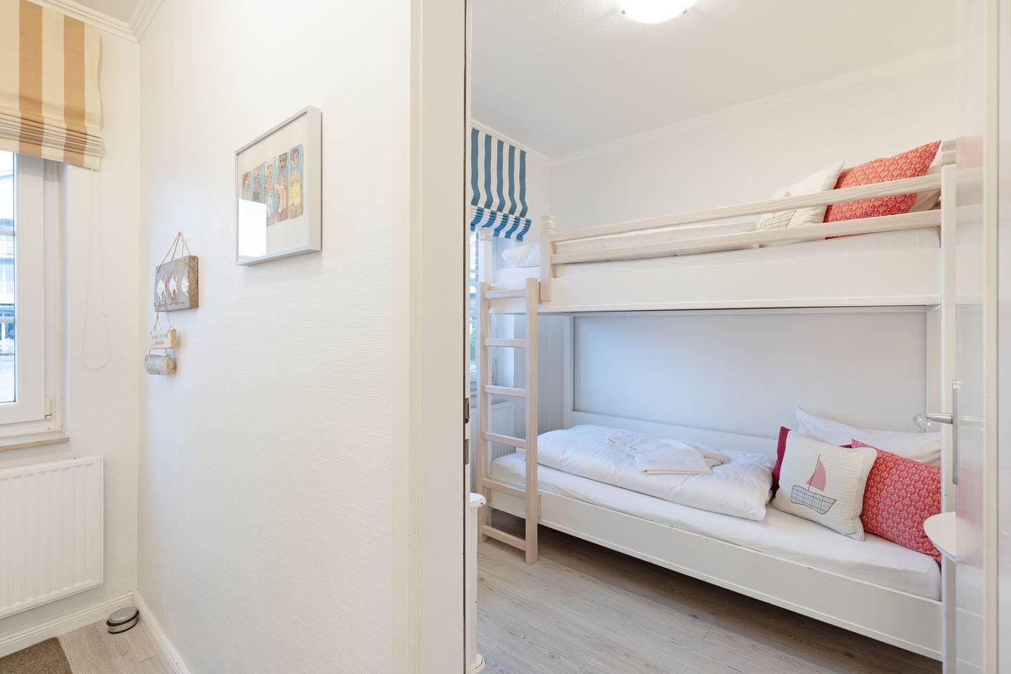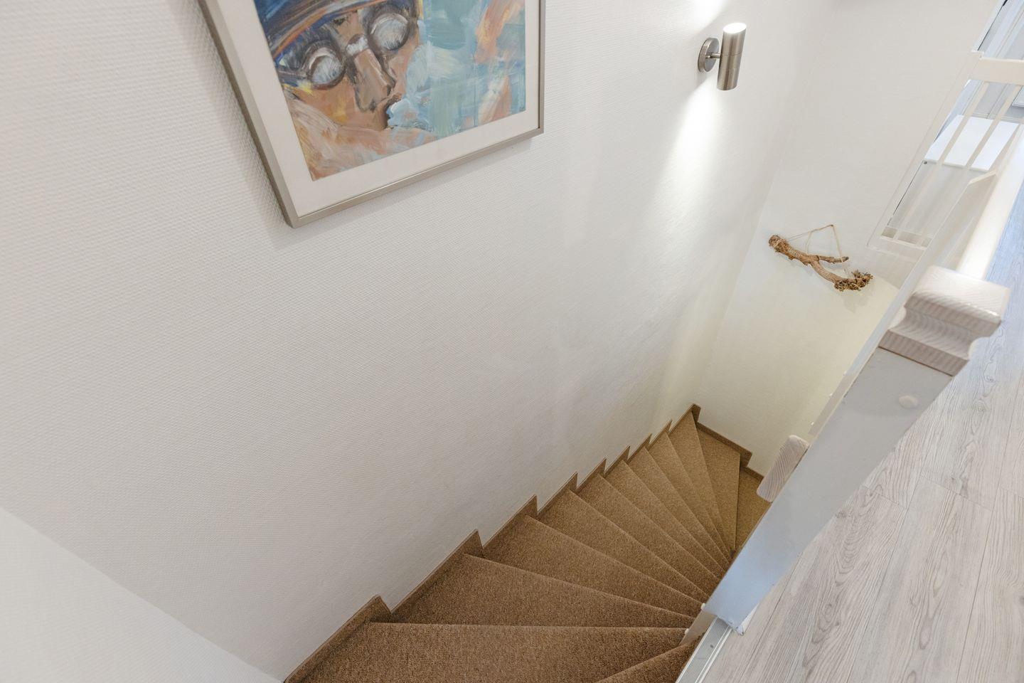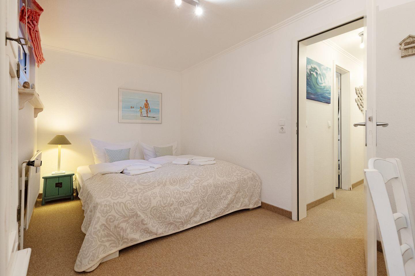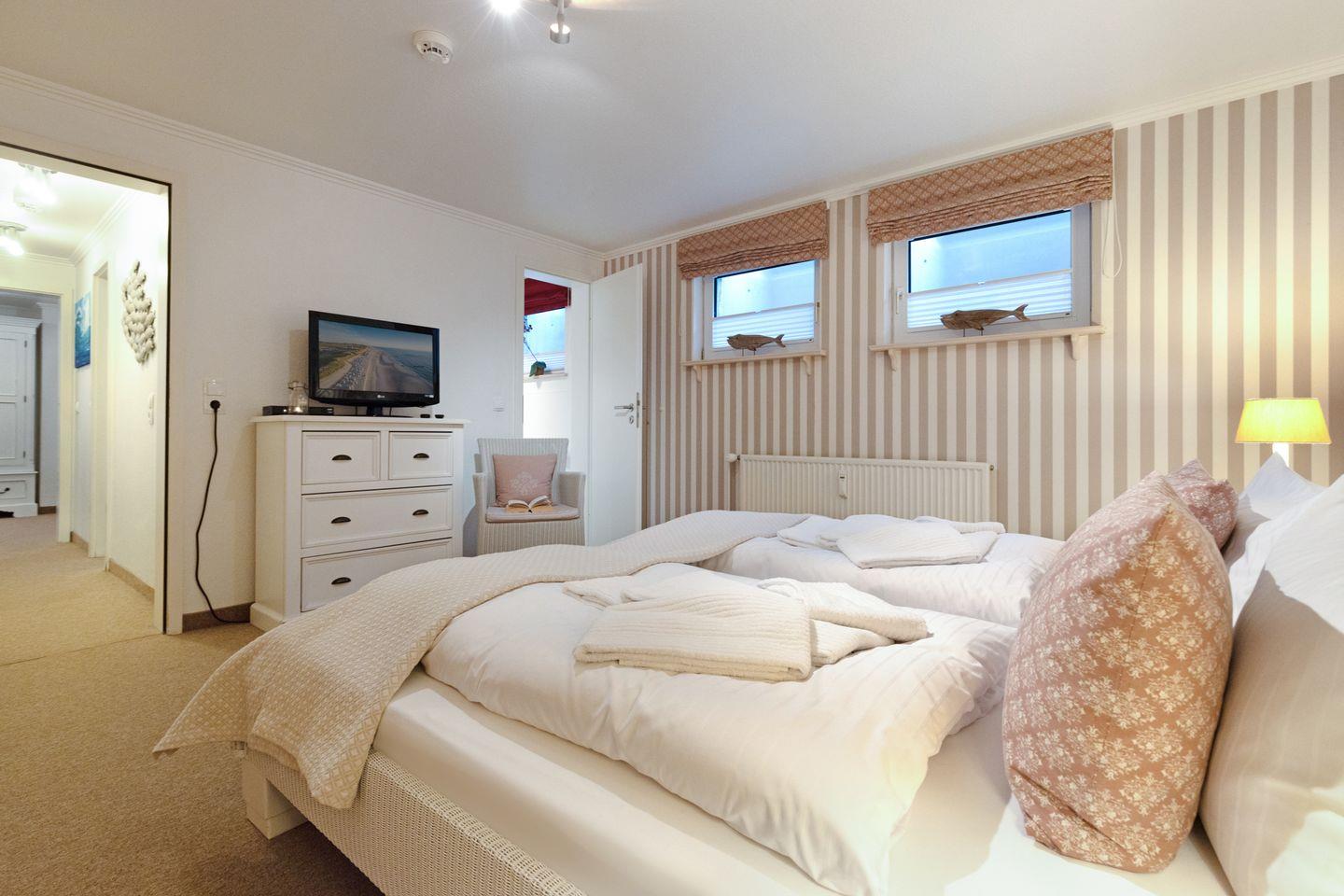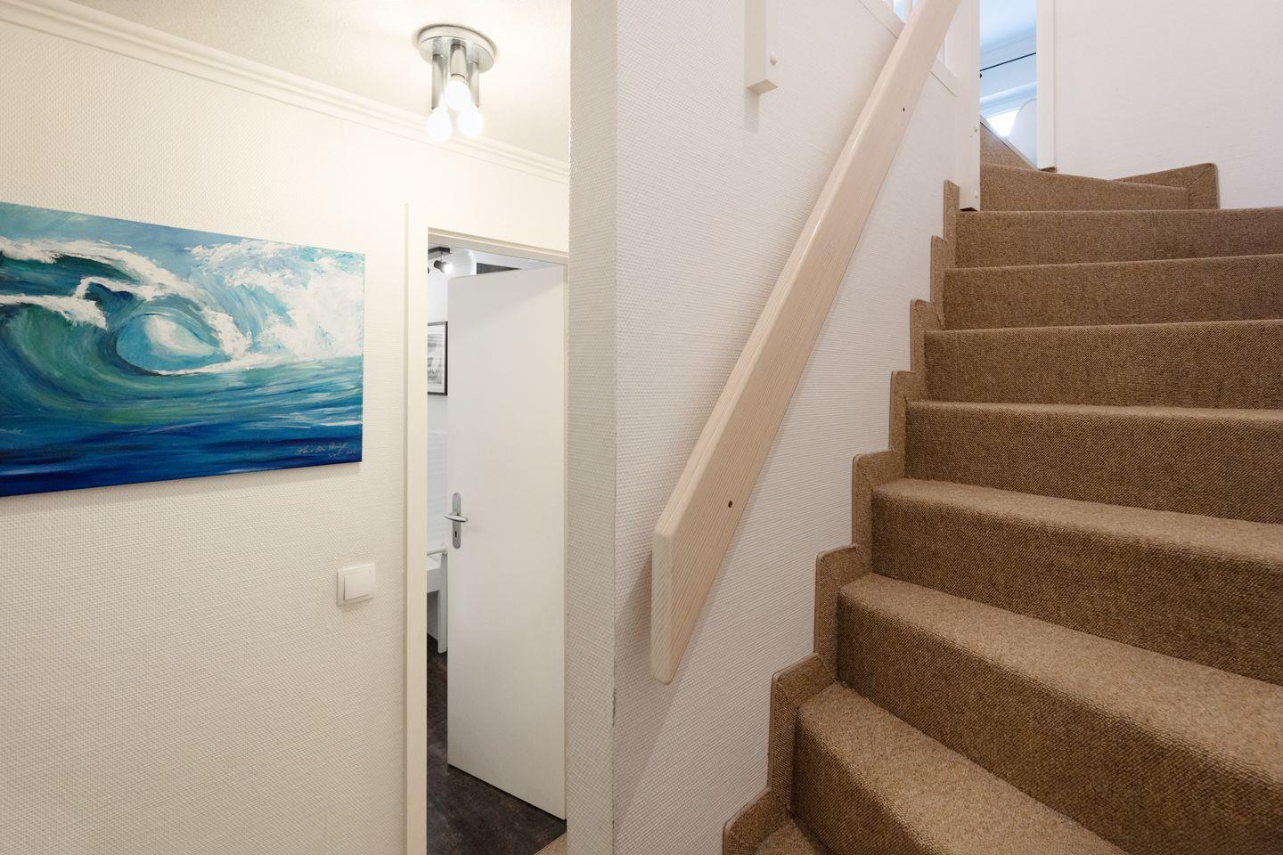 Über den charmant gestalteten Flur gelangen Sie in die untere Ebene des Appartements. Hier befinden sich zwei weitere komfortable Schlafzimmer, jeweils mit Doppelbetten ausgestattet, die für erholsame Nächte sorgen. Ergänzt wird diese Etage durch ein Badezimmer sowie ein zusätzliches Gäste-WC.