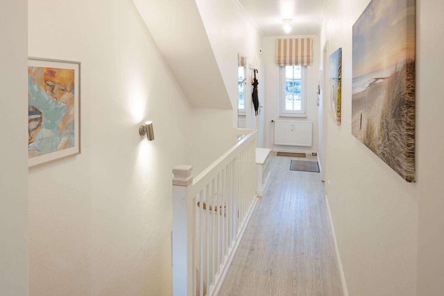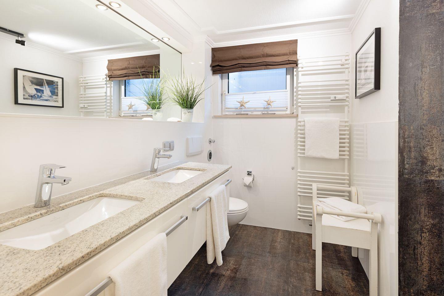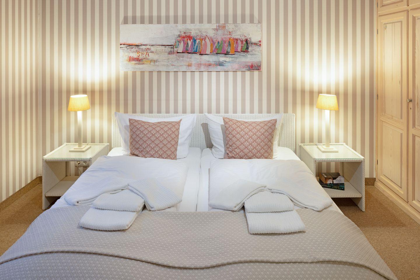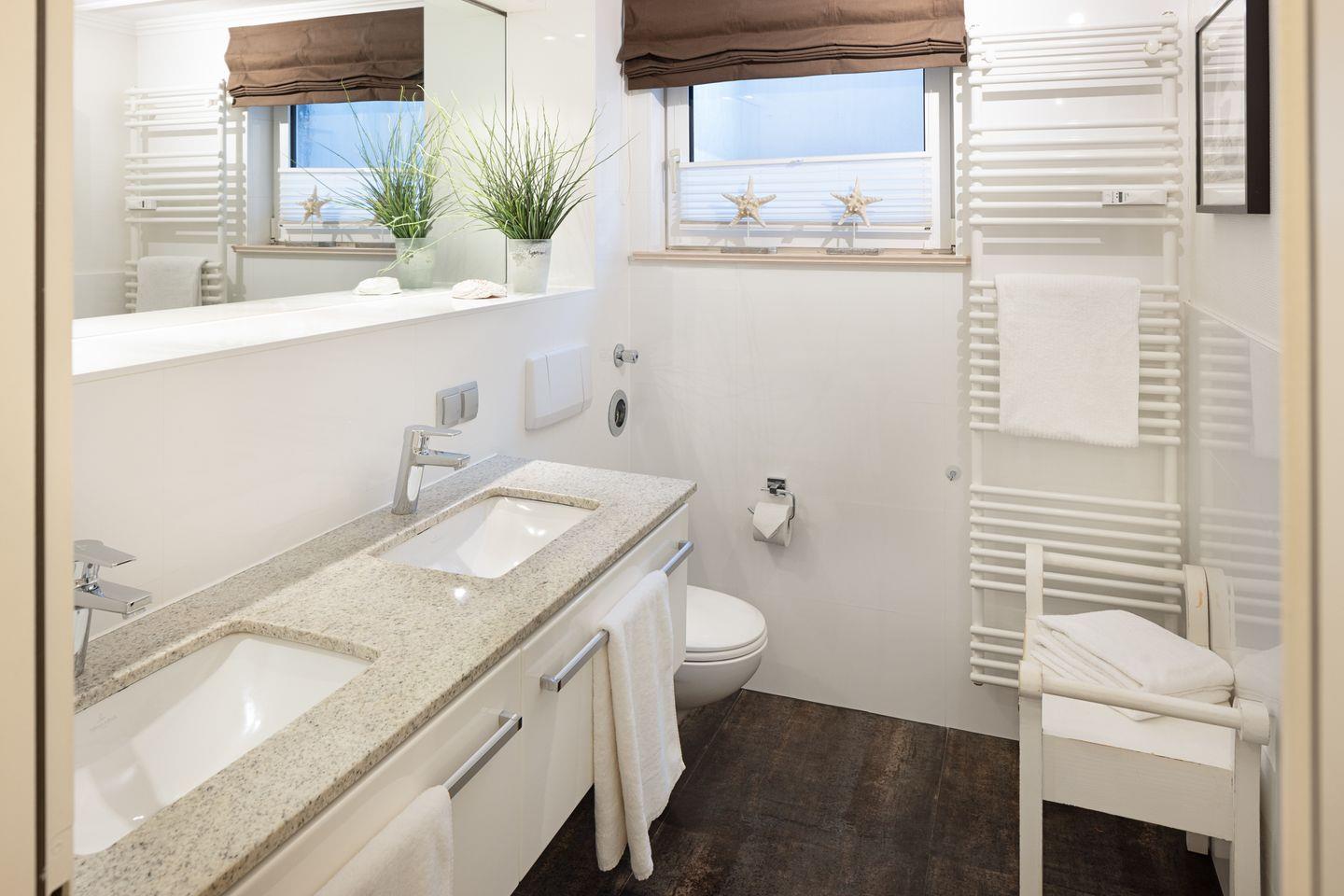 Über den charmant gestalteten Flur gelangen Sie in die untere Ebene des Appartements. Hier befinden sich zwei weitere komfortable Schlafzimmer, jeweils mit Doppelbetten ausgestattet, die für erholsame Nächte sorgen. Ergänzt wird diese Etage durch ein Badezimmer sowie ein zusätzliches Gäste-WC.