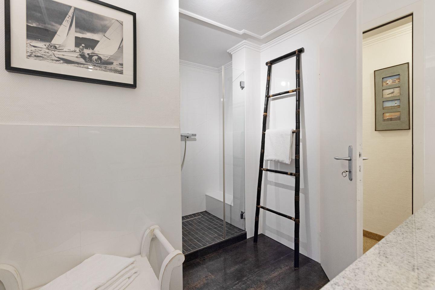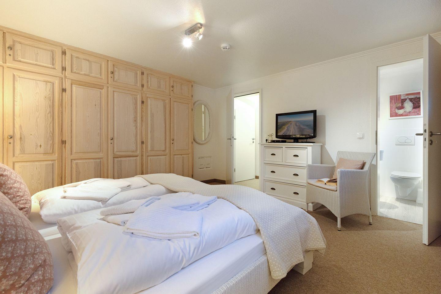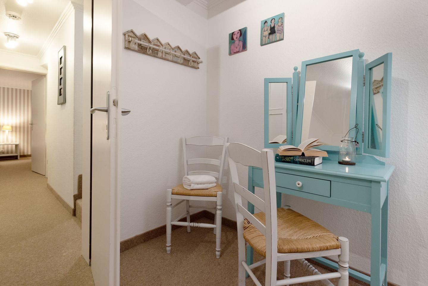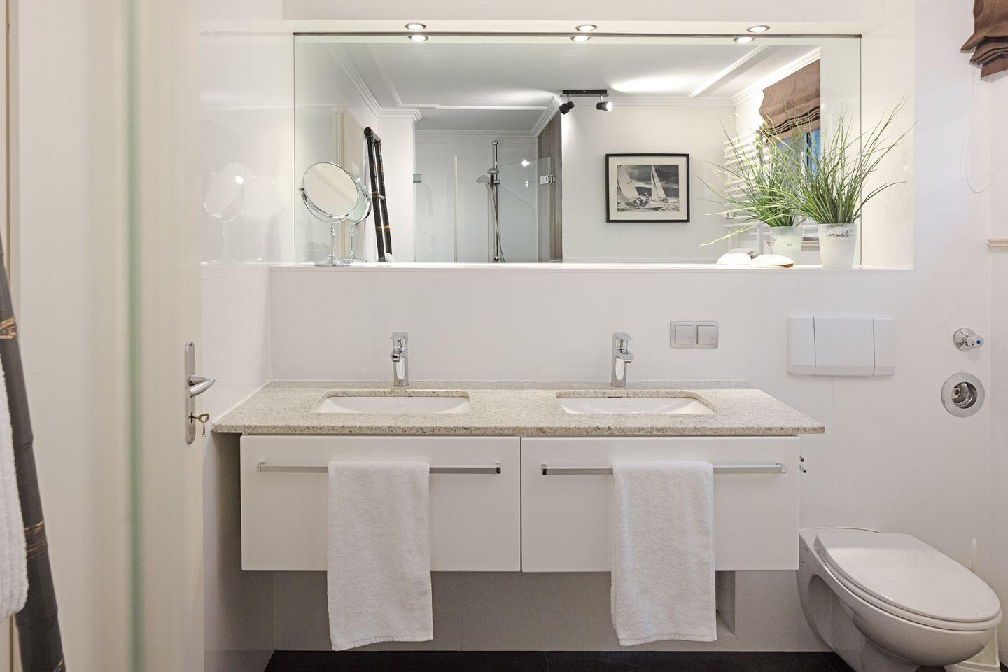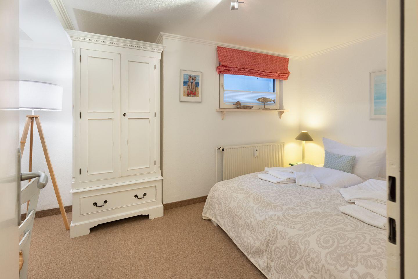 Über den charmant gestalteten Flur gelangen Sie in die untere Ebene des Appartements. Hier befinden sich zwei weitere komfortable Schlafzimmer, jeweils mit Doppelbetten ausgestattet, die für erholsame Nächte sorgen. Ergänzt wird diese Etage durch ein Badezimmer sowie ein zusätzliches Gäste-WC.