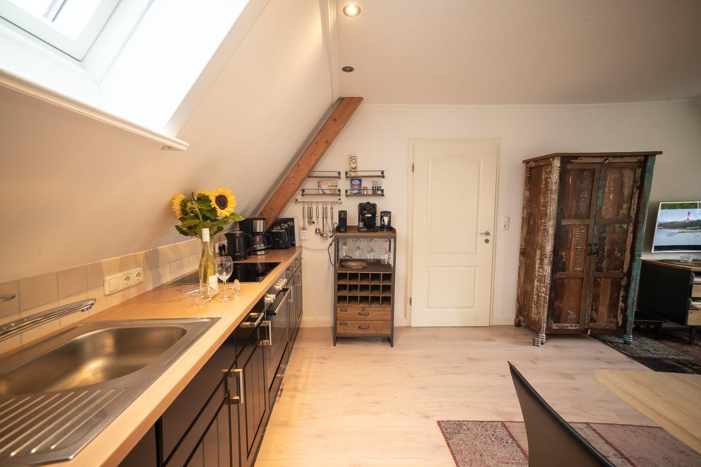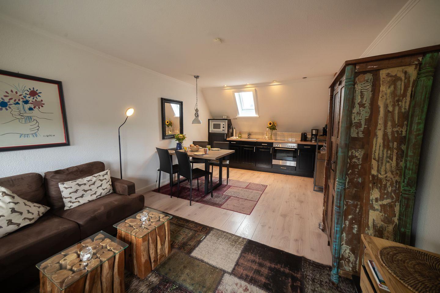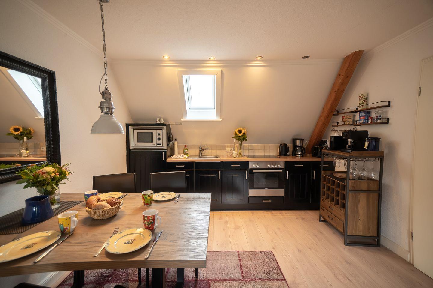 Das Herzstück der Unterkunft ist der offene Wohnbereich, der mit einer modernen, vollständig ausgestatteten Küche verbunden ist. Hier finden Sie alle Annehmlichkeiten, die Sie für die Zubereitung köstlicher Speisen benötigen – von einem Cerankochfeld über einen Backofen und eine Mikrowelle bis hin zur praktischen Spülmaschine. Der Esstisch, gelegen zwischen Wohn- und Küchenbereich, bietet genügend Platz für gemeinsam gestaltete Mahlzeiten. Genießen Sie Ihren Kaffee am Morgen mit der Nespresso Espressomaschine oder nutzen Sie die vorhandenen Küchenutensilien, um Ihre Lieblingsgerichte zuzubereiten.
