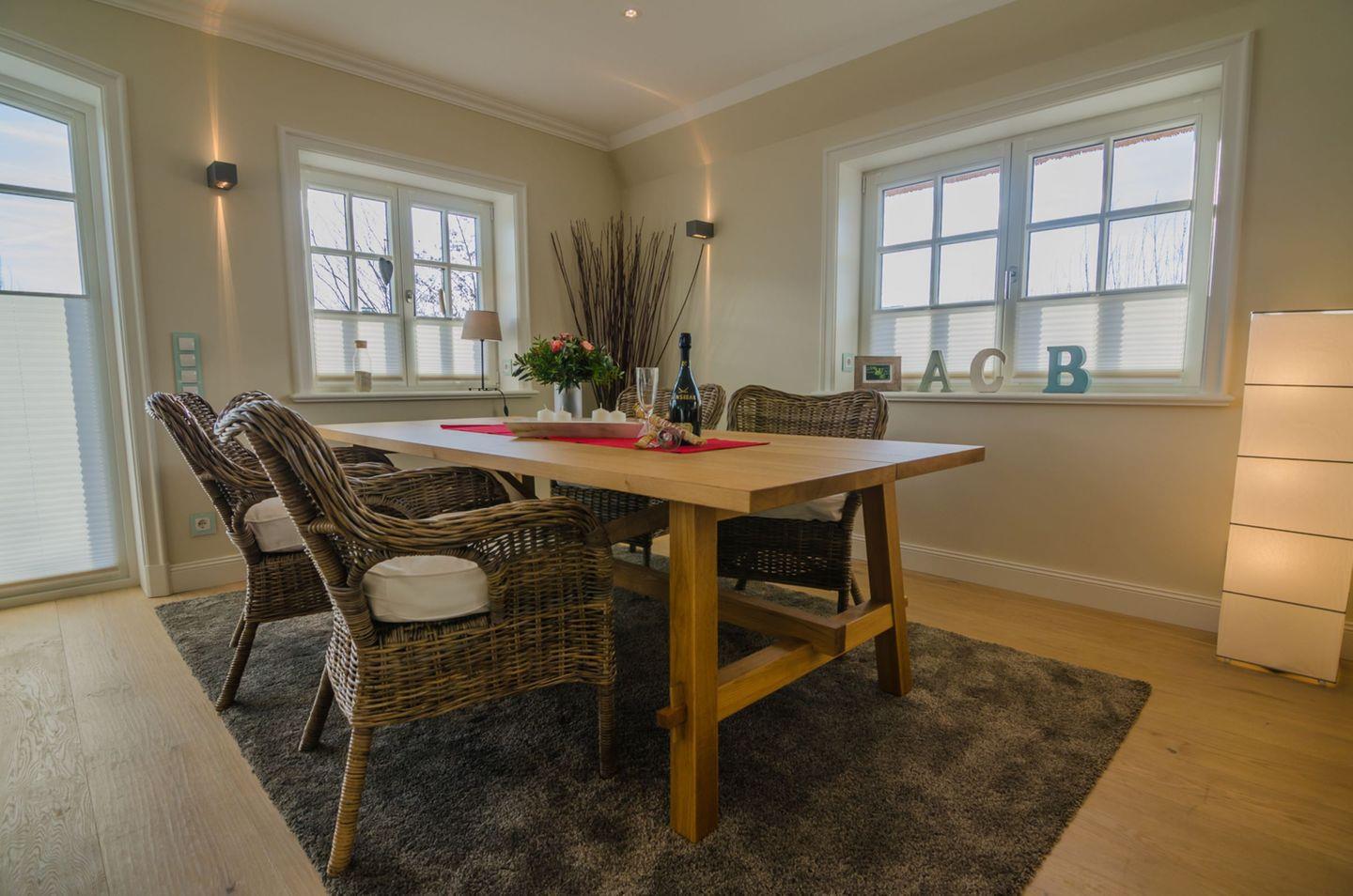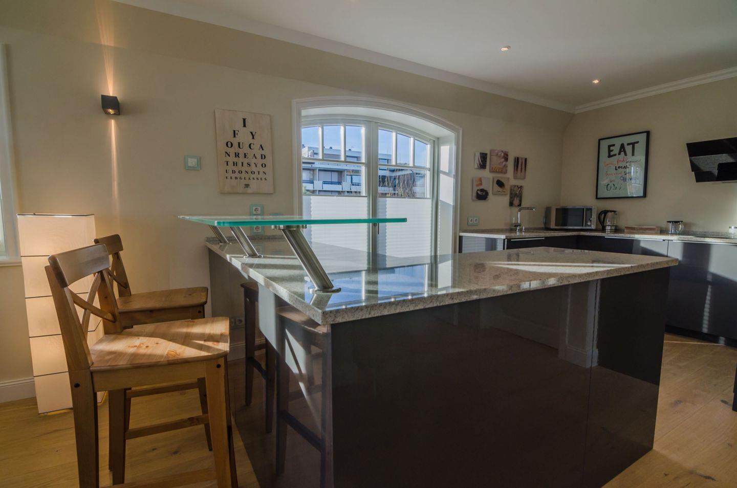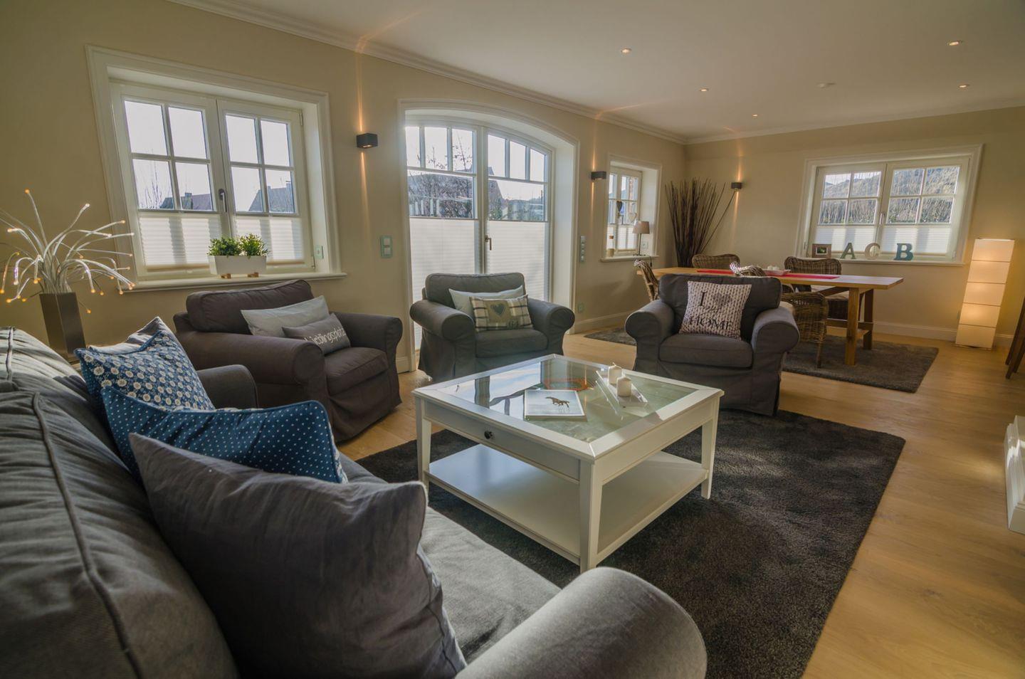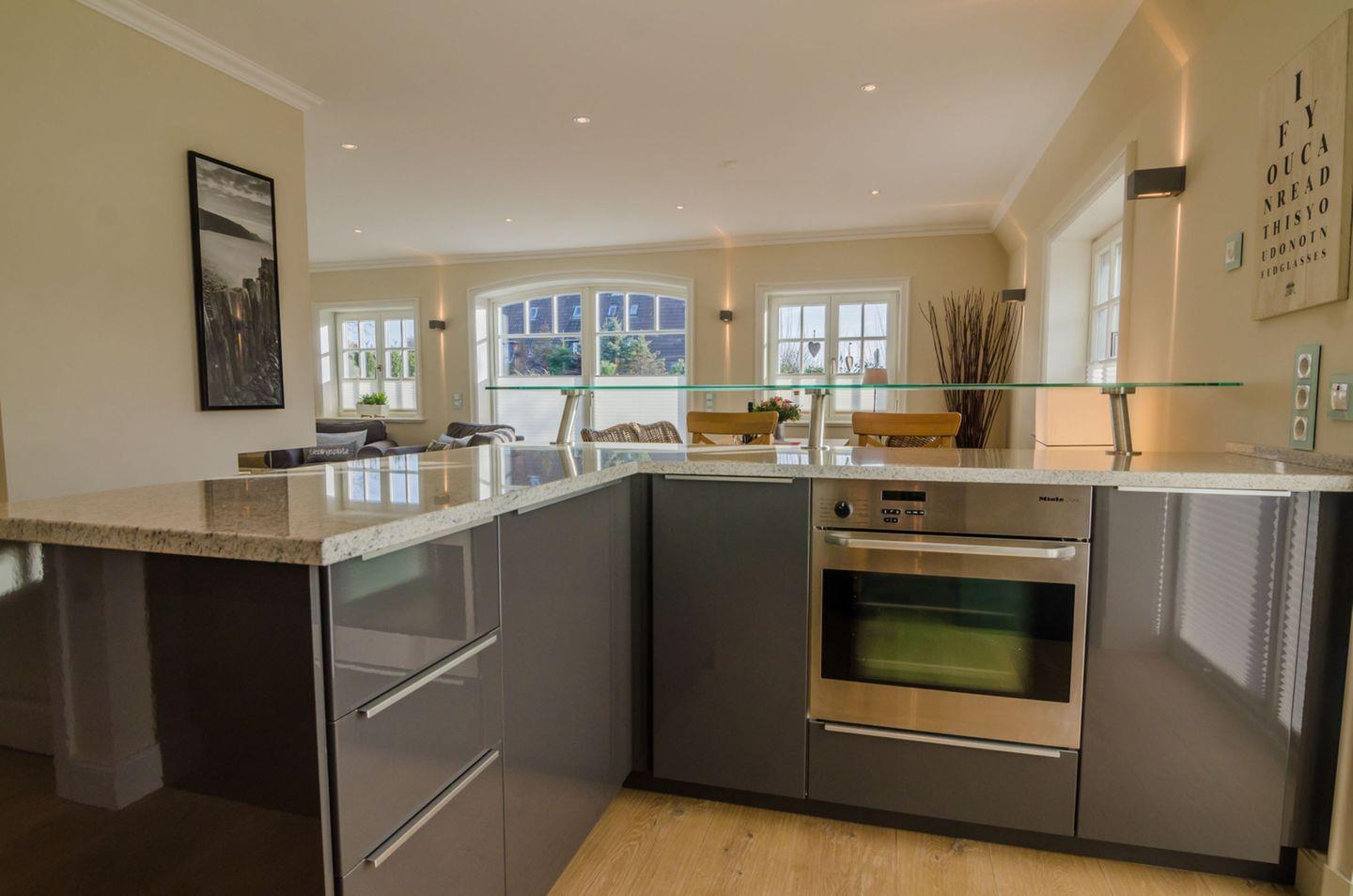 Der lichtdurchflutete Wohnbereich verfügt über einen gemütlichen Essbereich, eine Sofaecke sowie Fernseher und WLAN-Anbindung. Ihr Komfort steht im Mittelpunkt: Eine offene, moderne Küche, die in den Wohnraum integriert ist, lässt mit Cerankochfeld, Elektrobackofen, Geschirrspüler, Kühlschrank mit integriertem Gefrierfach, Espressomaschine (Cafissimo), Kaffeemaschine, Toaster, Wasserkocher, Mikrowelle und vollständigen Küchenutensilien keine Wünsche offen. Am Esstisch findet die ganze Familie bequem Platz.