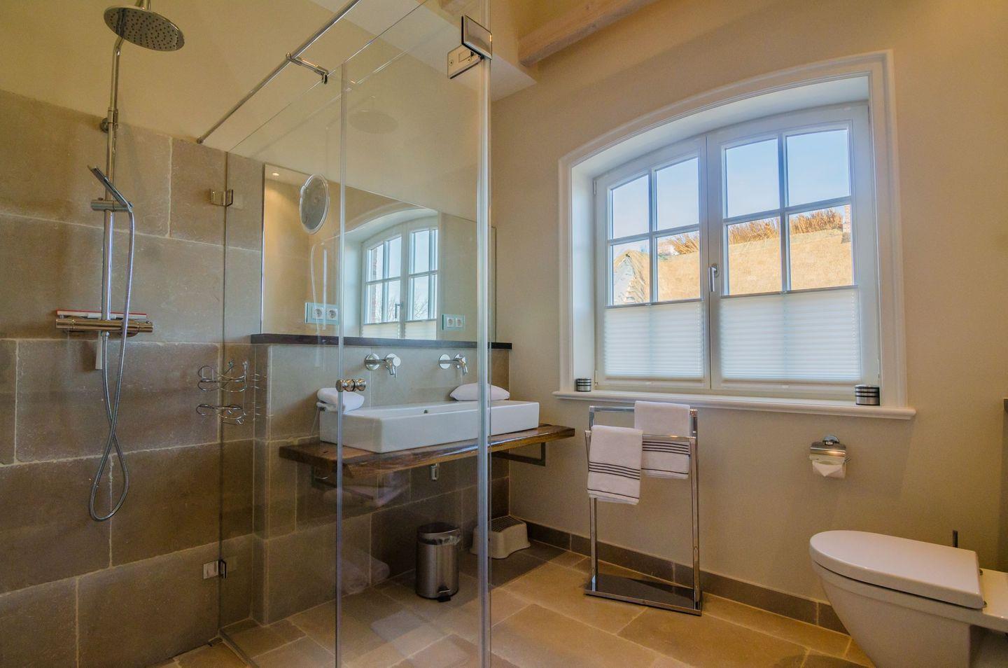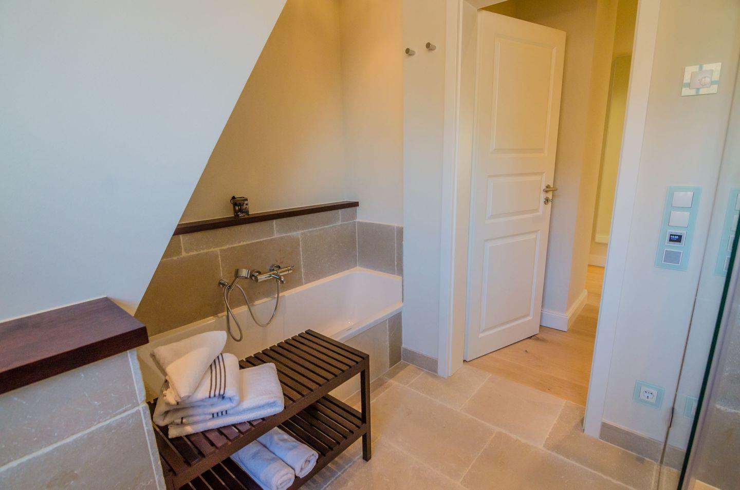 Das Badezimmer ist hochwertig ausgestattet: Neben zwei bodengleichen Duschen steht Ihnen auch eine Badewanne zur Verfügung. Zusätzlich gibt es ein separates Gäste-WC. Für Ihren Aufenthalt sind praktische Ausstattungsdetails wie ein Waschtrockner (mit Eigennutzung), Wäscheständer, Bügeleisen und Staubsauger vorhanden, sodass Sie während Ihres Urlaubs unabhängig und flexibel bleiben.
