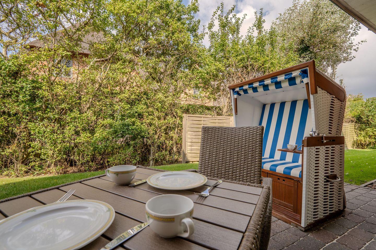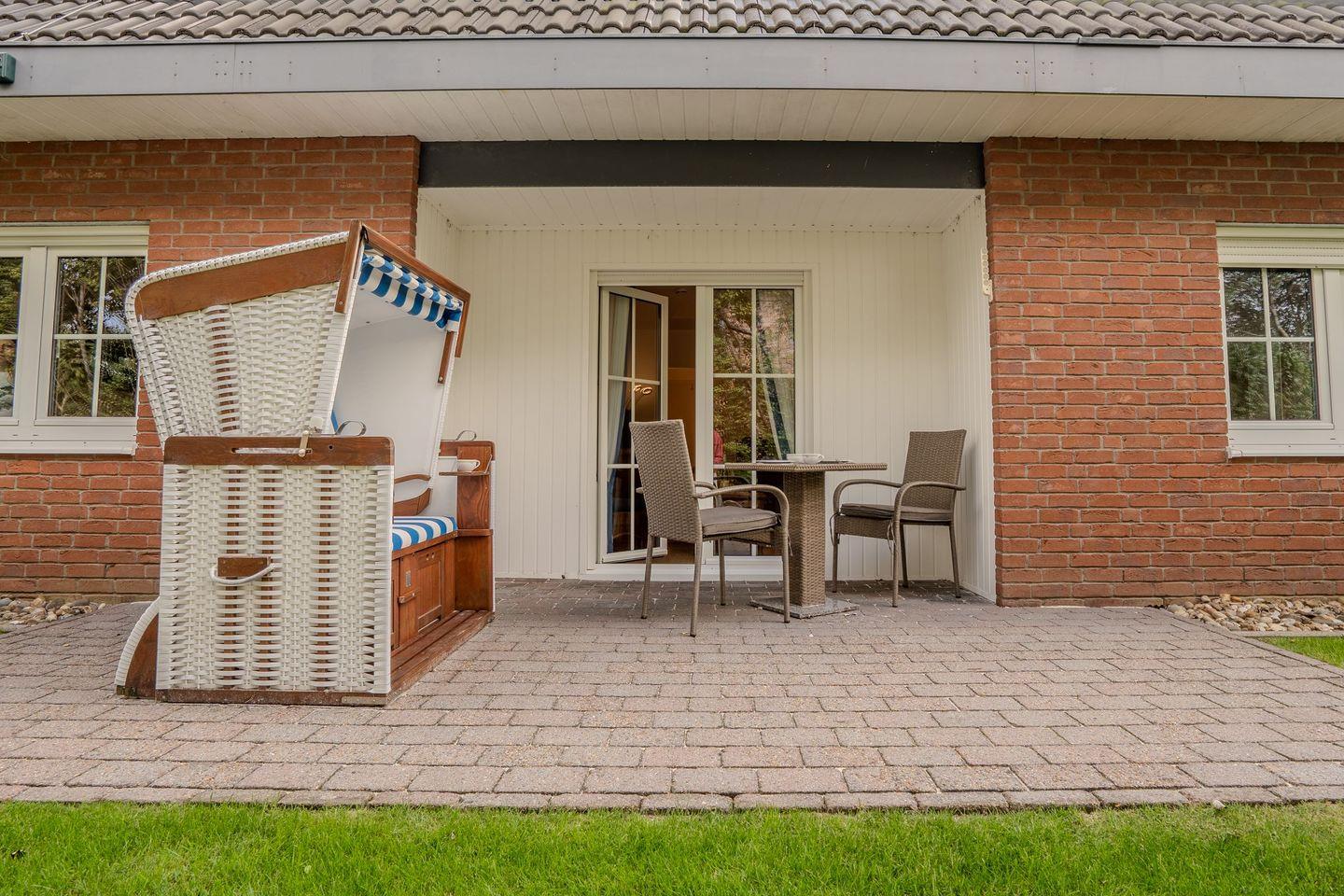 Ein weiterer Pluspunkt ist die Terrasse, auf der Sie die frische Nordseeluft genießen können – ideal für gemütliche Stunden im Freien. Gartenmöbel und Liegewiesen sorgen dafür, dass Sie draußen entspannen und die ruhige Umgebung bei einem guten Buch oder einer Tasse Kaffee genießen können. Gepflegte Gartenanlagen mit Blick ins Grüne laden zu erholsamen Stunden ein.