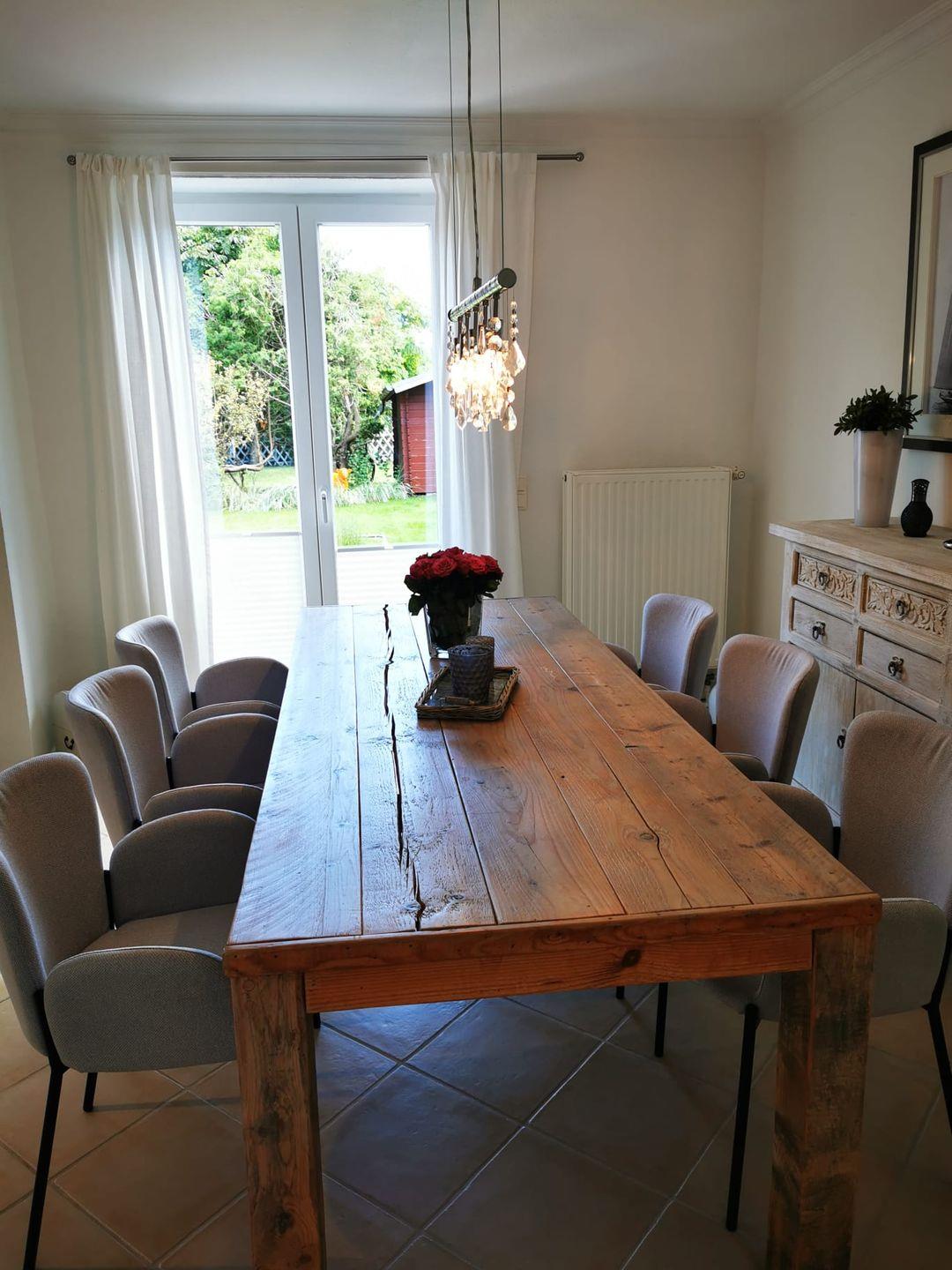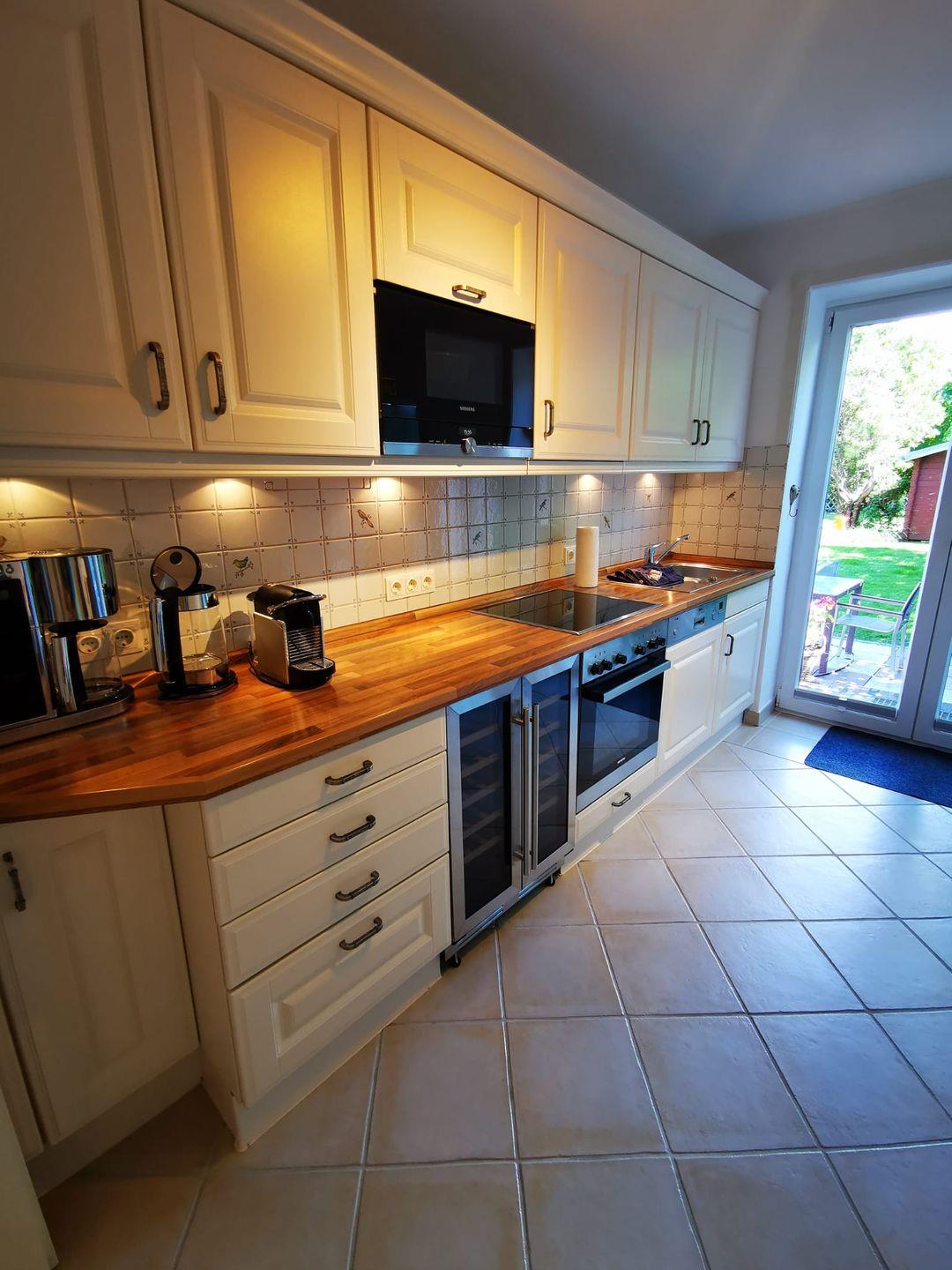 Die Küche ist offen gestaltet, bietet viel Arbeitsfläche und ist vollständig ausgestattet: Ceranherd, Backofen mit Elektroanschluss, Mikrowelle, Kaffeemaschine, DeLonghi Espressomaschine, Wasserkocher, Toaster, Spülmaschine, Kühlschrank sowie ein extra Gefrierschrank stehen bereit. Küchenutensilien, Mixer, Geschirr, Besteck und Abfalleimer runden das Angebot ab. Kochen Sie gemeinsam mit der Familie oder Freunden und genießen Sie Ihre Mahlzeiten im hellen Essbereich oder an warmen Tagen im Grünen.