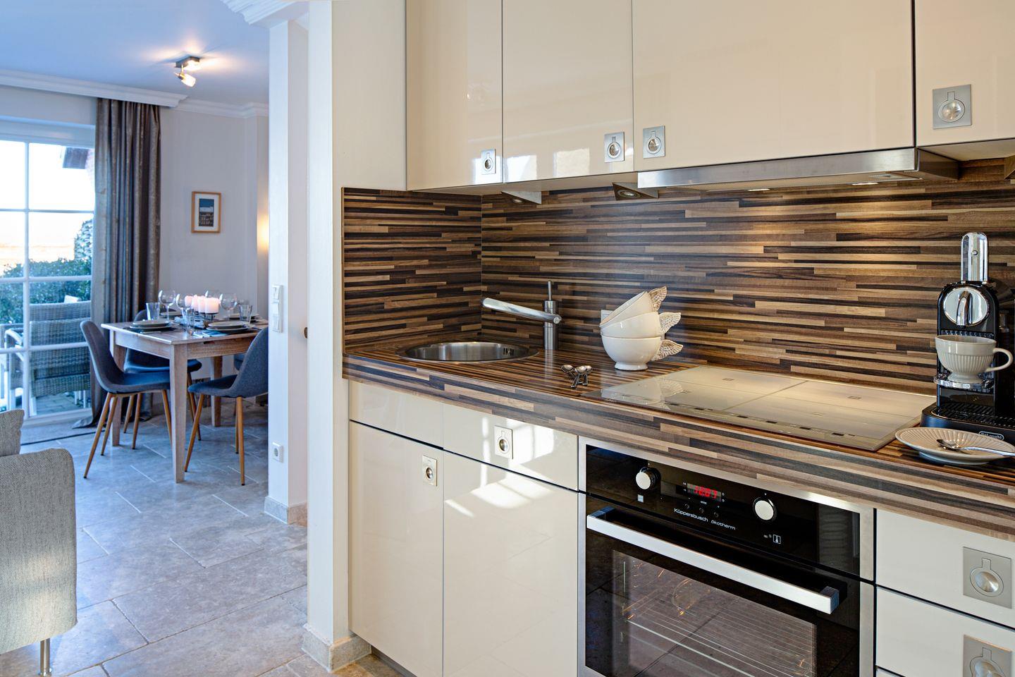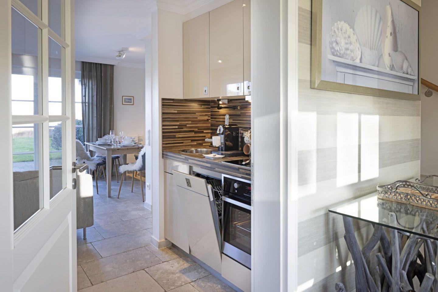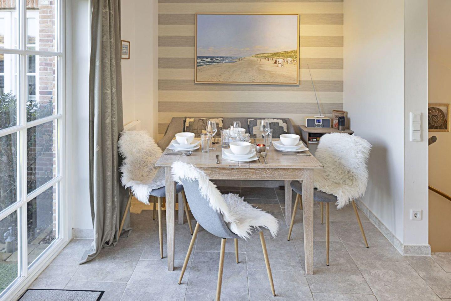 Im Erdgeschoss des Hauses betreten Sie einen offen gestalteten Wohn- und Essbereich. Die offene Küche schließt direkt an das Wohnzimmer an und ist mit modernen Geräten wie Cerankochfeld, Backofen, Spülmaschine, Kühlschrank (mit Gefrierfach), Kaffeemaschine, DeLonghi Espressomaschine, Wasserkocher, Toaster sowie umfassenden Küchenutensilien und Geschirr ausgestattet. Der angrenzende Essbereich lädt zu gemeinsamen Mahlzeiten ein. Das Wohnzimmer ist mit Fliesenboden, gemütlichem Sofa und Sat-TV (insgesamt drei Geräte mit 25-34 Zoll) ausgestattet und bietet kostenloses WLAN.