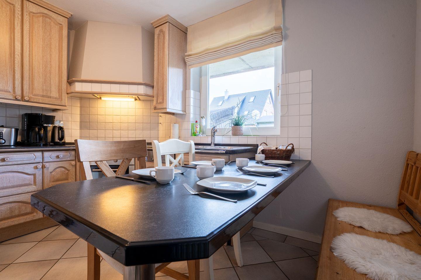 In der komplett ausgestatteten, abgeschlossenen Küche mit Esstisch und Cerankochfeld finden Sie alles, was Sie für die Zubereitung Ihrer Mahlzeiten benötigen: Backofen, Mikrowelle, Geschirrspülmaschine, Kühlschrank mit Gefrierfach, Wasserkocher, Toaster und eine Kaffeemaschine sowie ausreichend Küchenutensilien.