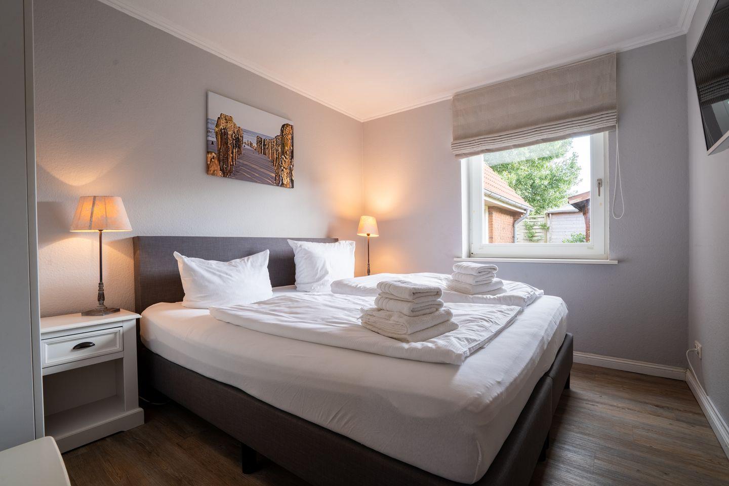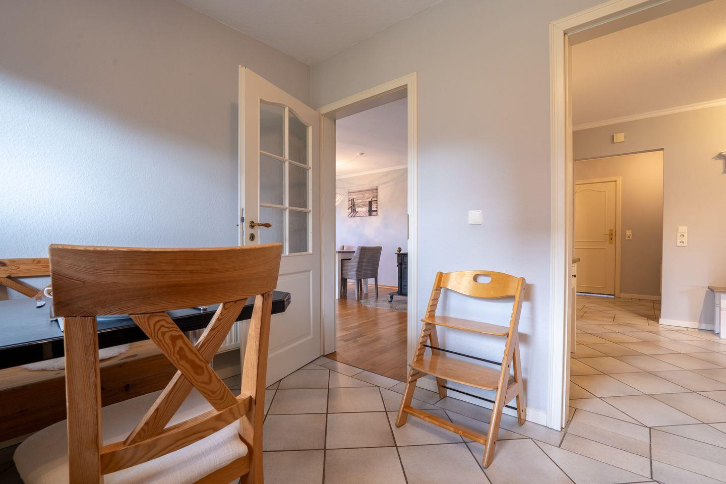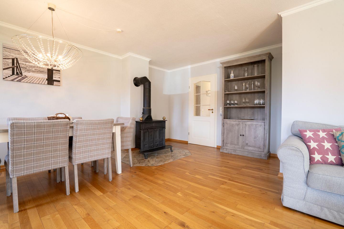 Die geräumige Ferienwohnung besteht aus insgesamt vier Zimmern und kann mit drei separaten Schlafzimmern bis zu fünf Gäste komfortabel beherbergen. Das einladende Wohnzimmer sorgt mit einer Sofaecke und einem großen Esstisch für entspannte Stunden.
