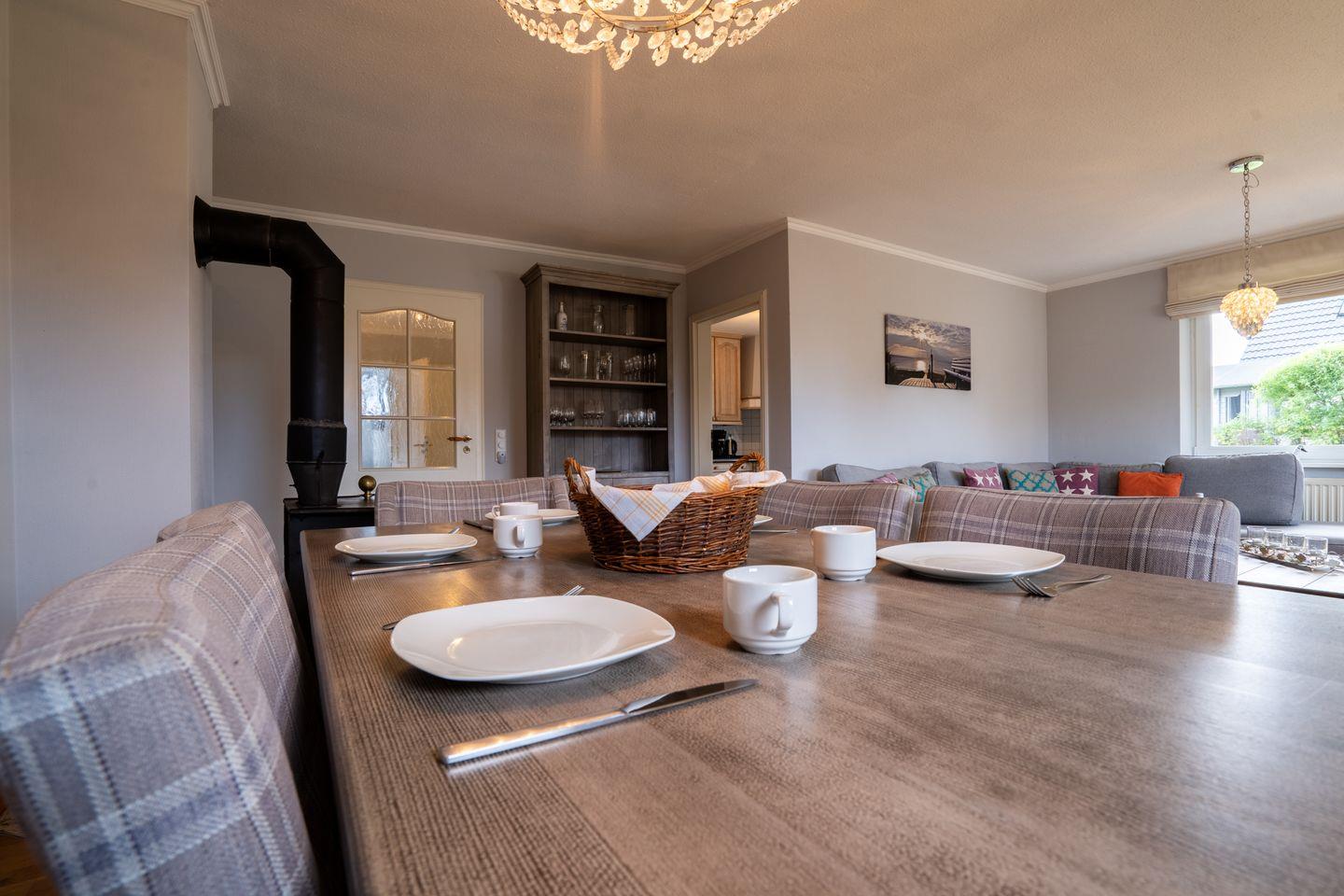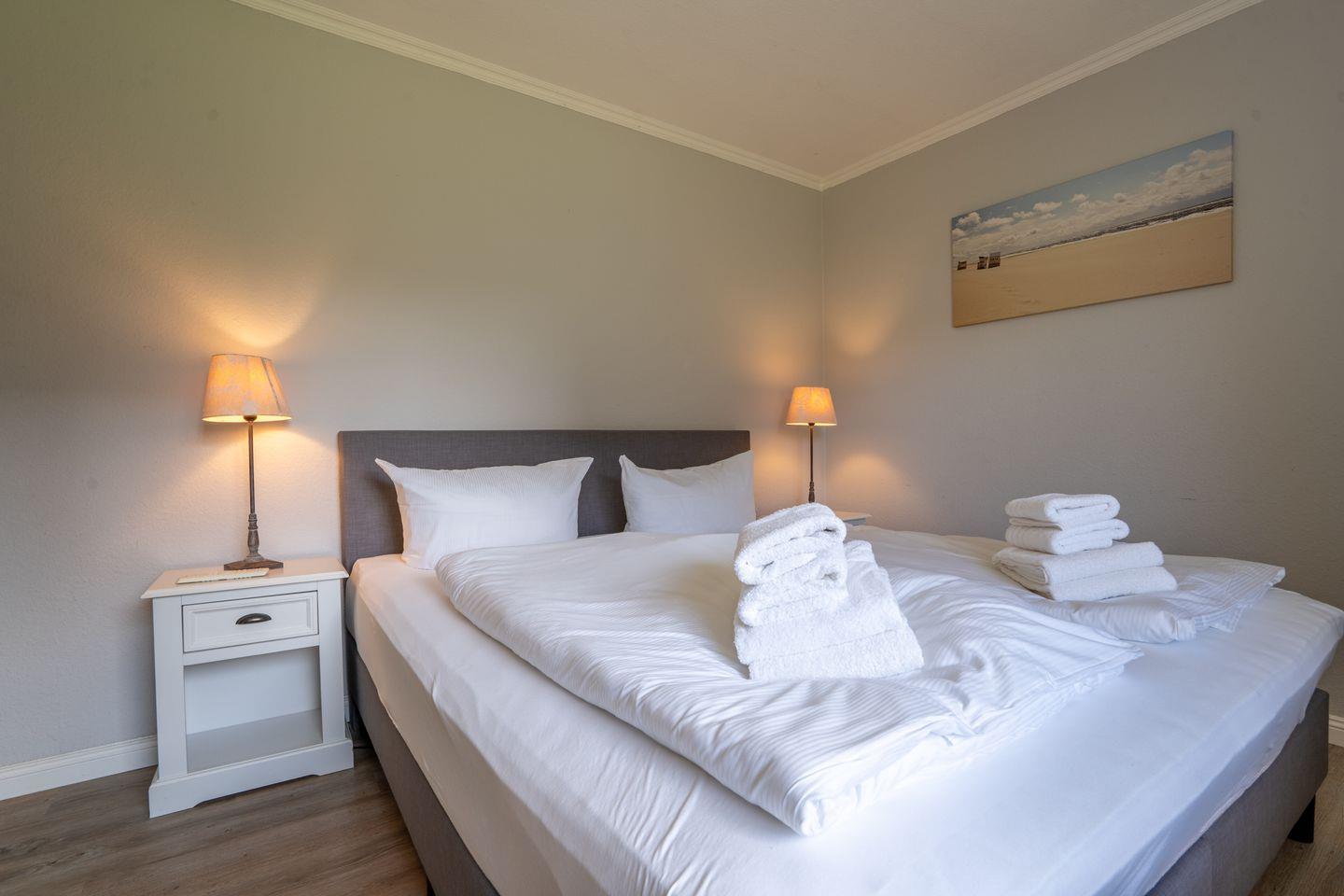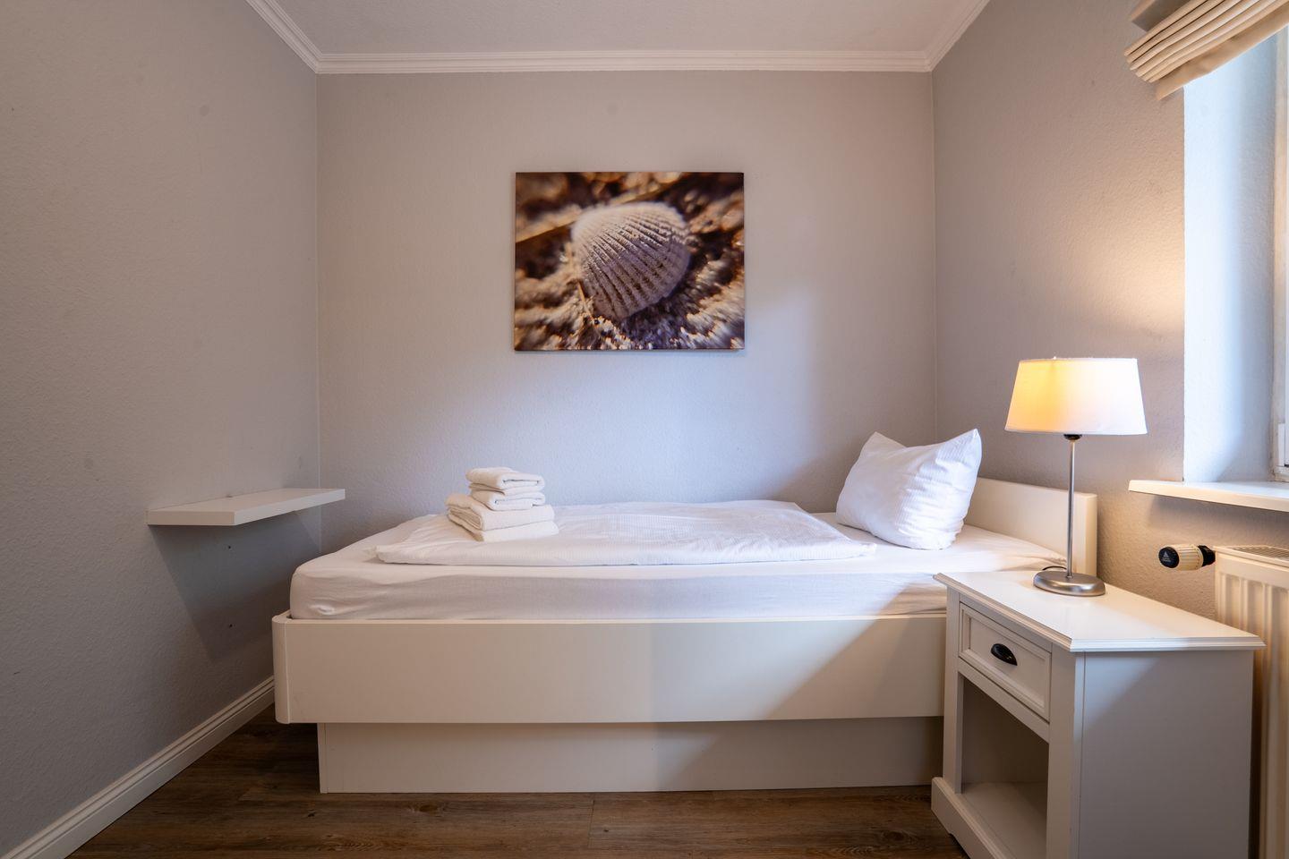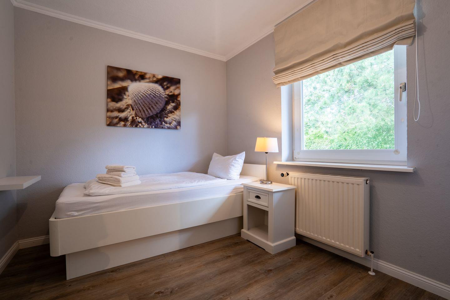Die geräumige Ferienwohnung besteht aus insgesamt vier Zimmern und kann mit drei separaten Schlafzimmern bis zu fünf Gäste komfortabel beherbergen. Das einladende Wohnzimmer sorgt mit einer Sofaecke und einem großen Esstisch für entspannte Stunden.