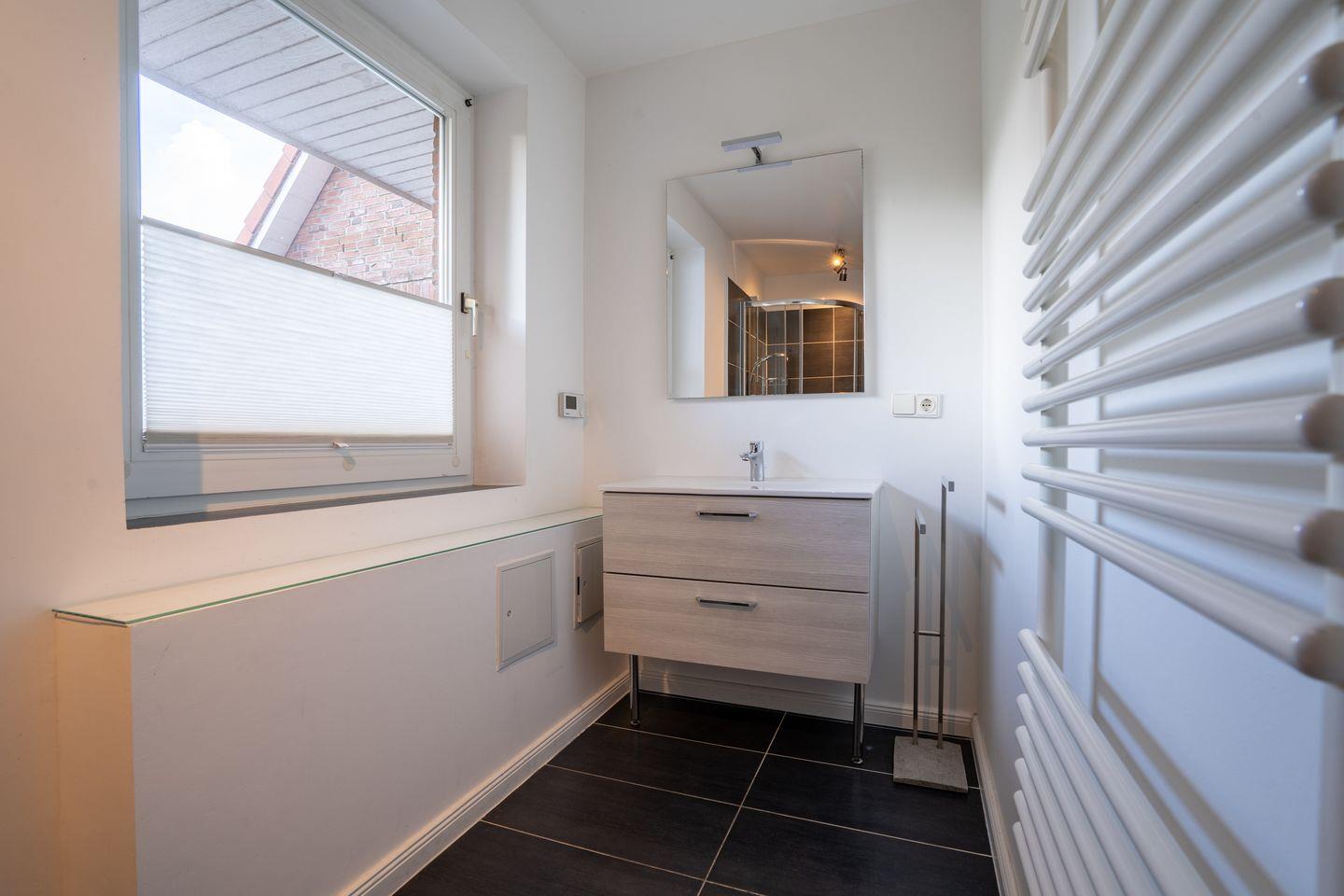Das Badezimmer ist mit einer Dusche sowie einem WC, Waschbecken, Spiegel und Haartrockner ausgestattet. Ein separates Gäste-WC erhöht den Komfort. Ein Ganzkörperspiegel, Garderobe sowie Kommoden ergänzen die praktische Einrichtung.