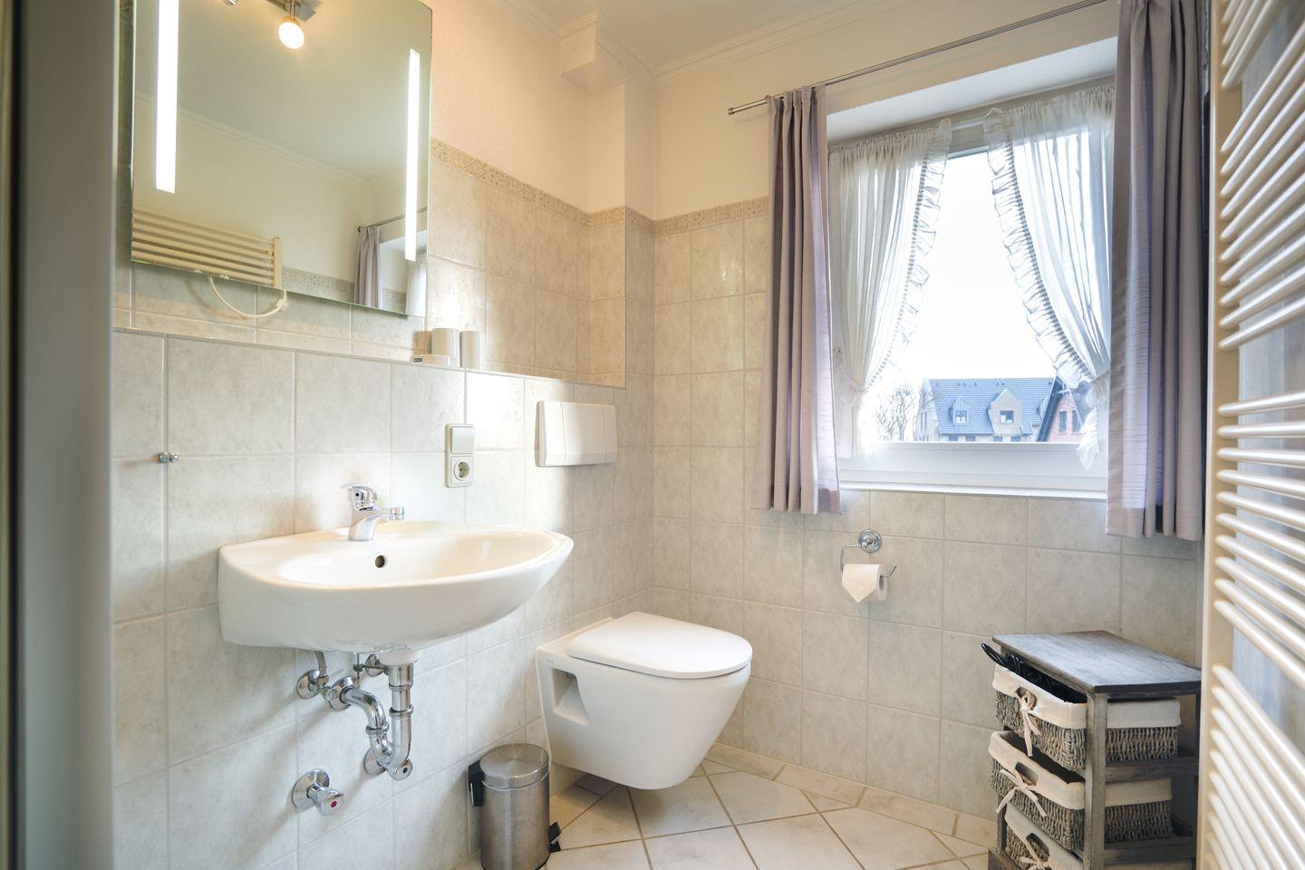 Im Badezimmer finden Sie eine Dusche, WC, Waschbecken, Spiegel, Fenster, Haartrockner sowie einen Ganzkörperspiegel.