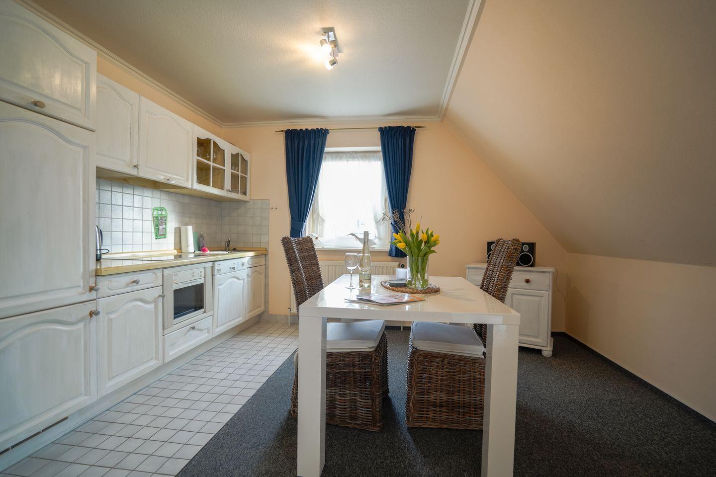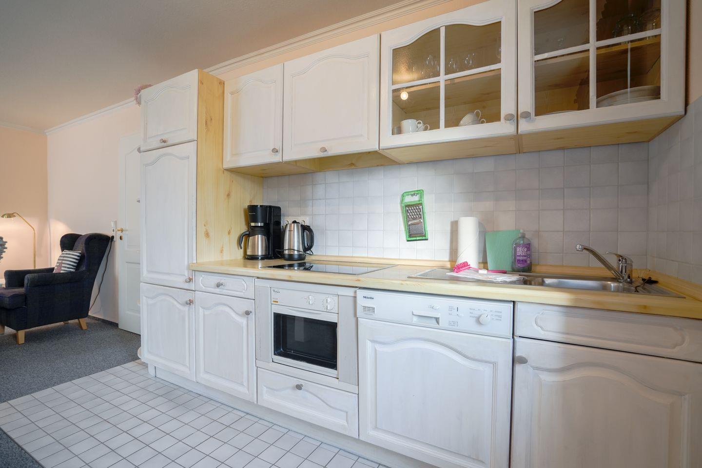 Die Ausstattung der Unterkunft ist sowohl funktional als auch komfortabel gestaltet. Im offen zum Wohnzimmer gestalteten Küchenbereich stehen Ihnen ein Induktionsherd, Kühlschrank mit Gefrierfach, Spülmaschine, Kaffeemaschine, Toaster, Wasserkocher und zahlreiche Küchenutensilien zur Verfügung. Der Essbereich grenzt unmittelbar an die Küche an. Das Wohnzimmer weist eine Sofaecke, Sessel, Esstisch und einen Fernseher auf. Weitere Unterhaltung bieten Bücher und Spiele.