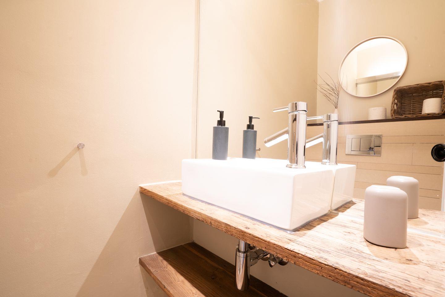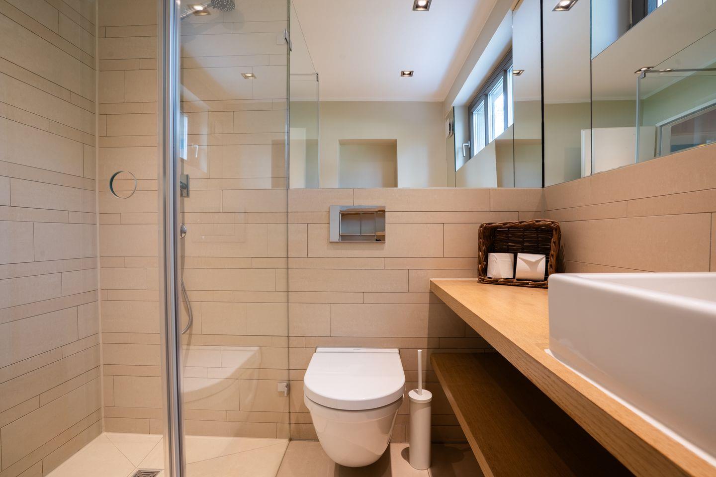 Ein modernes Badezimmer mit bodengleicher Dusche, Waschbecken, Spiegel und Haartrockner steht Ihnen ebenso zur Verfügung wie ein separates Gäste-WC.