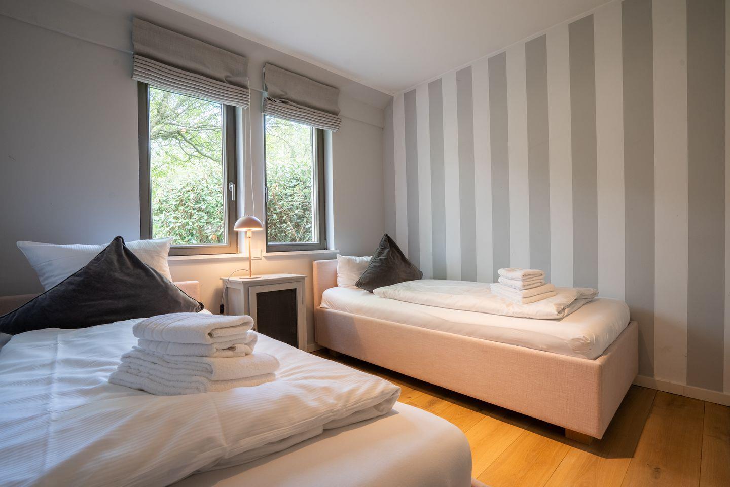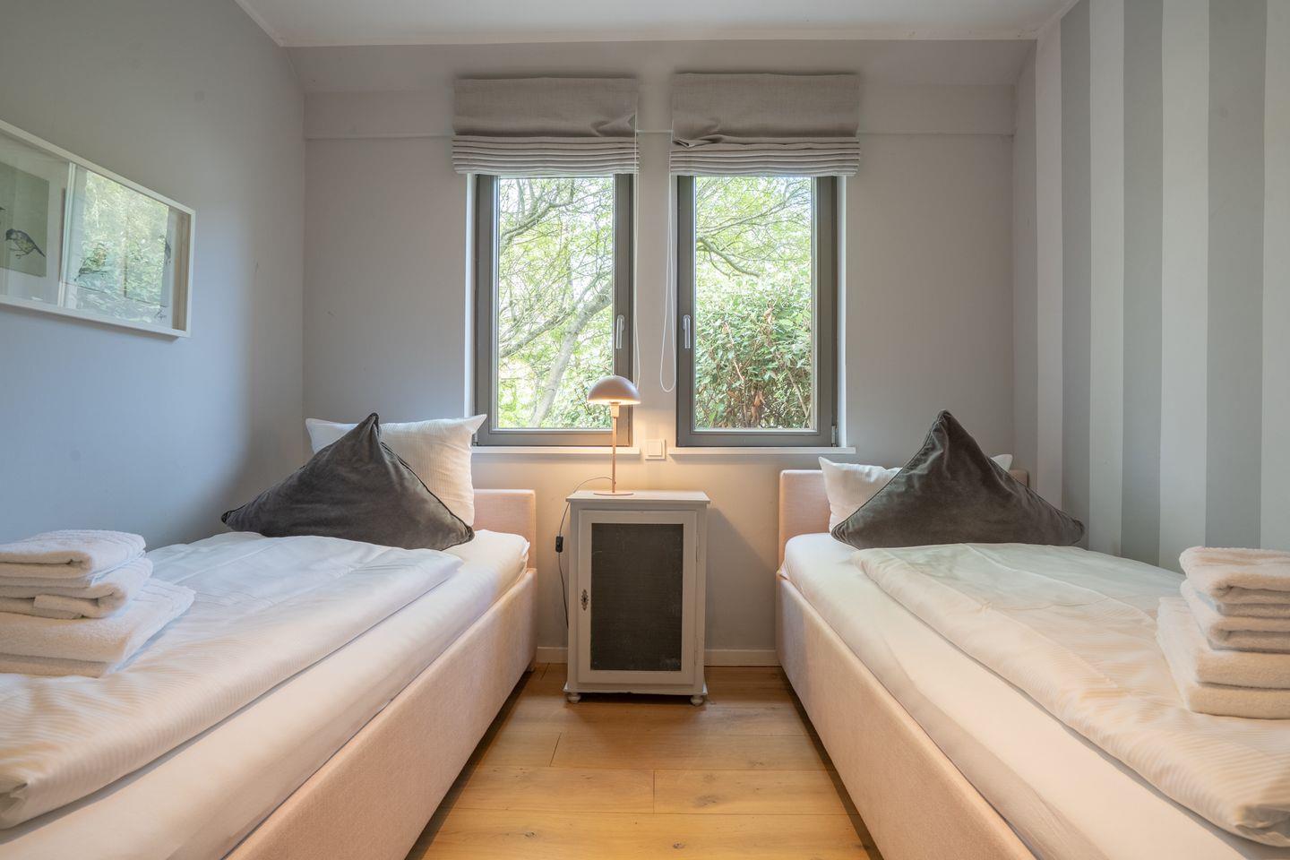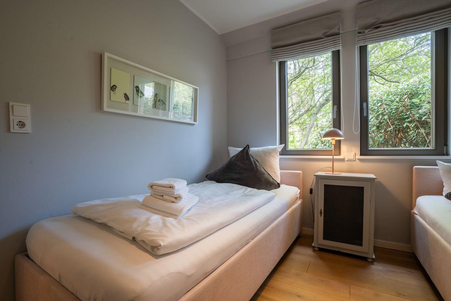Die erste Terrasse erreichen Sie direkt vom Wohn- und Essbereich aus. Sie ist mit einem großen Tisch, zwei Sitzbänken und einem Strandkorb ausgestattet – der ideale Ort, um im Grünen zu frühstücken oder den Tag entspannt ausklingen zu lassen.