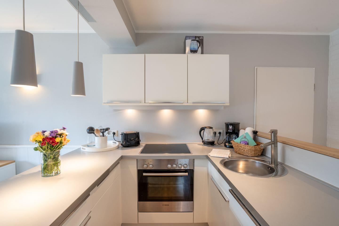 Die hochwertige Küche umfasst einen Backofen, Herd, Geschirrspüler, Kühlschrank mit Gefrierfach, Wasserkocher, Kaffeemaschine, Toaster und sämtliche Küchenutensilien, die Sie benötigen, um sich eigenständig zu versorgen.