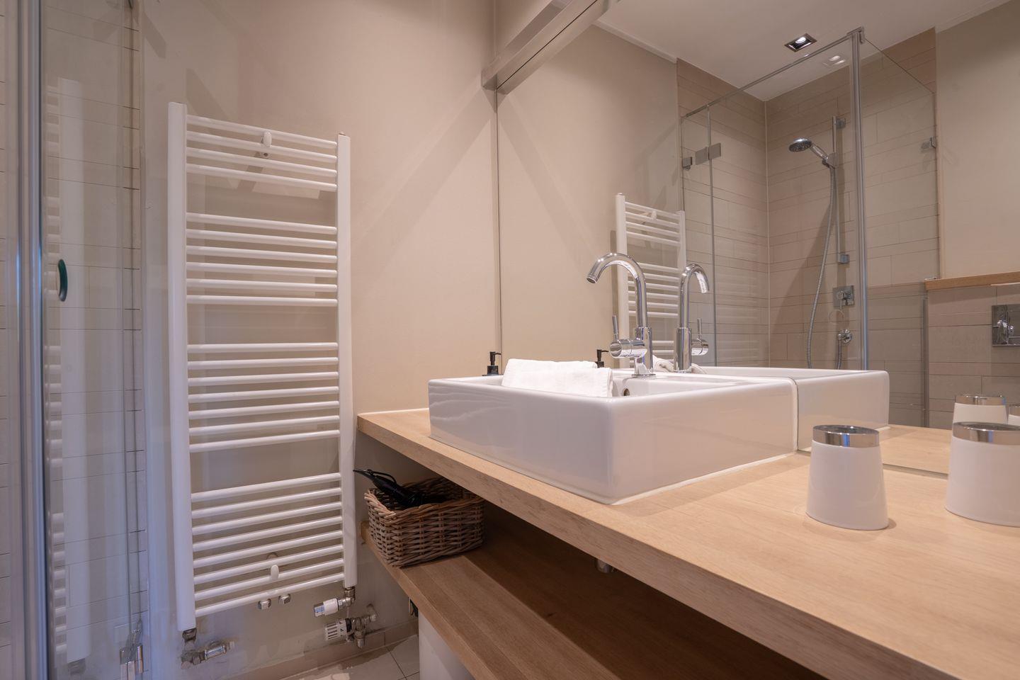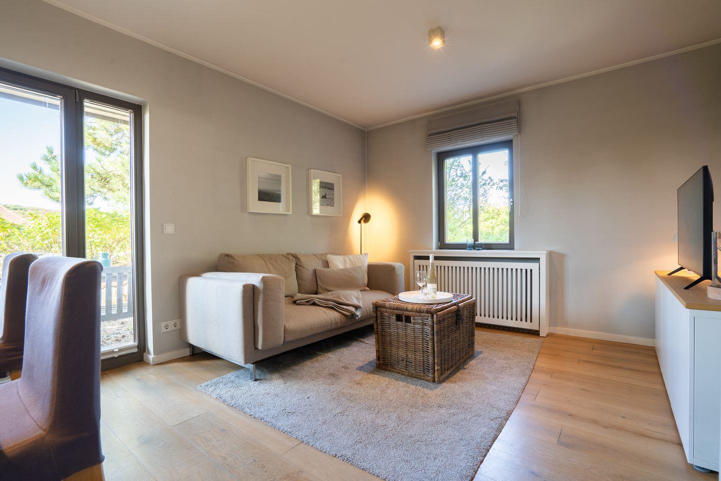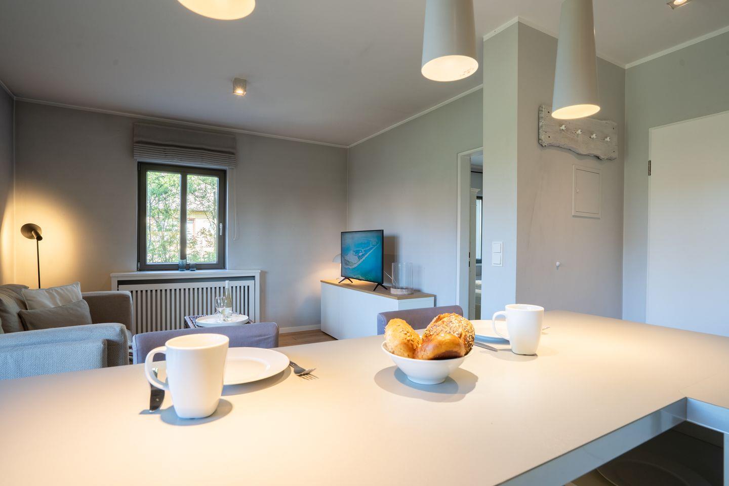 Das Appartement zeichnet sich durch eine moderne und gleichzeitig gemütliche Atmosphäre aus. Im Mittelpunkt steht ein offener Wohn- und Essbereich der zum Verweilen einlädt. Die Sofaecke ist mit einem komfortablen Sofa und einem TV ausgestattet und bietet einen idealen Rückzugsort nach einem aktiven Tag. Für gemeinsames Speisen steht ein separater Essbereich bereit.
