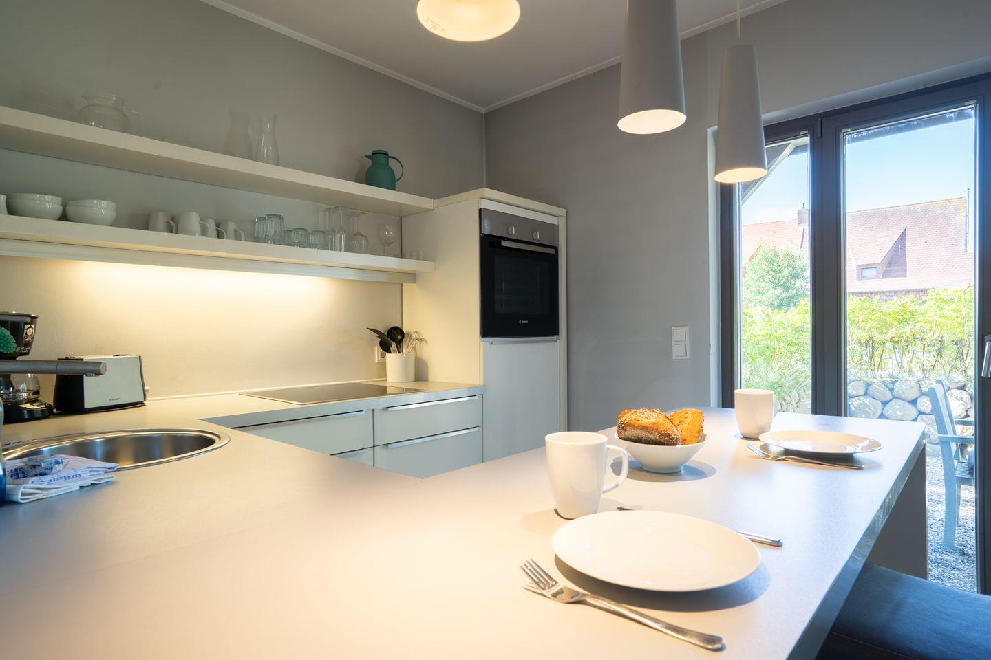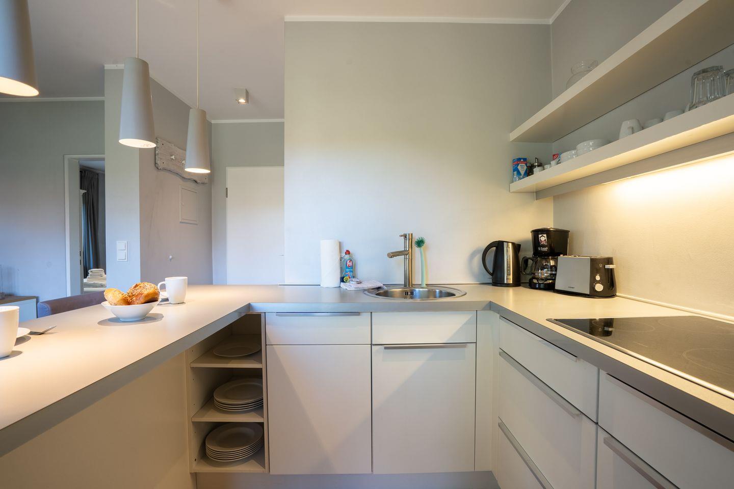 Die offene Küche ist umfassend ausgestattet: Sie finden hier einen Ceranherd, einen Backofen mit Elektroanschluss, eine Spülmaschine, Kühlschrank mit integriertem Gefrierfach, Kaffeemaschine, Toaster, Wasserkocher und sämtliche Küchenutensilien, die Sie zur Zubereitung Ihrer Mahlzeiten benötigen. Die Ausstattung ermöglicht es Ihnen, sich flexibel selbst zu versorgen.