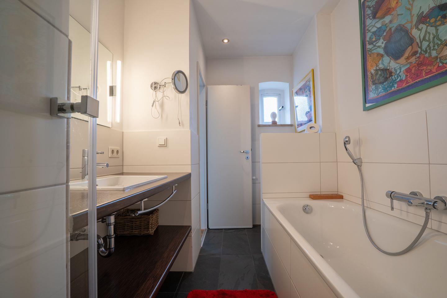 Das Badezimmer ist sowohl mit einer bodengleichen Dusche als auch mit einer Badewanne ausgestattet. Ein Fenster, Waschbecken, Spiegel, Kosmetikspiegel, Haartrockner und ein WC sorgen für einen angenehmen Komfort bei der täglichen Pflege. Dank der vorhandenen Heizung fühlen Sie sich auch an kälteren Tagen wohl.