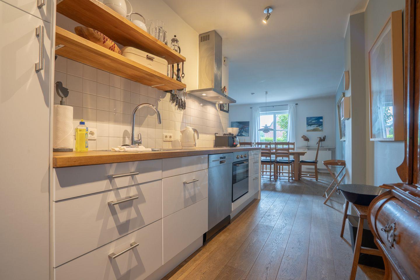 Die Wohnung erstreckt sich über insgesamt vier Zimmer, darunter ein separates Schlafzimmer. Hier finden Sie komfortable Schlafmöglichkeiten für bis zu zwei Personen, sodass ausreichend Privatsphäre und Erholung gewährleistet sind. Das helle Wohnzimmer bietet eine gemütliche Sofaecke, Sessel sowie einen Essbereich mit Esstisch und Esszimmer. Angeschlossen an den Wohnbereich befindet sich eine offen gestaltete Küche. Die umfangreiche Küchenausstattung beinhaltet einen Ceranherd, Backofen, Kühlschrank mit Gefrierfach, Spülmaschine, Espressomaschine, Kaffeemaschine, Wasserkocher, Toaster sowie sämtliche notwendigen Küchenutensilien. Damit steht Selbstversorgern alles zur Verfügung, was für ein entspanntes Kocherlebnis benötigt wird.