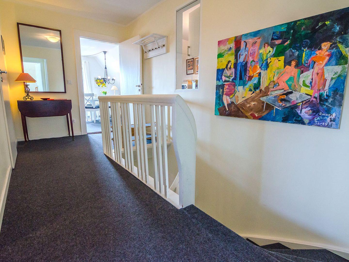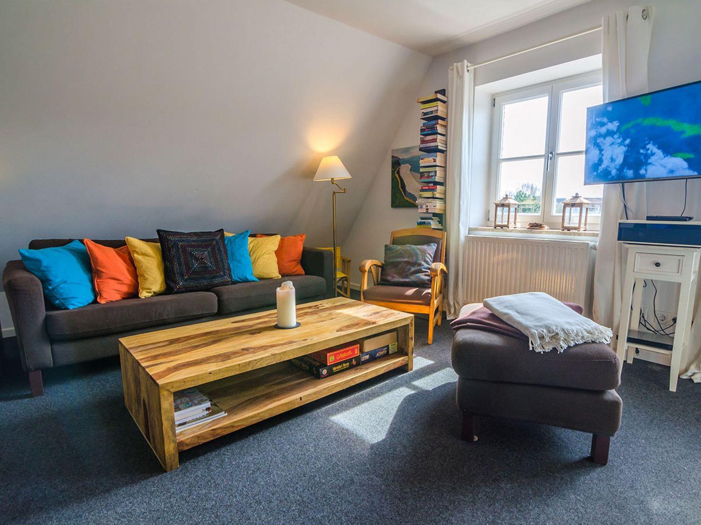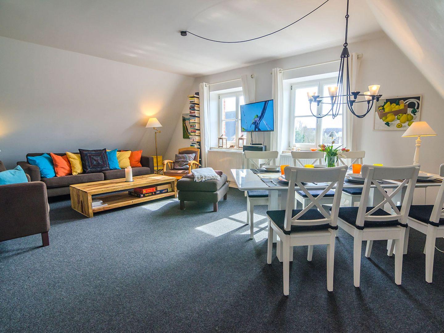 Die Ferienwohnung "Madeleines Nest OG" im ersten Stock in List bietet auf 65 m² Platz für bis zu sechs Gäste in drei Schlafzimmern. Sie verfügt über eine moderne, offene Küche mit umfangreicher Ausstattung, ein Wohn- und Esszimmer, Bad mit Dusche und Badewanne, WLAN sowie einen eigenen Parkplatz.