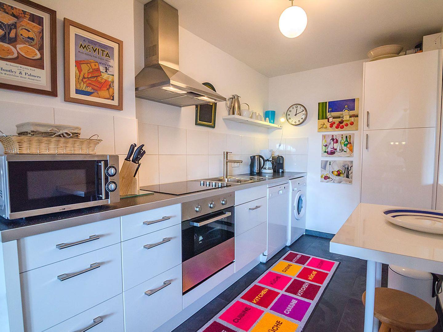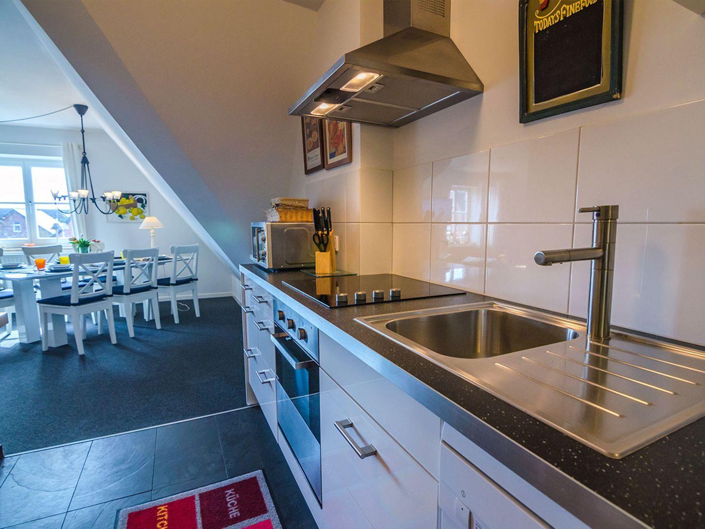 Die offene, moderne Küche ist zum Wohnzimmer hin gestaltet und lässt keine Wünsche offen. Sie ist mit einem Ceranherd, Backofen, Mikrowelle, Kühlschrank mit integriertem Gefrierfach, Spülmaschine, Wasserkocher, Kaffeemaschine, Espressomaschine sowie vielfältigen Küchenutensilien ausgestattet. Ein eigener Essbereich steht Ihnen zur Verfügung, sodass alle Gäste gemeinsam speisen und den Tag ausklingen lassen können.