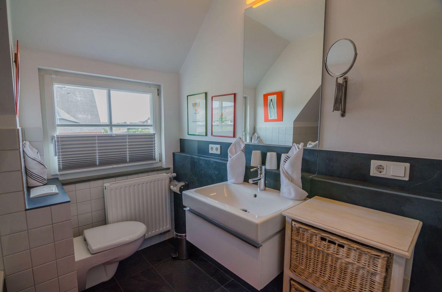 Im Badezimmer finden Sie eine Dusche, eine Badewanne, Waschbecken, WC, Spiegel, sowie einen zusätzlichen Kosmetikspiegel und ein Fenster, das für Tageslicht sorgt. Ein Haartrockner ist ebenfalls vorhanden. Die Wohnung ist zudem Nichtraucher-geeignet und auf die Bedürfnisse von Familien abgestimmt – Kinder sind ausdrücklich willkommen.