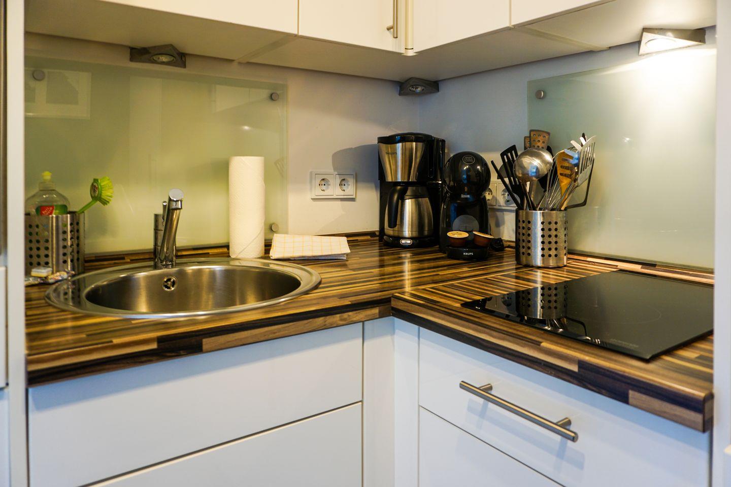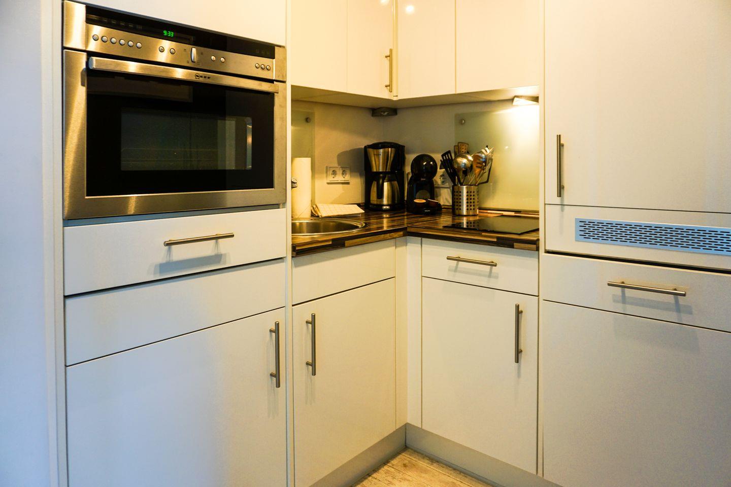 Die offene Küche, die in den Wohnraum integriert ist, ist modern ausgestattet mit Ceranherd, Backofen, Spülmaschine, Kaffeemaschine, Dolce Gusto Espressomaschine, Toaster, Mixer, Wasserkocher und vielfältigem Küchenzubehör. Damit ist die Selbstversorgung jederzeit problemlos möglich.