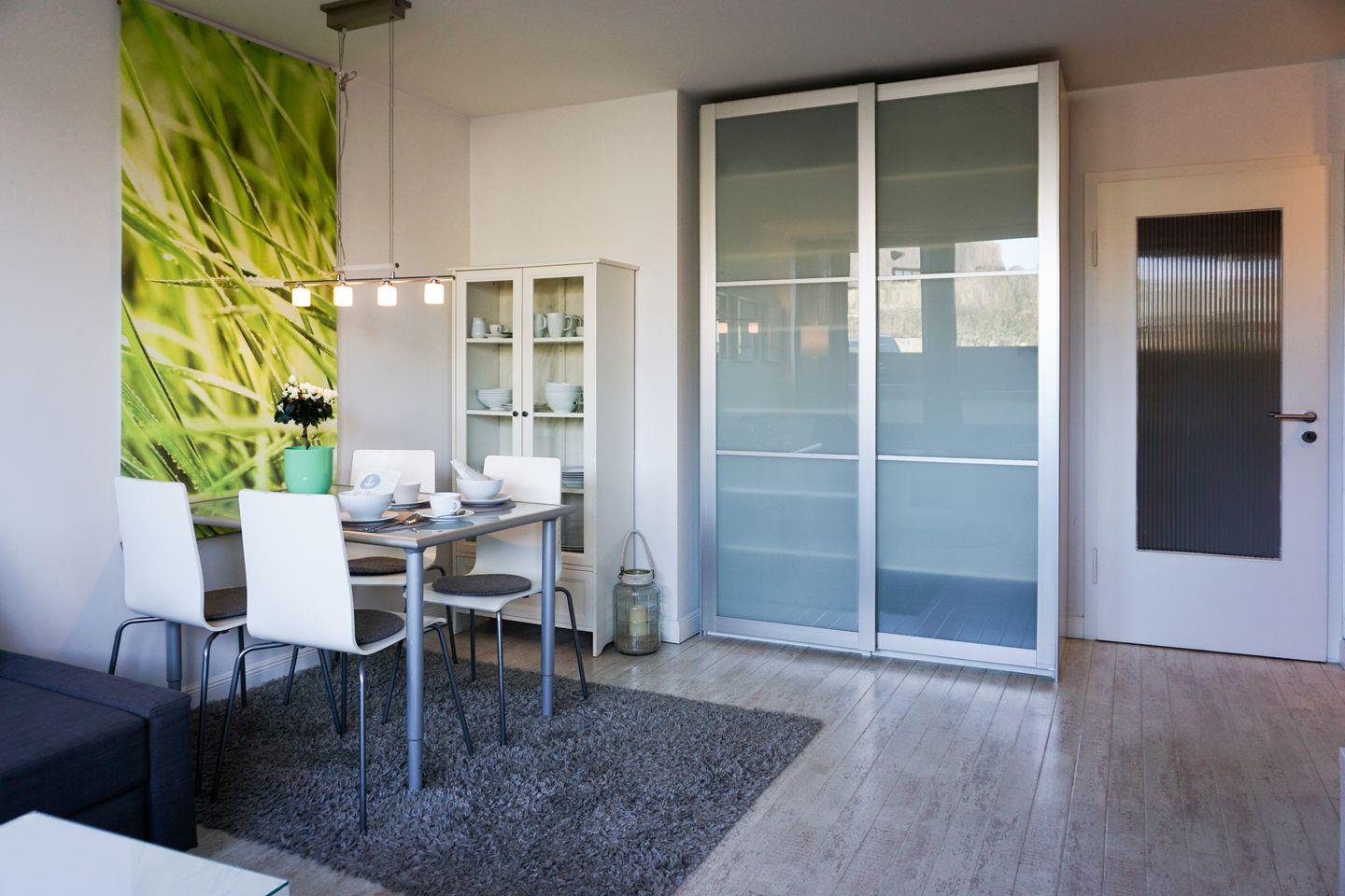 Die Ferienwohnung verfügt über zwei Zimmer, darunter ein separates Schlafzimmer, das sich ebenso wie das Wohnzimmer freundlich und hell präsentiert. Im Wohnbereich lädt eine gemütliche Sofaecke zum Verweilen ein, während der angrenzende Essbereich mit Esstisch ideale Voraussetzungen für gemeinsame Mahlzeiten bietet. Ein digitaler TV sowie WLAN und Internet stehen zur Unterhaltung und Kommunikation bereit. Für einen längeren Aufenthalt oder bei Bedarf ist eine eigene Waschmaschine vorhanden, ergänzt durch Bügeleisen, Bügelbrett, Staubsauger und Wäscheständer – ideale Bedingungen also auch für Familien.