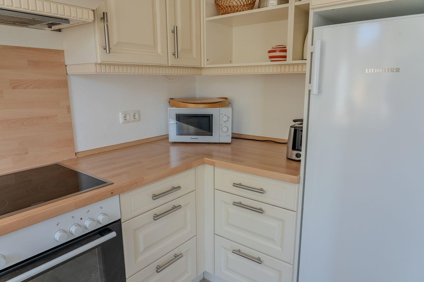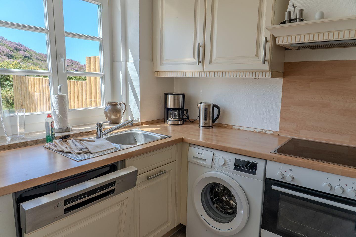 Die bestens ausgestattete, offene Küche grenzt direkt an den Wohnbereich und verfügt über moderne Annehmlichkeiten: Ceranherd, Elektro-Backofen, Kühlschrank mit Gefrierfach, Spülmaschine, Mikrowelle, Kaffeemaschine, Toaster, Wasserkocher und sogar einen Mixer. Geschirr, Besteck und Küchenutensilien stehen Ihnen in vollem Umfang zur Verfügung. Ein Esstisch für acht Personen ermöglicht gesellige Abende.