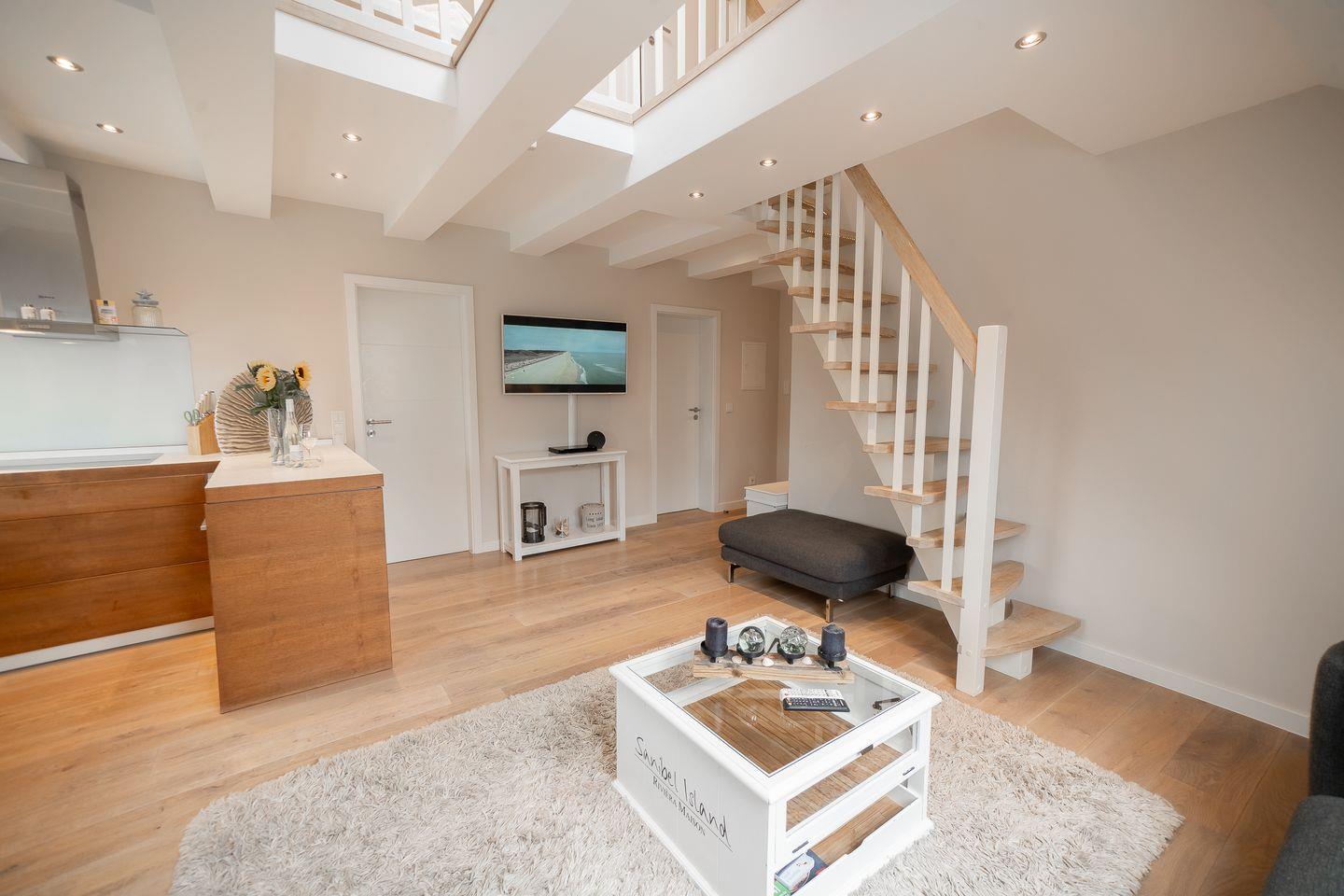 Die Wohnung verfügt über zwei separate Schlafzimmer mit einem pflegeleichten Laminatboden, die insgesamt Platz für vier Personen bieten. Auch im Wohnbereich wurde Wert auf einen sauberen Laminatboden gelegt. Das Appartement verteilt sich auf zwei Etagen, wobei sich die gesamte Wohnfläche im ersten Stock befindet. Der offene Wohn-Essbereich ist modern und funktional gestaltet und bietet ein großzügiges Sofa, einen Esstisch sowie eine Garderobe.