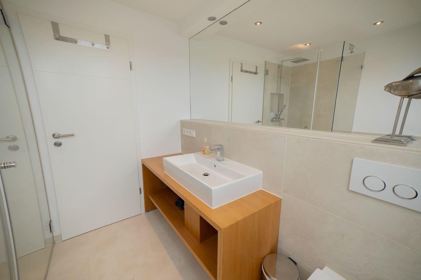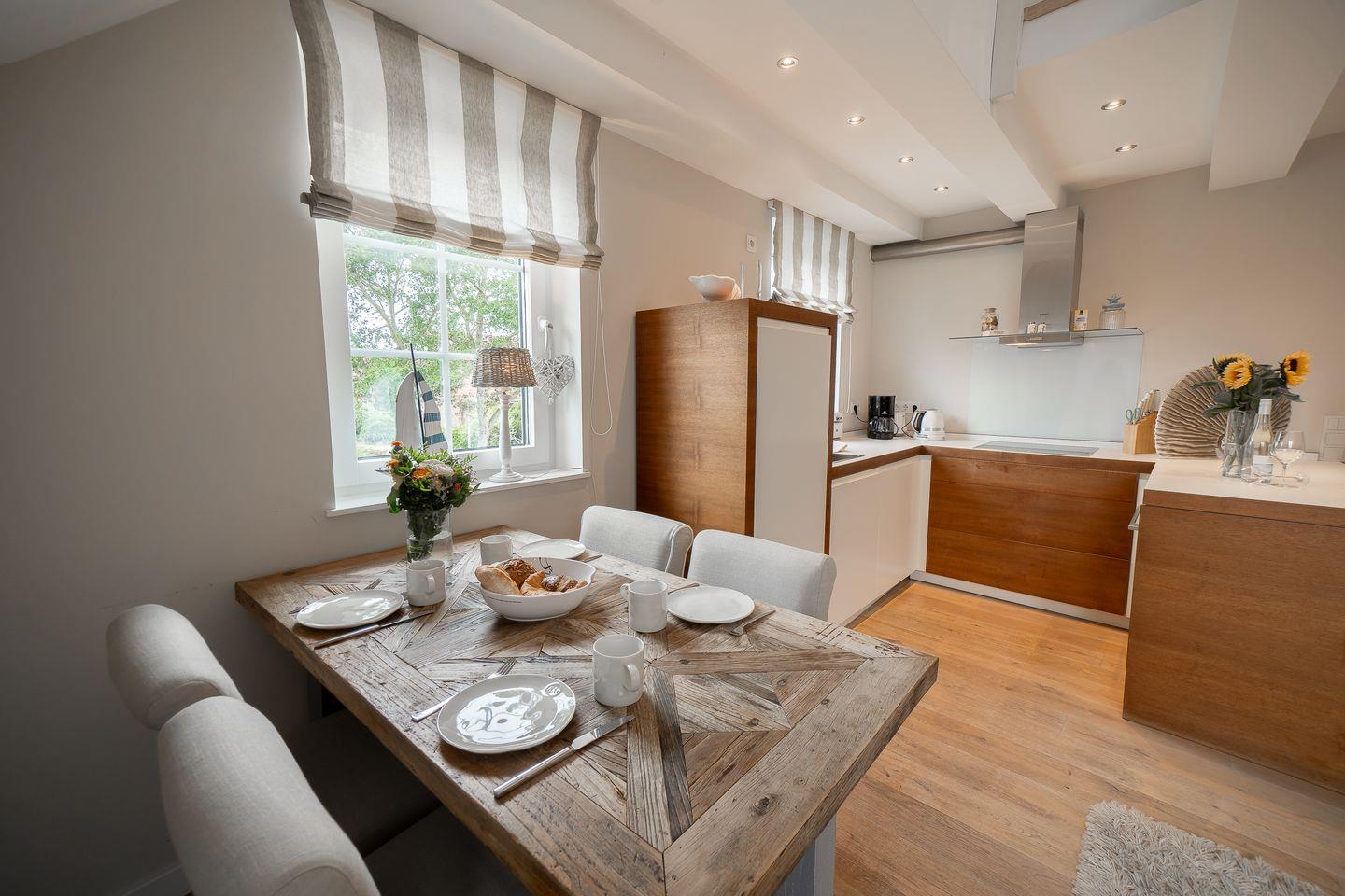 In der vollständig ausgestatteten, offen zum Wohnzimmer angeordneten Küche finden Sie moderne Geräte wie einen Induktionsherd mit Backofen (Elektroanschluss), eine Spülmaschine, einen Kühlschrank mit Gefrierfach, einen Wasserkocher, eine Kaffeemaschine, Toaster sowie umfassendes Geschirr und Besteck. Alle Küchenutensilien sind für einen entspannten Aufenthalt vorhanden. Für Ihren Komfort steht Ihnen ein modernes Badezimmer zur Verfügung, das mit einer bodengleichen Dusche sowie einer separaten Badewanne ausgestattet ist. Ein Haartrockner sowie ein Spiegel gehören ebenso zur Ausstattung.