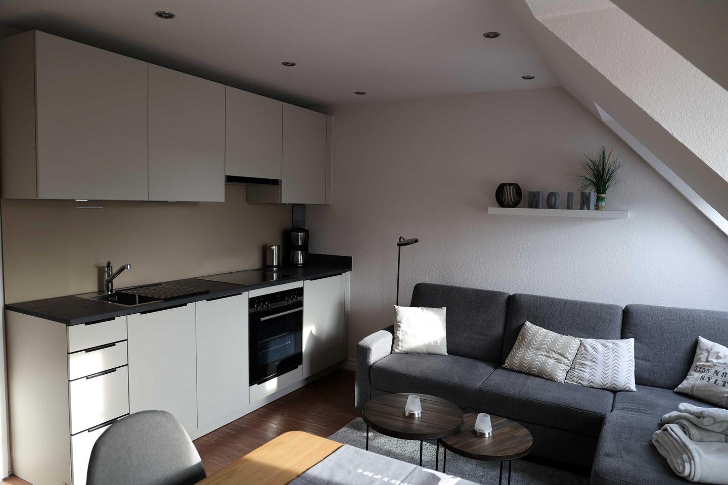 Die Wohnung verfügt über insgesamt drei Zimmer, darunter zwei separate Schlafzimmer. Der lichtdurchflutete Wohnbereich ist mit einer gemütlichen Sofaecke ausgestattet, die zu entspannten Abenden einlädt. Vom Wohnbereich aus haben Sie Zugang zum Balkon, der mit Gartenmöbeln bestückt ist – ideal, um die frische Nordseeluft zu genießen oder einen Tag entspannt ausklingen zu lassen. Der offene Essbereich mit Esstisch schafft eine kommunikative Verbindung zwischen Wohn- und Kochbereich.