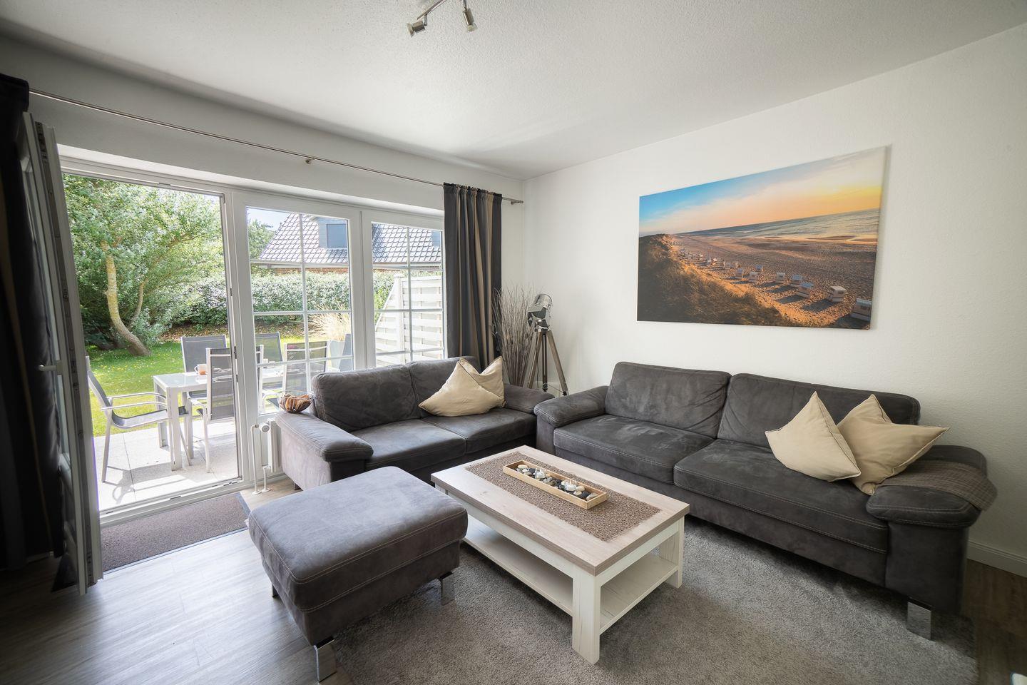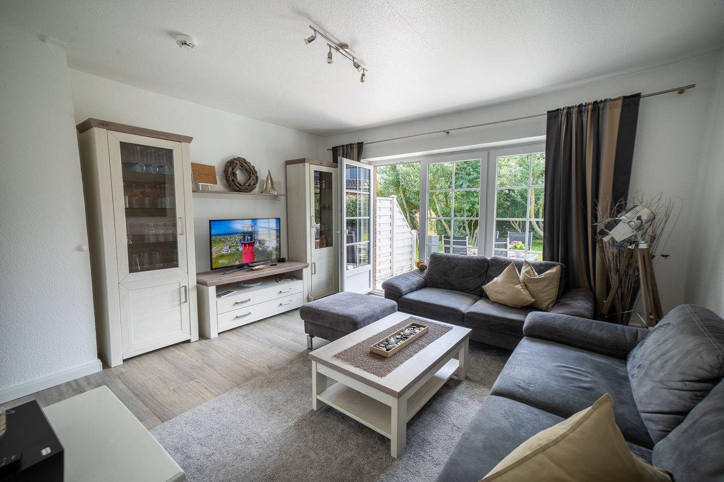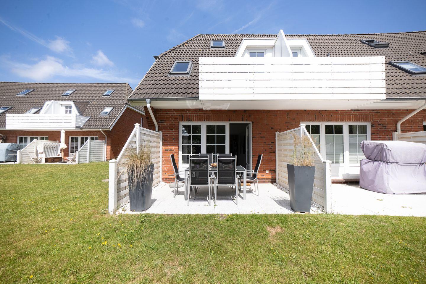 Ihr privater, möblierter Terrassenbereich mit Gartenblick lädt zum Verweilen ein und bietet dank Gartenmöbeln die Möglichkeit, die frische Nordseeluft zu genießen.