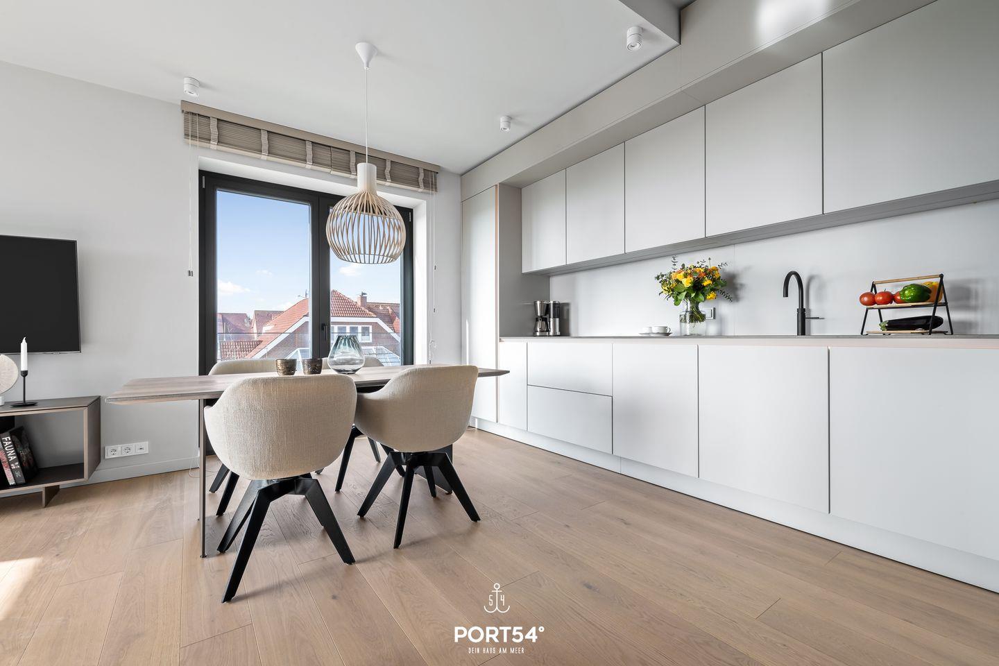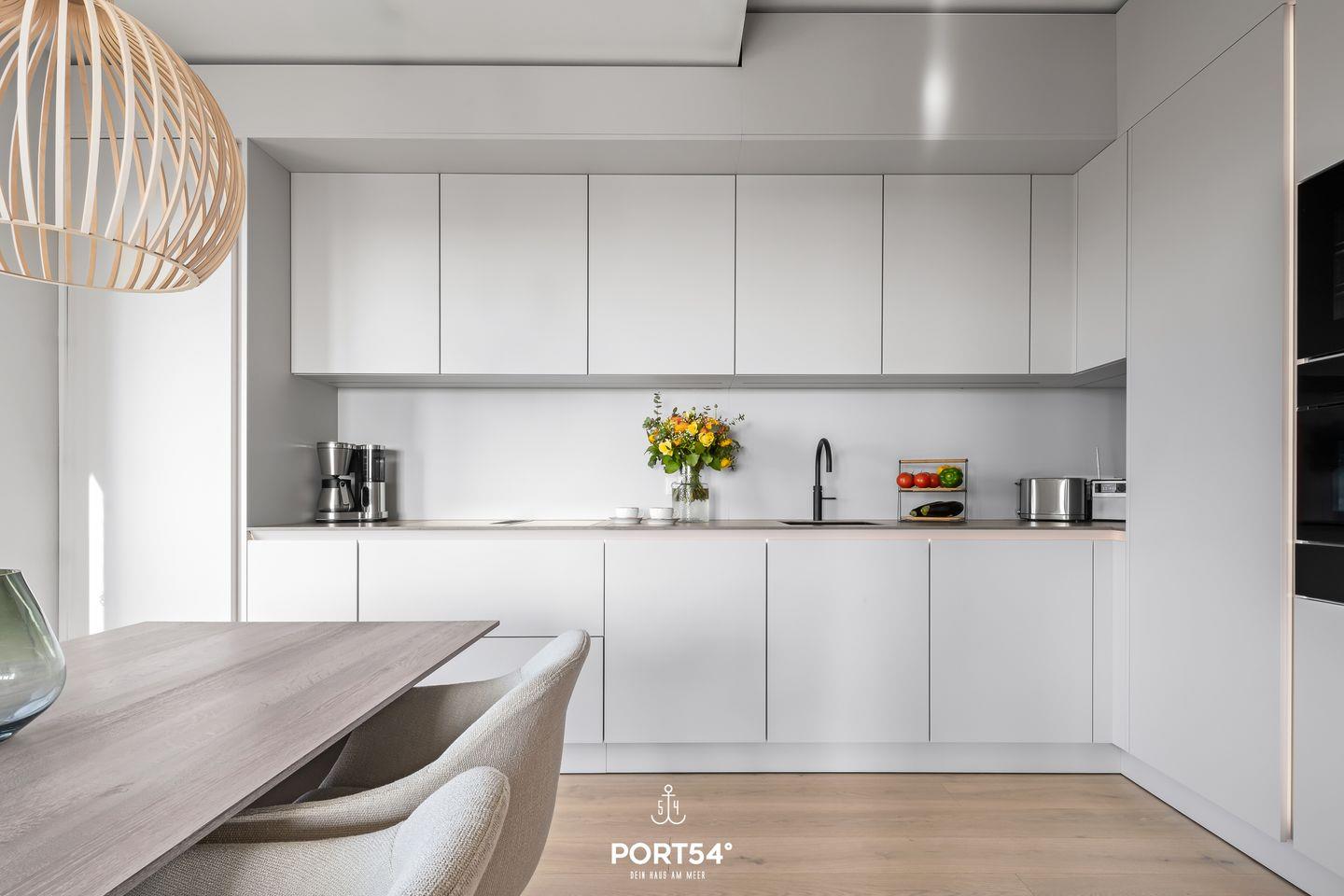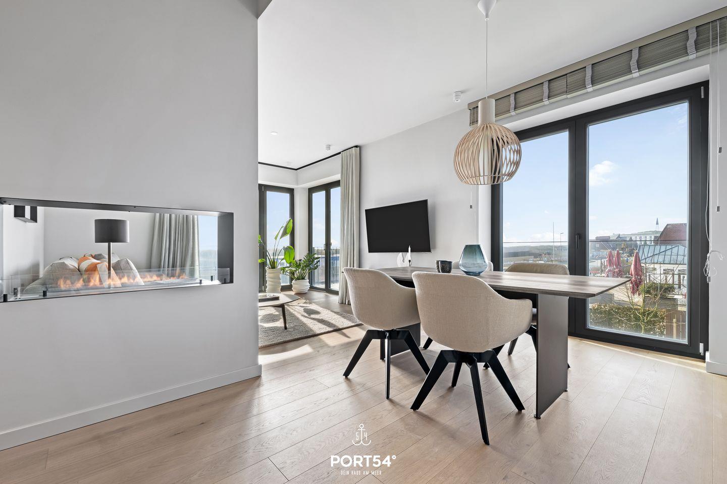 Die Wohnung verfügt über zwei stilvolle Schlafzimmer, die zum Entspannen und Erholen einladen. In einem der beiden ist ein Doppelboxspringbett der Marke Schramm (180x200cm), während im anderen Schlafzimmer ein Schlafsofa (160x200cm) für dich zur Verfügung steht. Ein modernes Badezimmer mit einer bodengleichen Dusche bietet zusätzlichen Komfort und Luxus während deines Aufenthalts. Das Herzstück der Oceanview Suite ist der großzügige Wohnbereich, der offen zur voll ausgestatteten SieMatic-Küche gestaltet ist. Hier findest du alles, was du für die Zubereitung deiner Mahlzeiten benötigst, einschließlich eines Induktionsherds, Backofens, Geschirrspülers und Weinkühlschranks. Außerdem findest du in der Küche einen Quooker, mit dem du problemlos heißes Wasser sowie Sprudelwasser erzeugen kannst. Der Essbereich bietet Platz für ein gemeinsames Essen und blickt auf den gemütlichen Wohnraum mit einem offenen Ethanol-Kamin, der für eine behagliche Atmosphäre sorgt.