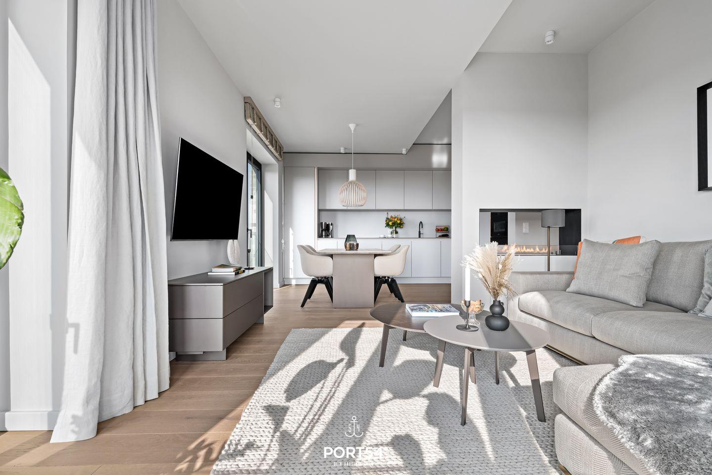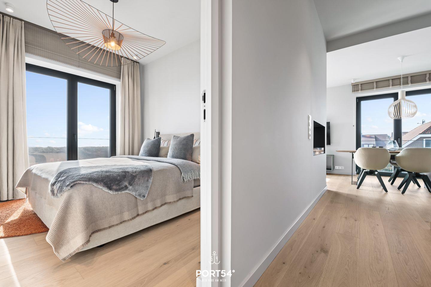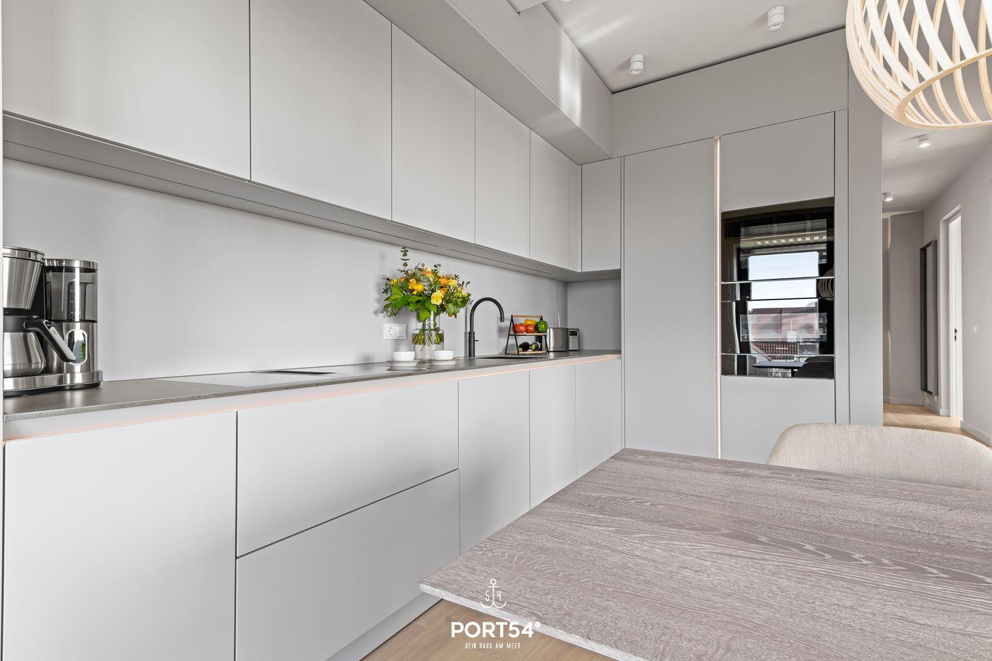 Die Wohnung verfügt über zwei stilvolle Schlafzimmer, die zum Entspannen und Erholen einladen. In einem der beiden ist ein Doppelboxspringbett der Marke Schramm (180x200cm), während im anderen Schlafzimmer ein Schlafsofa (160x200cm) für dich zur Verfügung steht. Ein modernes Badezimmer mit einer bodengleichen Dusche bietet zusätzlichen Komfort und Luxus während deines Aufenthalts. Das Herzstück der Oceanview Suite ist der großzügige Wohnbereich, der offen zur voll ausgestatteten SieMatic-Küche gestaltet ist. Hier findest du alles, was du für die Zubereitung deiner Mahlzeiten benötigst, einschließlich eines Induktionsherds, Backofens, Geschirrspülers und Weinkühlschranks. Außerdem findest du in der Küche einen Quooker, mit dem du problemlos heißes Wasser sowie Sprudelwasser erzeugen kannst. Der Essbereich bietet Platz für ein gemeinsames Essen und blickt auf den gemütlichen Wohnraum mit einem offenen Ethanol-Kamin, der für eine behagliche Atmosphäre sorgt.