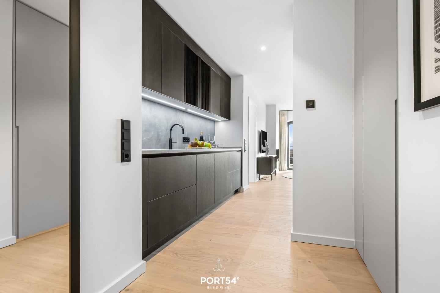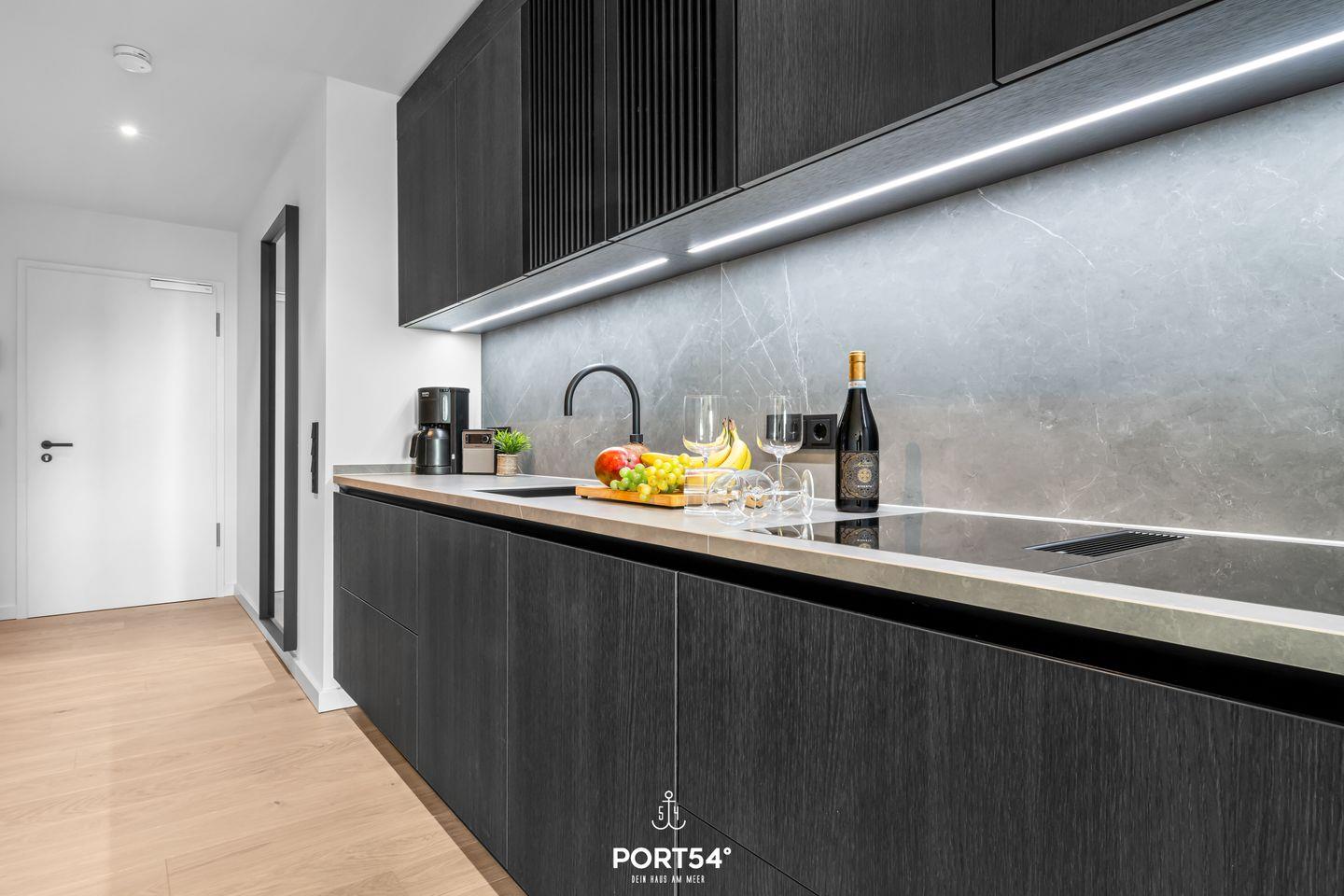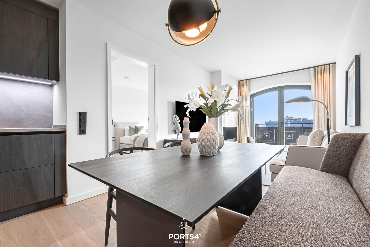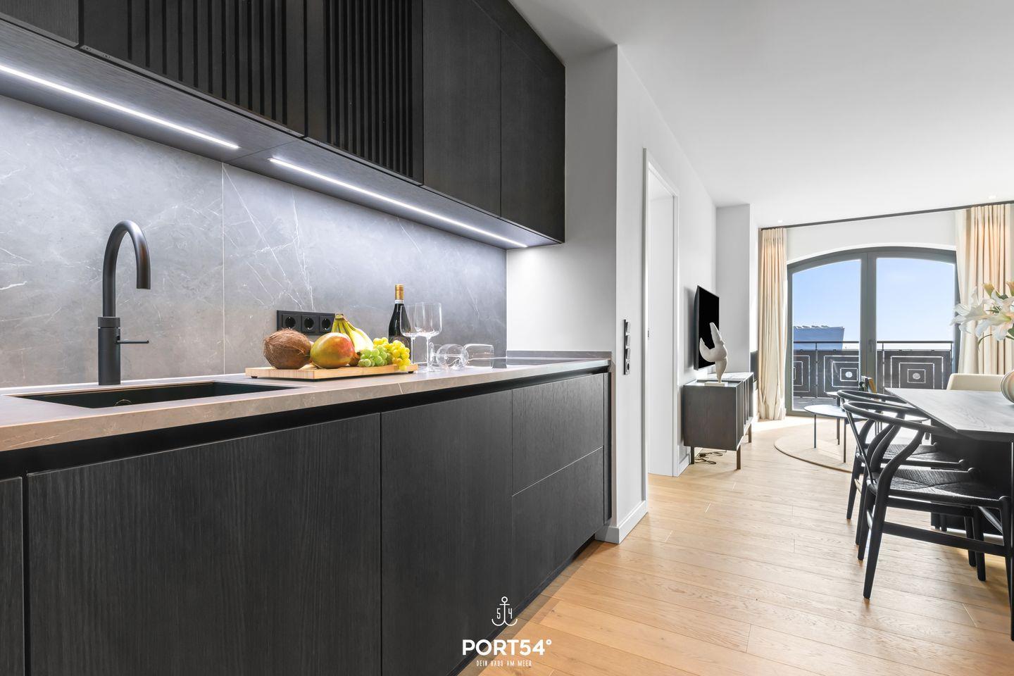 Die Ferienwohnung befindet sich im zweiten Stock und ist bequem über einen Aufzug erreichbar. Ein großzügiger Wohnraum mit einer offenen Küche von SieMatic lädt dazu ein, kulinarische Köstlichkeiten zuzubereiten und gesellige Abende zu verbringen. Die hochmodernen Küchengeräte, einschließlich einer Spülmaschine, Elektrobackofen und einem Quooker, damit lässt sich problemlos heißes Wasser sowie Sprudelwasser erzeugen, lassen keine Wünsche offen und ermöglichen es dir, dich wie zu Hause zu fühlen. Der Esstisch bietet genügend Platz, um gemeinsam zu speisen und schöne Erinnerungen zu schaffen.