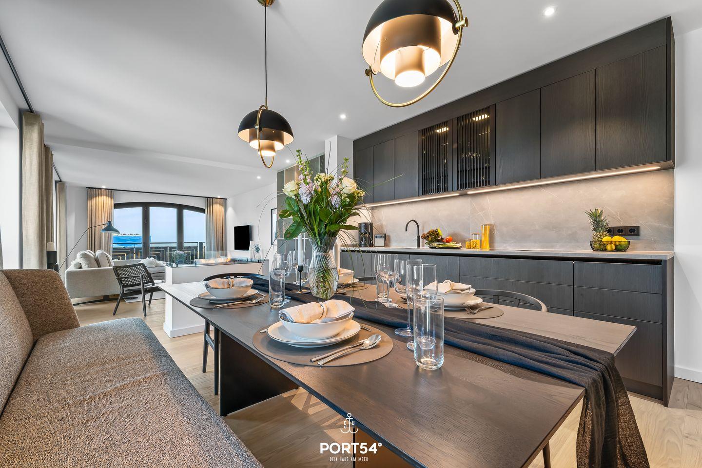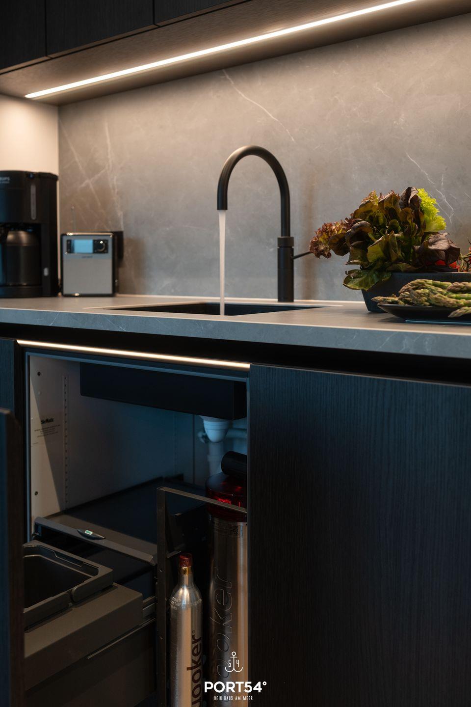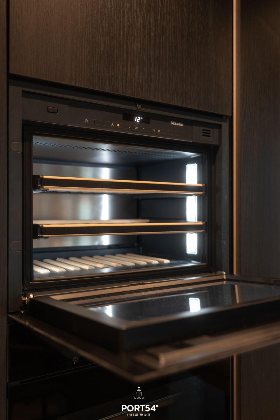 Der Wohnbereich ist ideal, um nach einem erlebnisreichen Tag zu entspannen. Ein gemütliches Sofa, ausgestattet mit einem offenen Ethanol-Kamin, lädt dazu ein, es sich mit einem guten Buch oder einem Film gemütlich zu machen. Von hier aus hast du direkten Zugang zu deinem eigenen Balkon, wo du den Blick auf die umliegende Landschaft oder einen romantischen Sonnenuntergang genießen kannst. Gartenmöbel stehen dir zur Verfügung, sodass du im Freien verweilen und die frische Nordseeluft genießen kannst.