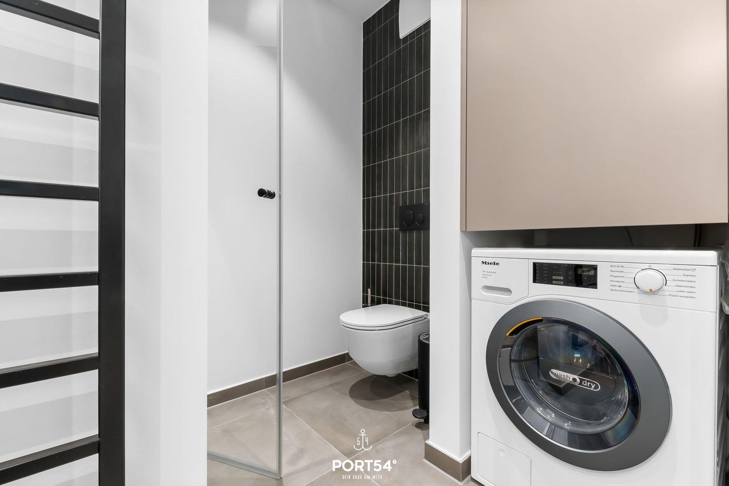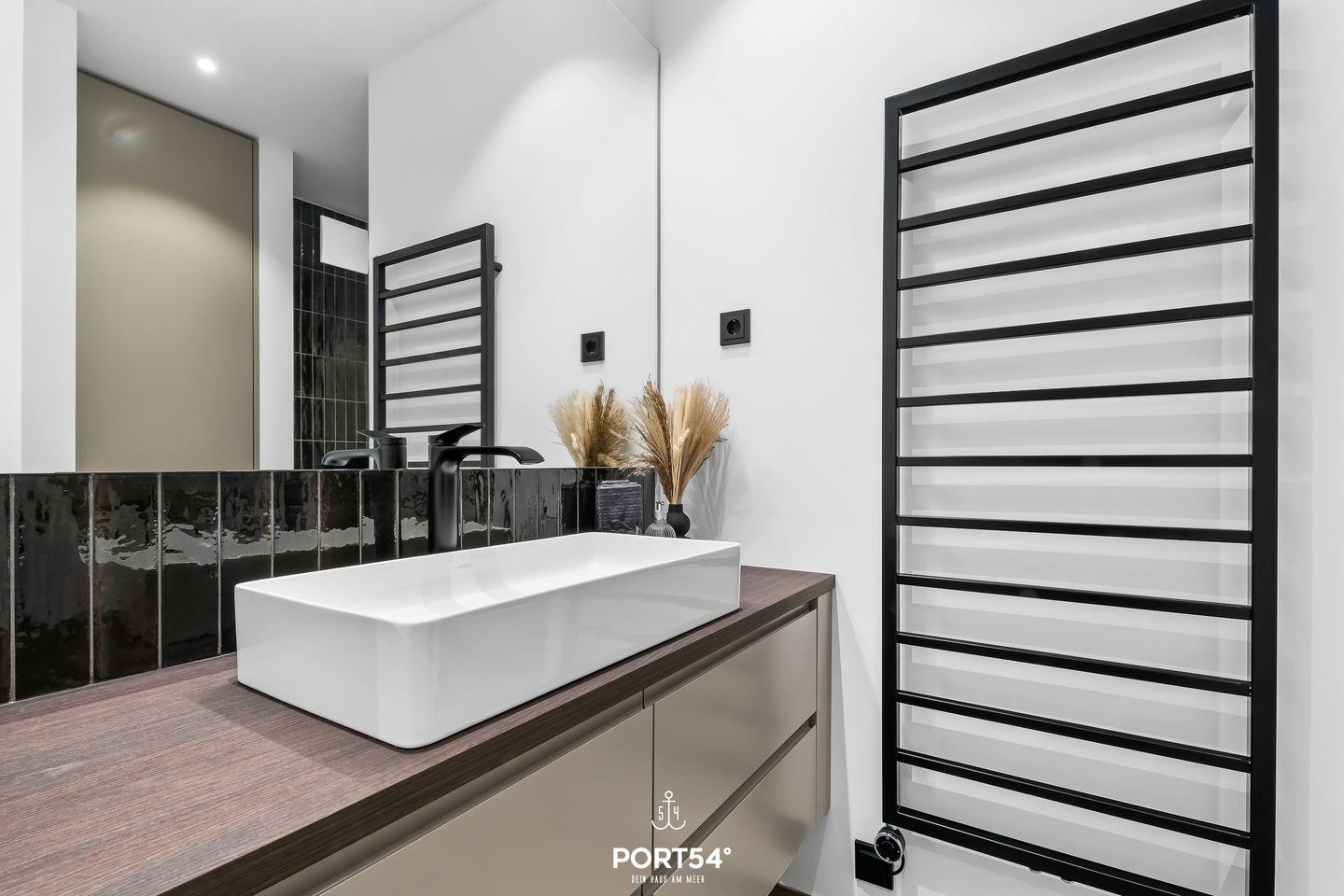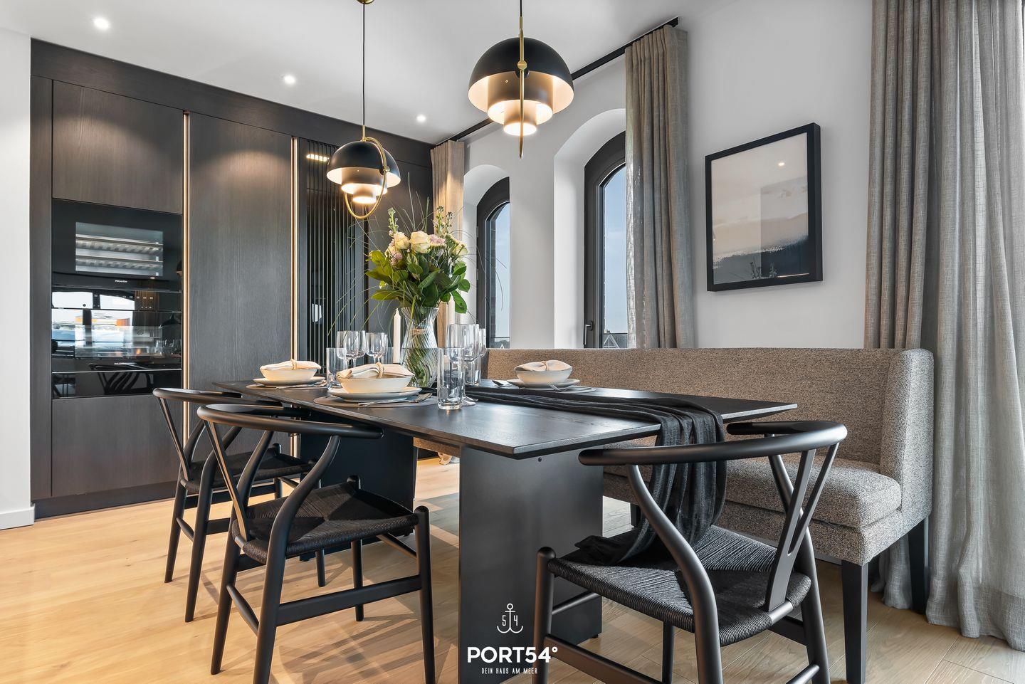 Der Wohnbereich ist ideal, um nach einem erlebnisreichen Tag zu entspannen. Ein gemütliches Sofa, ausgestattet mit einem offenen Ethanol-Kamin, lädt dazu ein, es sich mit einem guten Buch oder einem Film gemütlich zu machen. Von hier aus hast du direkten Zugang zu deinem eigenen Balkon, wo du den Blick auf die umliegende Landschaft oder einen romantischen Sonnenuntergang genießen kannst. Gartenmöbel stehen dir zur Verfügung, sodass du im Freien verweilen und die frische Nordseeluft genießen kannst.