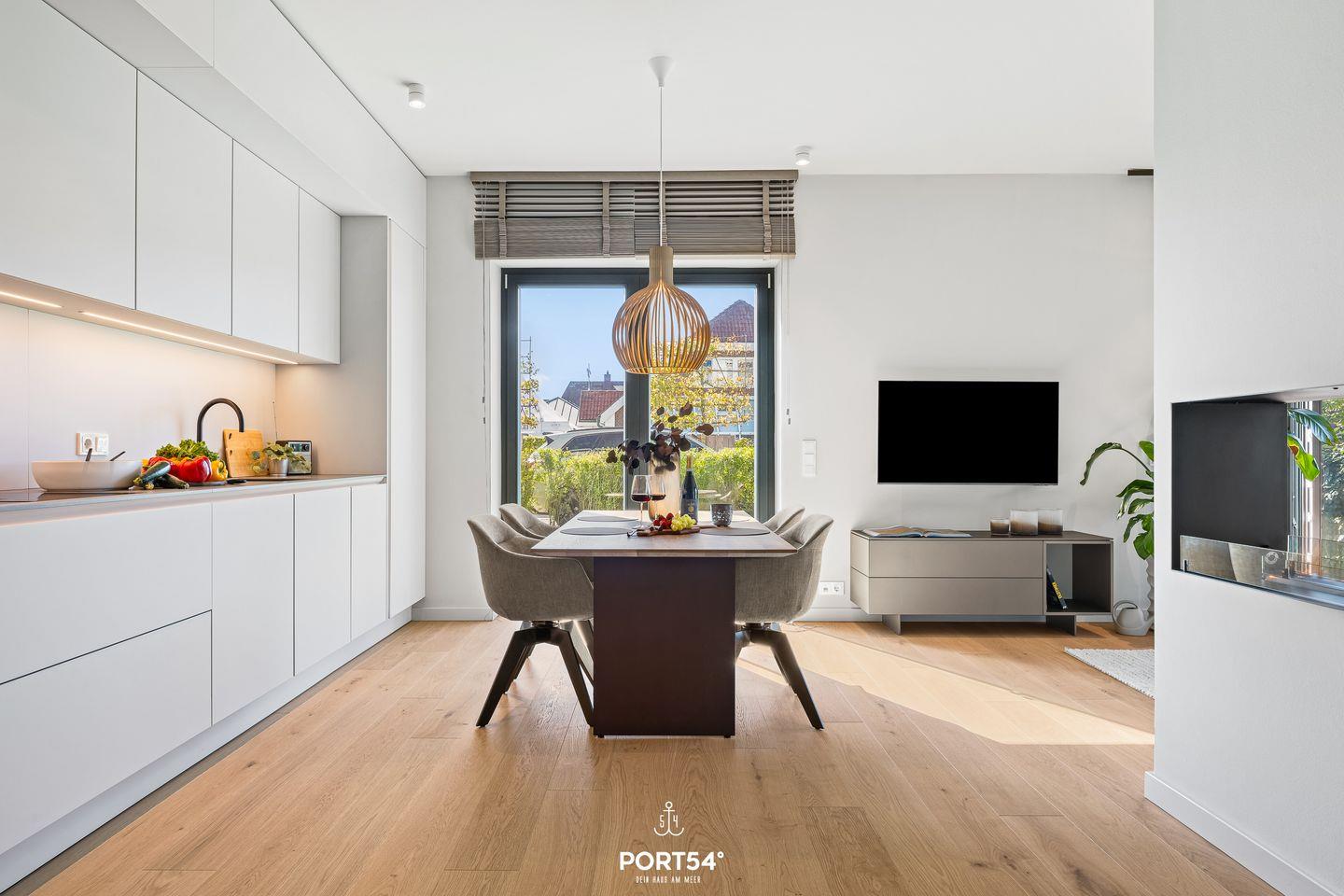 Mit zwei gemütlichen Schlafzimmern, eins ausgestattet mit einem Doppelboxspringbett der Marke Schramm (180x200cm), das andere mit einem Schlafsofa (160x200cm), einem stilvollen Wohnzimmer und einer offenen Küche erlebst du hier ein harmonisches Wohngefühl. Die offenen Räume schaffen eine einladende Atmosphäre, während der Essbereich ideal für gesellige Abende mit Freunden oder der Familie ist. Genieße die Vorteile einer tollen SieMatic-Küche, die mit einem Induktionsherd, Backofen, Geschirrspüler und Weinkühlschrank ausgestattet ist. Außerdem findest du in der Küche einen Quooker, mit dem sich problemlos heißes Wasser sowie Sprudelwasser erzeugen lässt.