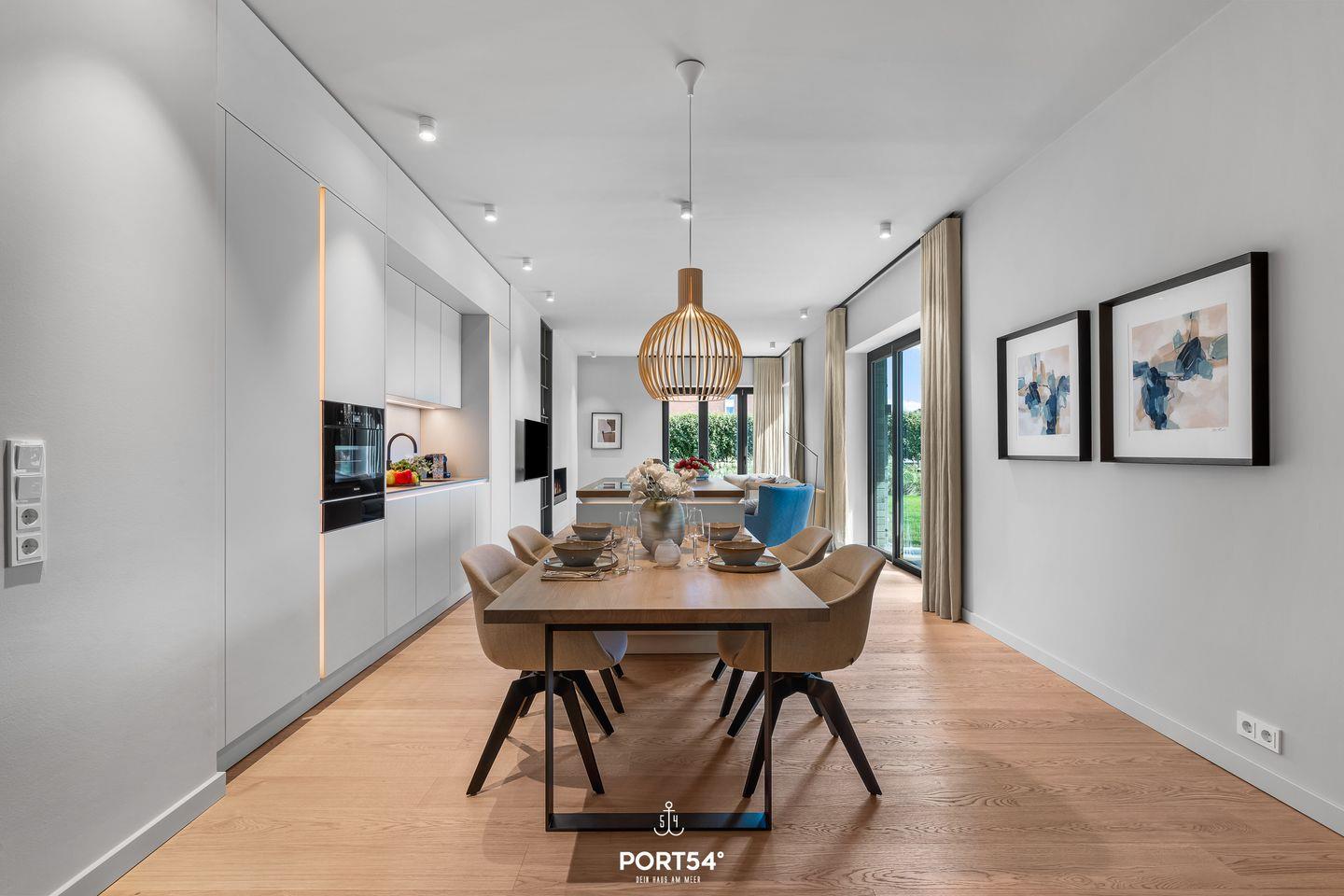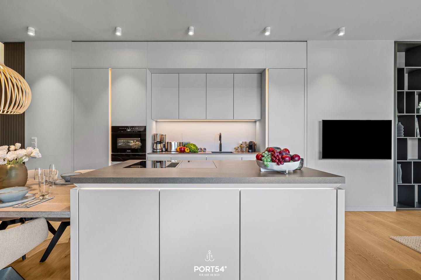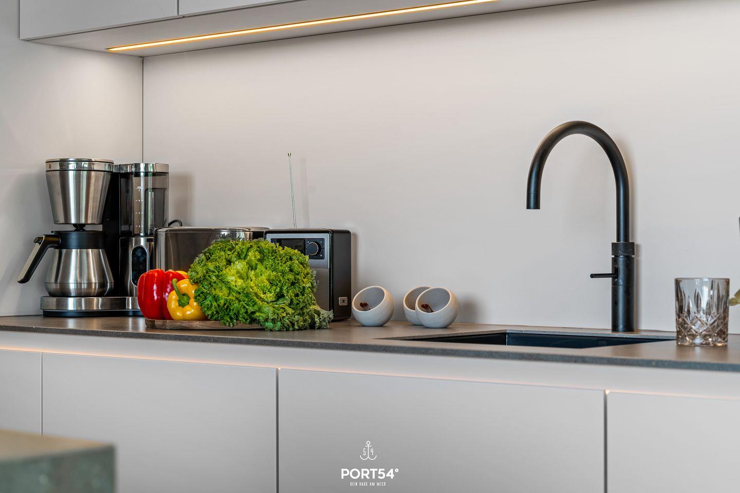 Ein offener Wohnbereich mit großzügiger Sofaecke, Ethanol-Kamin und Esstisch lädt zum Verweilen ein und bietet einen perfekten Ort für gesellige Abende. Die voll ausgestattete offene Küche von SieMatic punktet mit modernen Geräten wie einem Induktionsherd, Backofen, Kühlschrank, Spülmaschine und einem Weinkühlschrank. Hier kannst du kreative Gerichte zubereiten oder einfach das Frühstück auf der Terrasse genießen, während du die frische Meeresbrise einatmest. Außerdem findest du in der Küche einen Quooker, mit dem du problemlos heißes Wasser sowie Sprudelwasser erzeugen kannst.