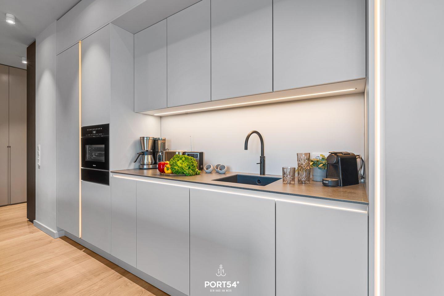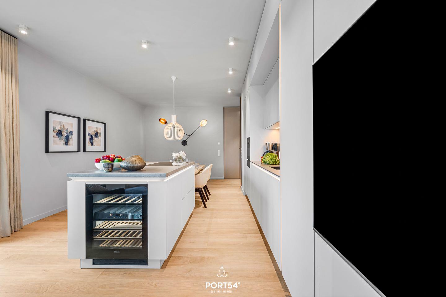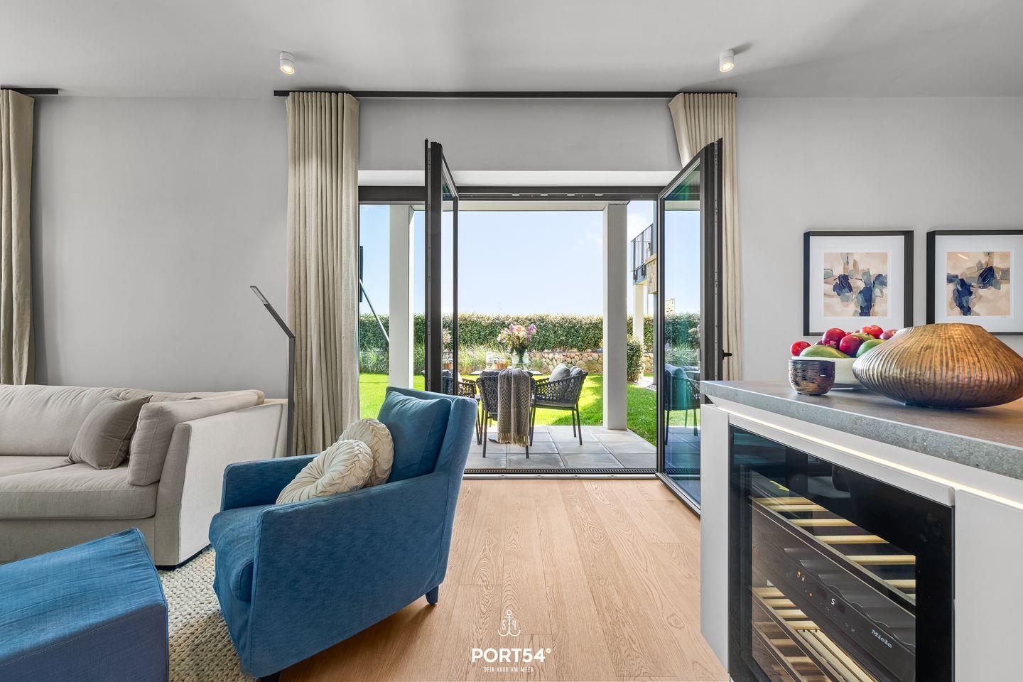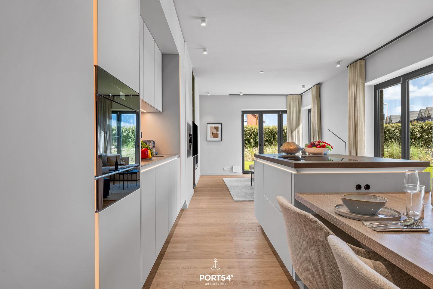 Ein offener Wohnbereich mit großzügiger Sofaecke, Ethanol-Kamin und Esstisch lädt zum Verweilen ein und bietet einen perfekten Ort für gesellige Abende. Die voll ausgestattete offene Küche von SieMatic punktet mit modernen Geräten wie einem Induktionsherd, Backofen, Kühlschrank, Spülmaschine und einem Weinkühlschrank. Hier kannst du kreative Gerichte zubereiten oder einfach das Frühstück auf der Terrasse genießen, während du die frische Meeresbrise einatmest. Außerdem findest du in der Küche einen Quooker, mit dem du problemlos heißes Wasser sowie Sprudelwasser erzeugen kannst.