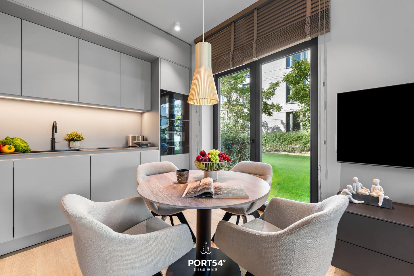 Herzstück der Wohnung ist der offene Wohnbereich, der hell und einladend ist. Die moderne Küche von SieMatic ist mit einem Induktionsherd, Backofen, Wärmeschublade und einem Geschirrspüler voll ausgestattet. Außerdem findest du in der Küche einen Quooker, mit dem sich problemlos heißes Wasser sowie Sprudelwasser erzeugen lassen. Für gemütliche Abende steht dir ein bequemer Sofabereich zur Verfügung, um die Zeit gemeinsam zu verbringen oder einen Film auf dem Smart-TV zu genießen.